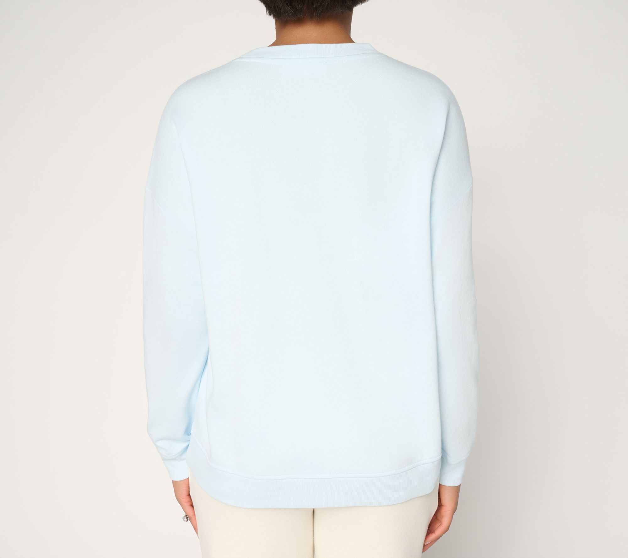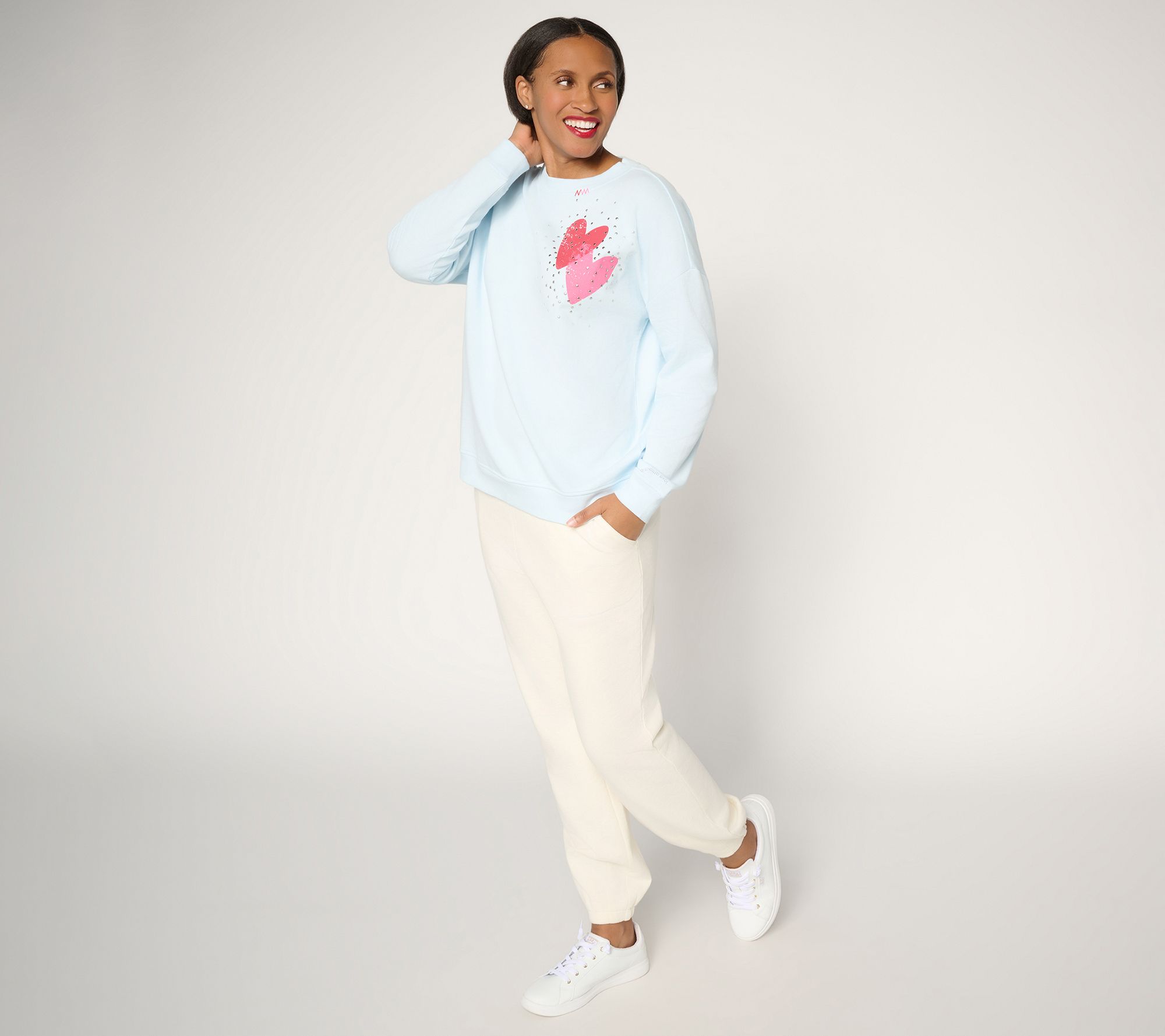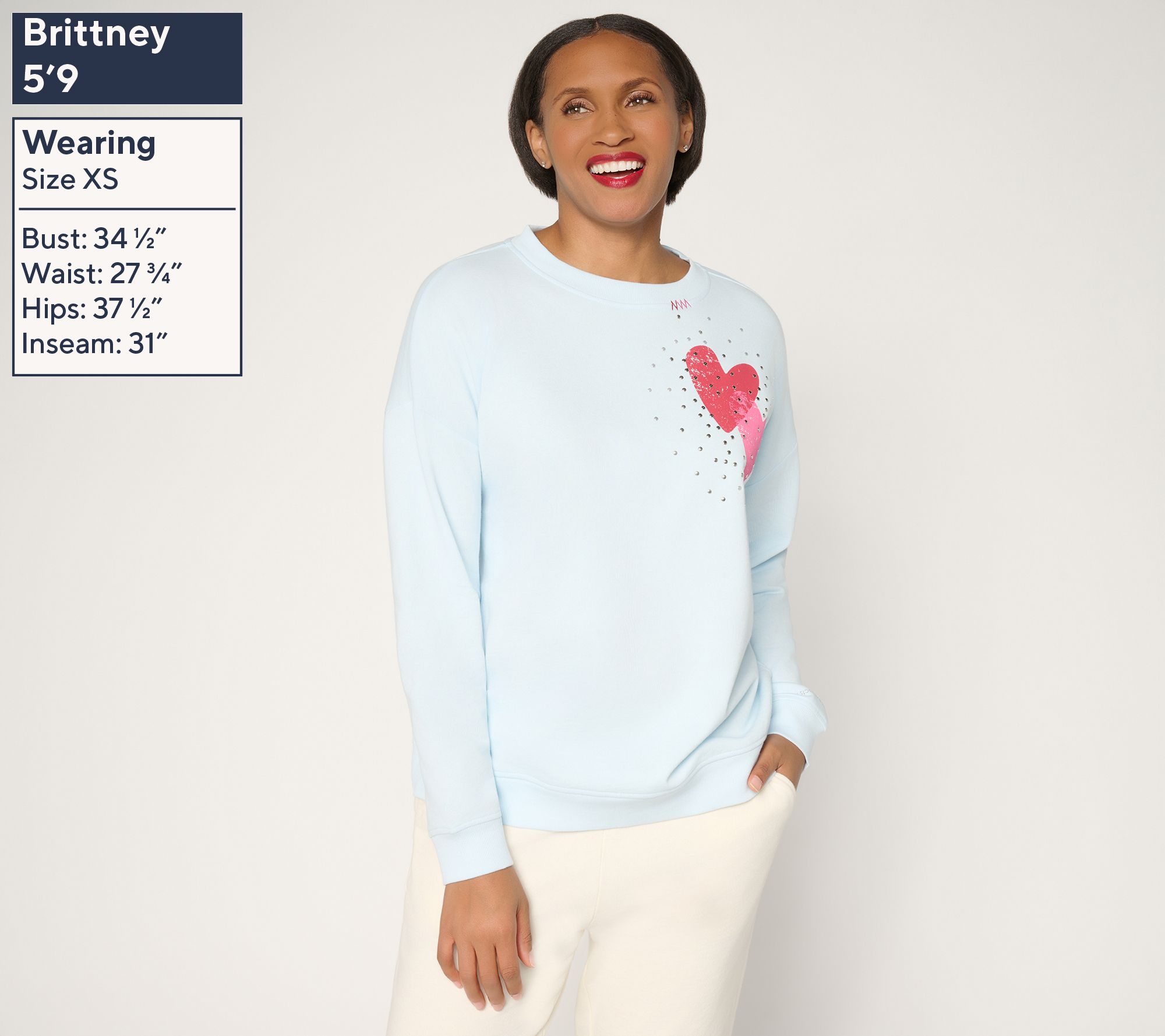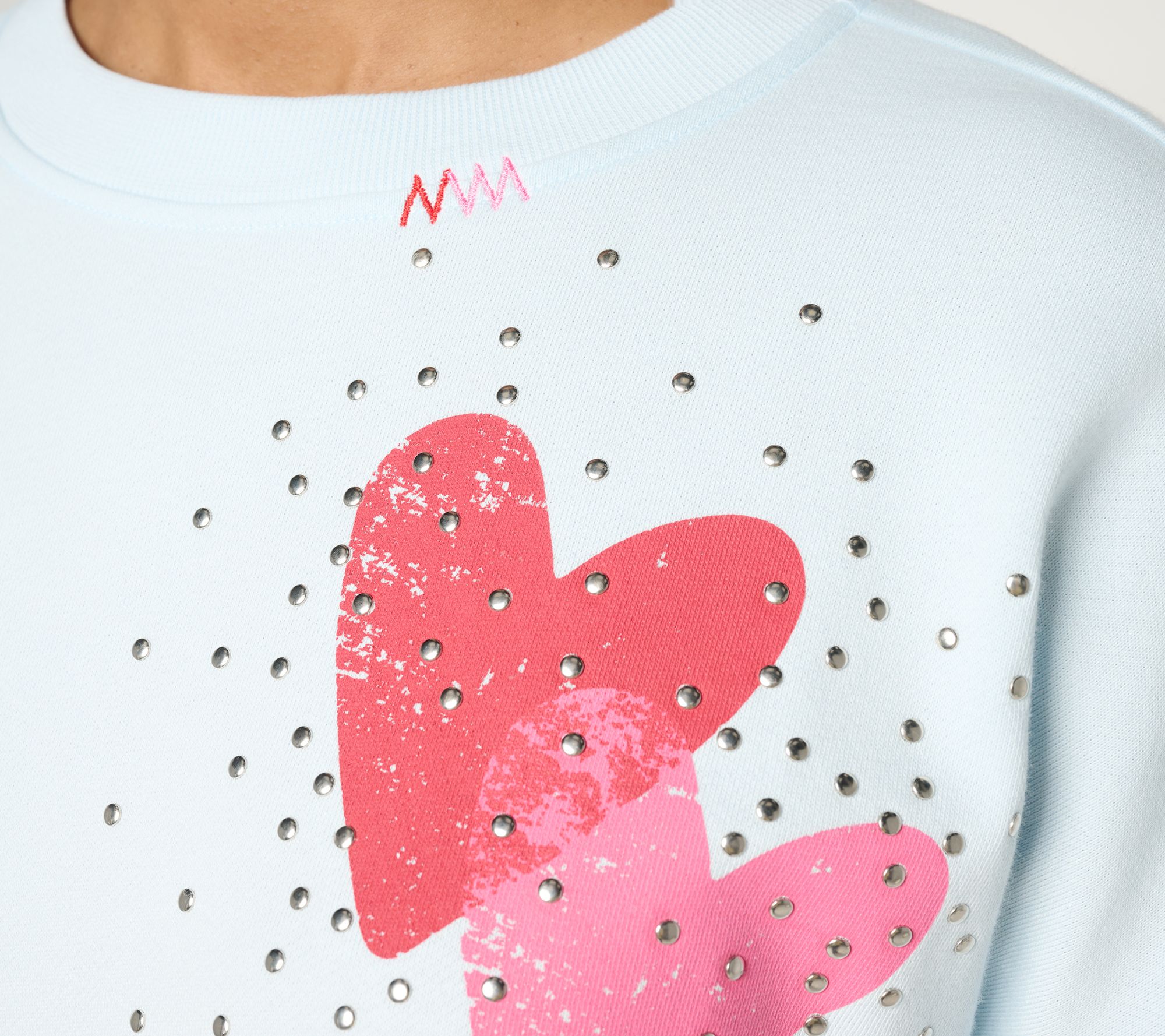 Features: pullover, crewneck, double heart print with stud detail, embroidery on neck seam, long sleeves with ribbed cuff, drop shoulder, ribbed bottom band