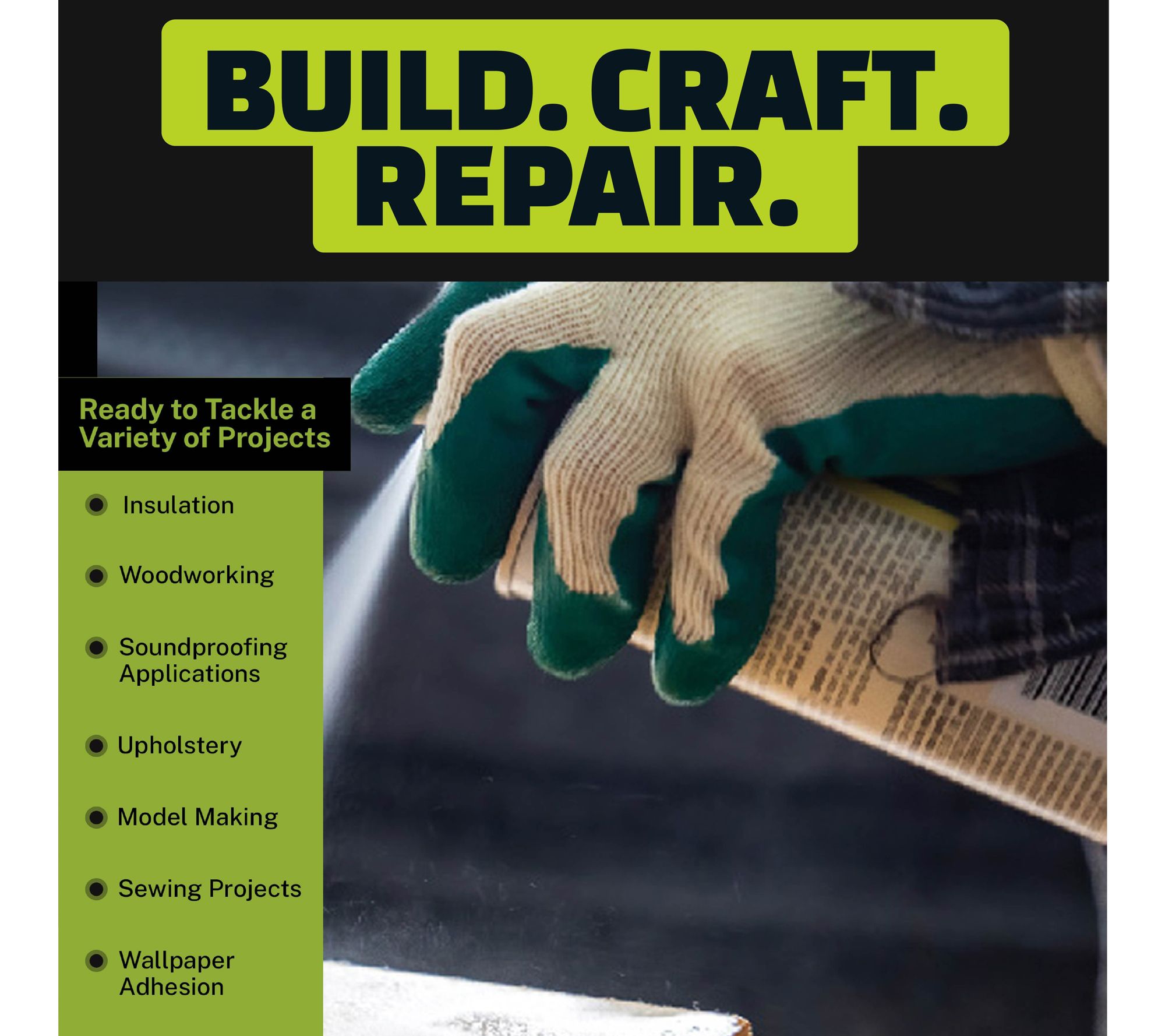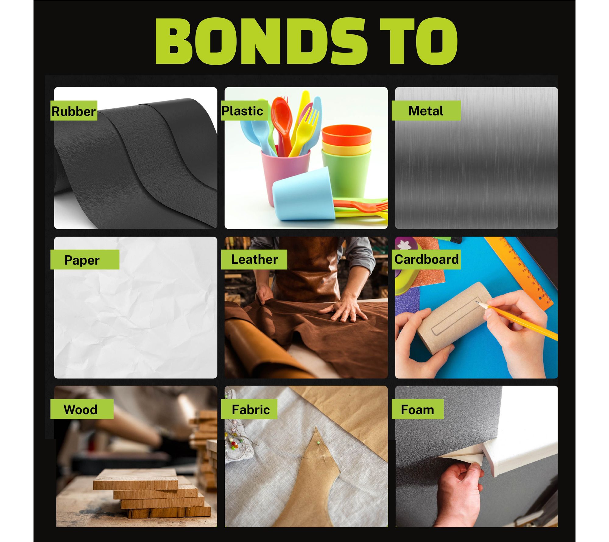 • Bonds rubber, plastic, metal, paper, leather, cardboard, wood, fabric, glass, and foam
