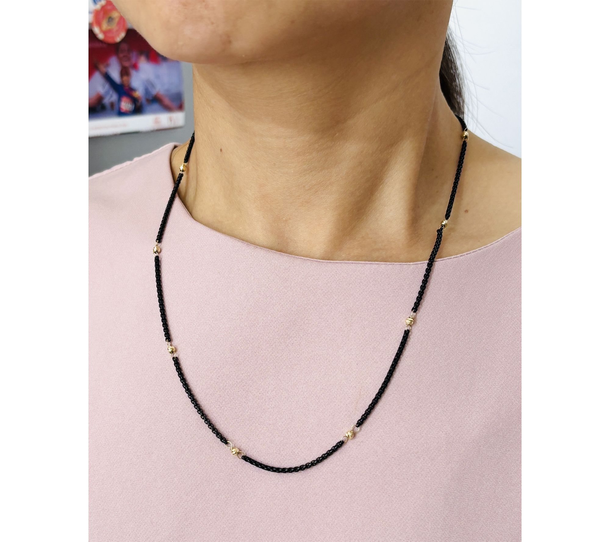 • Faceted gold beads stationed on blacktone stainless steel box chain; two-tone design