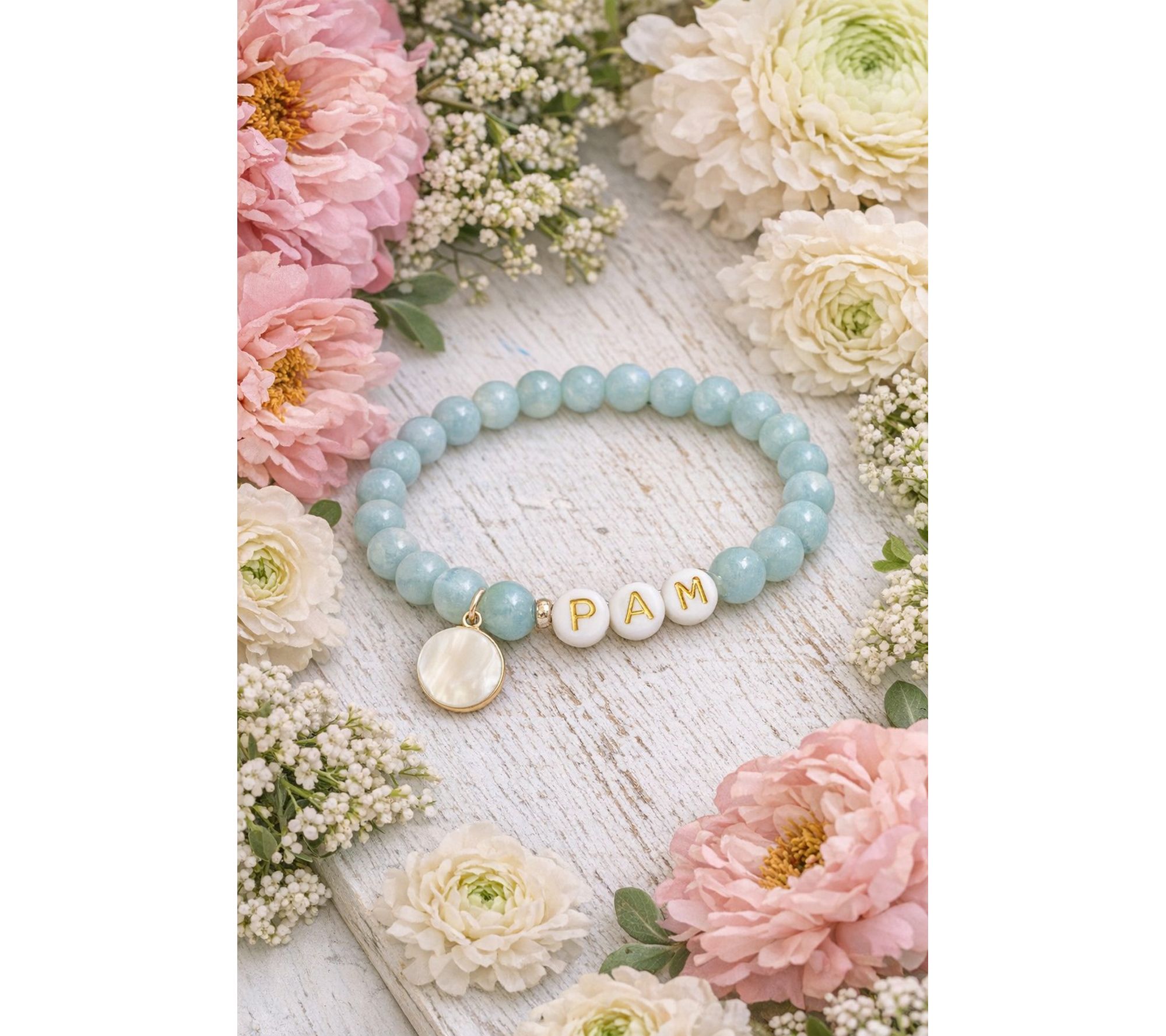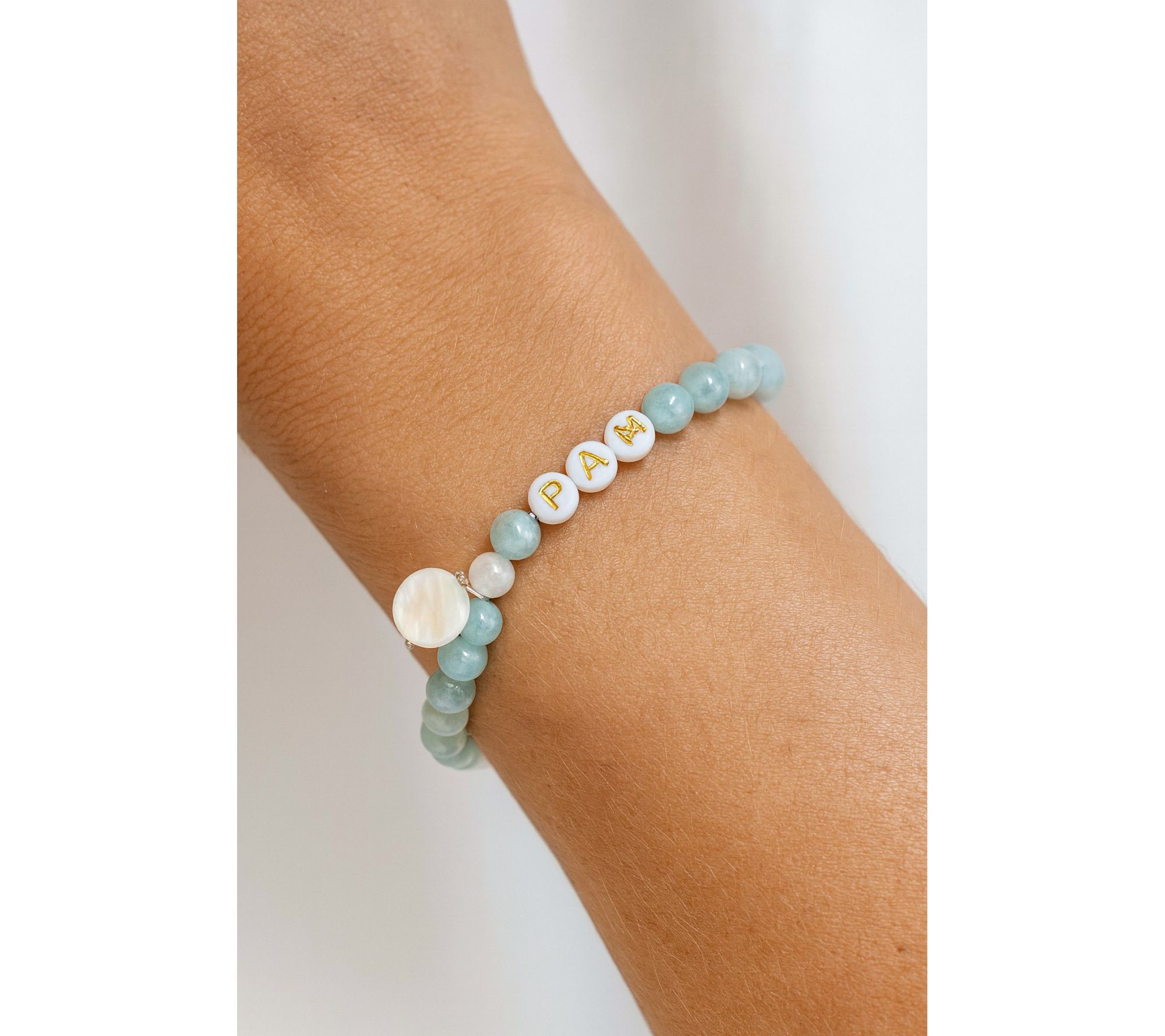 • Amazonite and mother of pearl beads; stretch design; personalized with up to ten letters