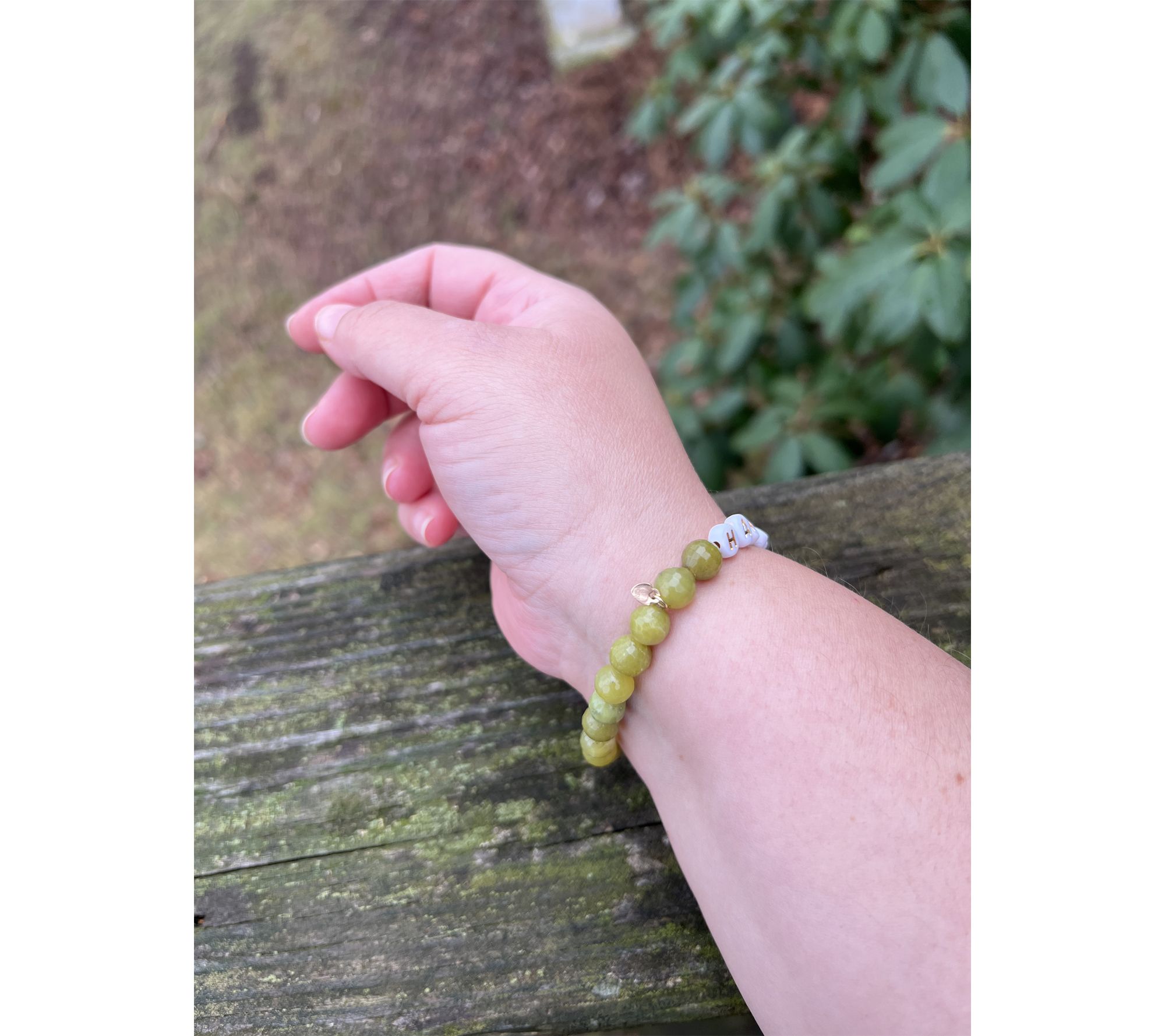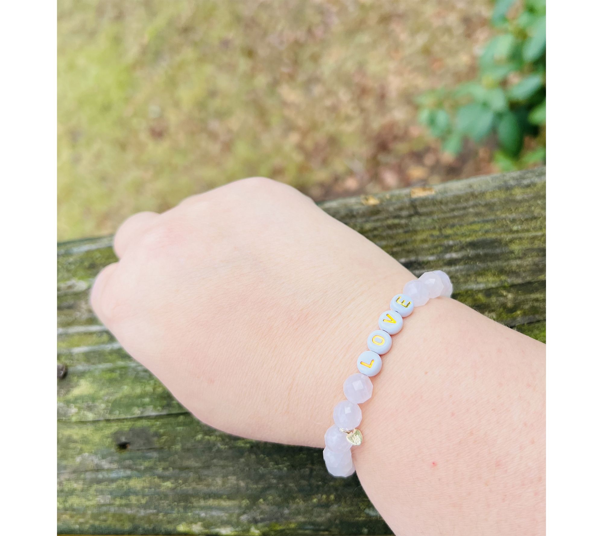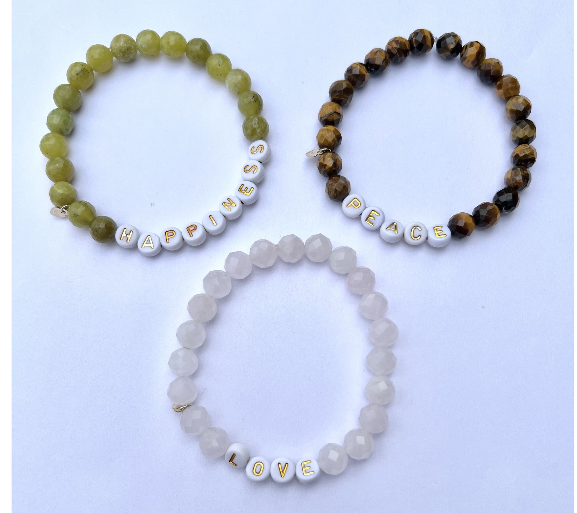 - Stretch design; faceted gemstone beads; message beads; polished finish