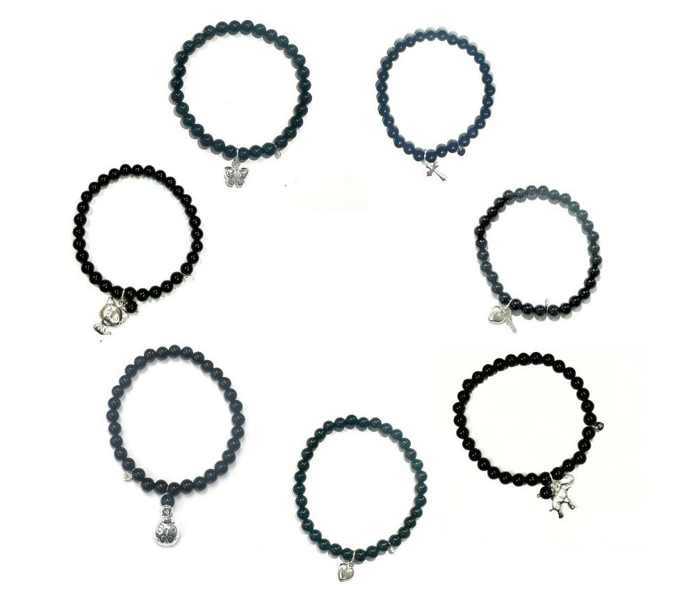 • Stretch design; round black onyx beads; inspirational charm; brand tag