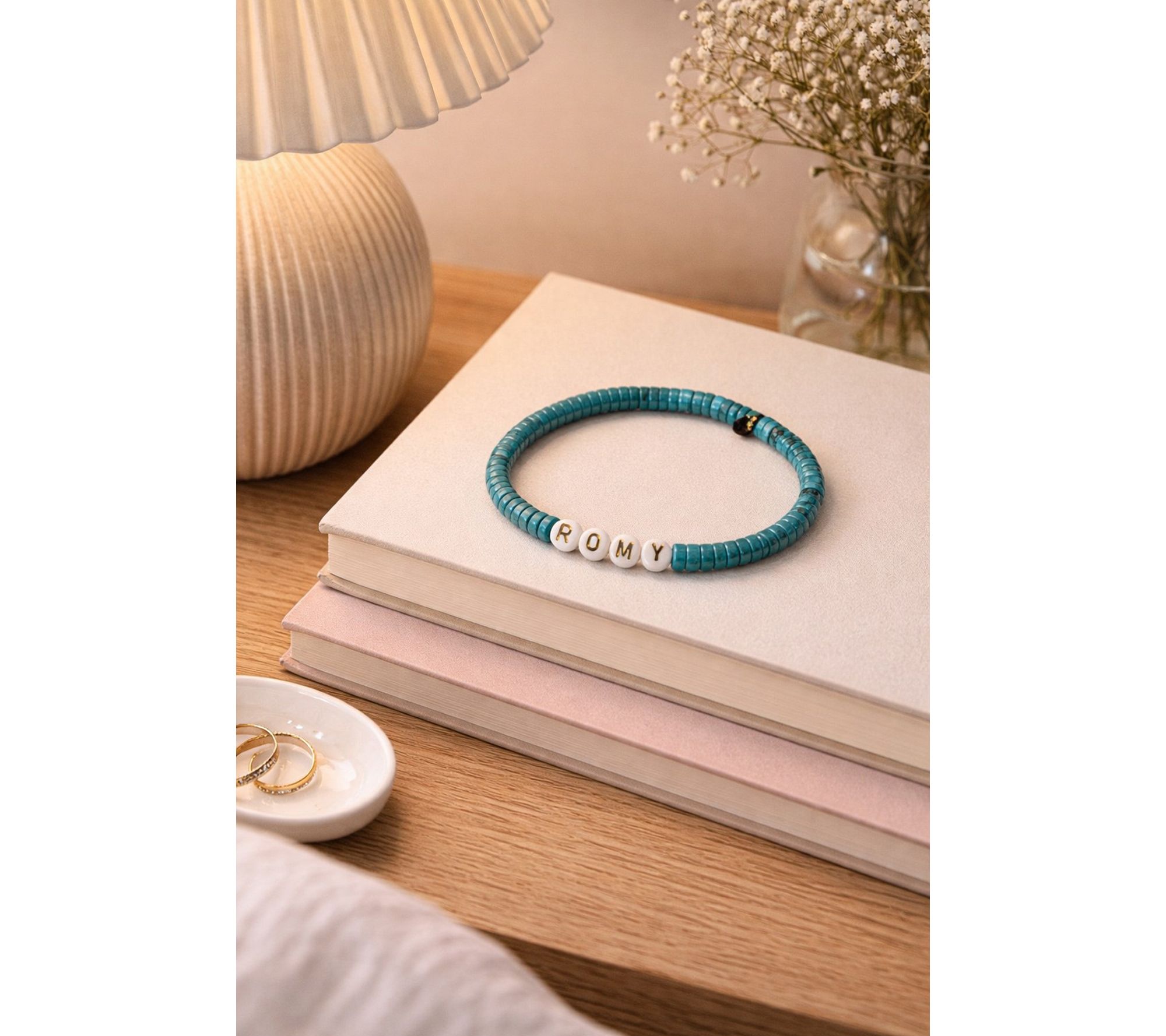 • Cylindrical turquoise gemstone beads, approximately 8mm; personalized with up to 10 characters; strung design; stretch fit
