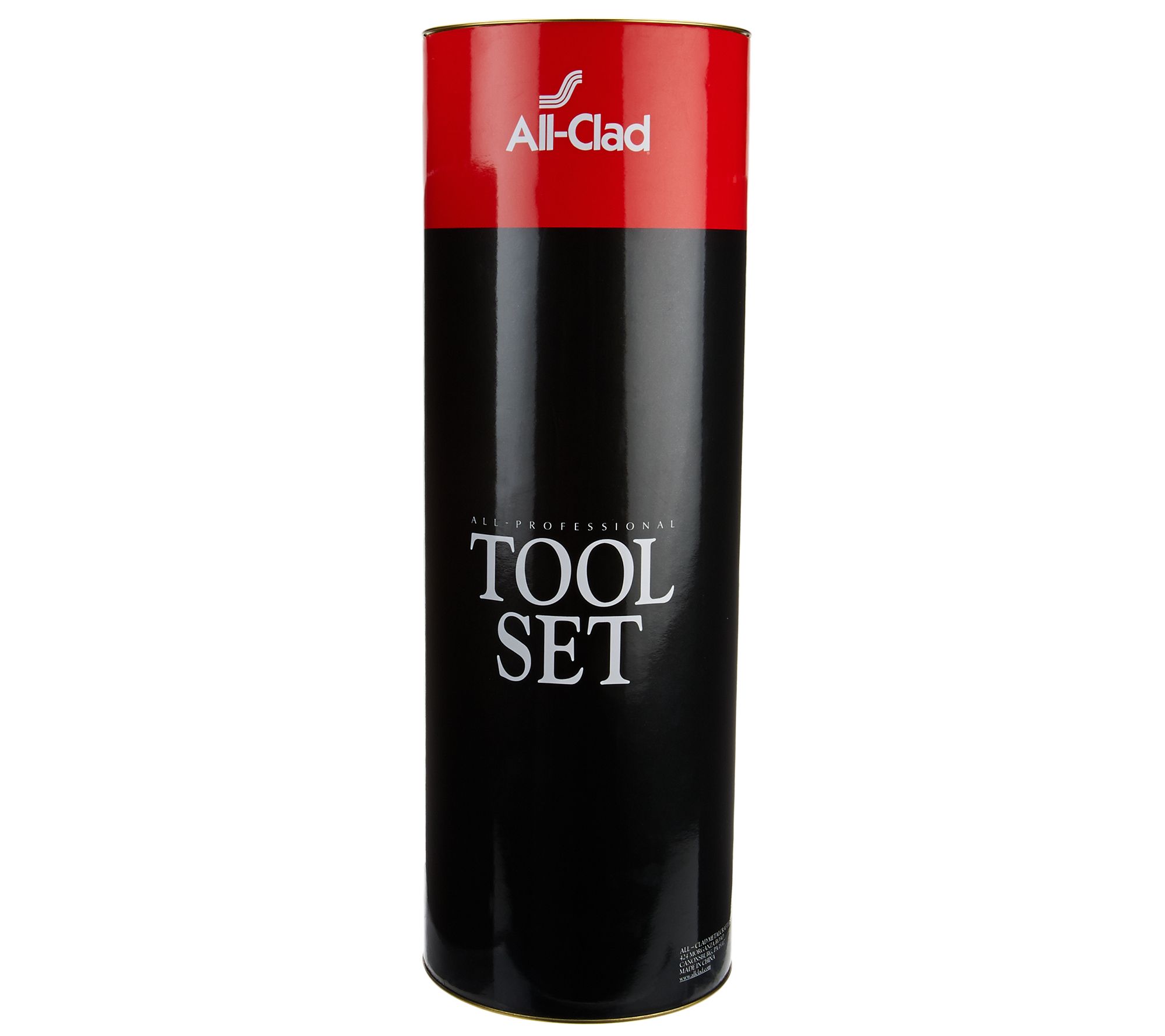The same quality you demand for your cookware comes to your kitchen tools with this six-piece set from All-Clad. A sleek caddy holds a solid spoon, slotted spoon, fork, turner, and ladle--all crafted from a single piece of heavy-gauge polished stainless steel for long-lasting durability. From All-Clad.