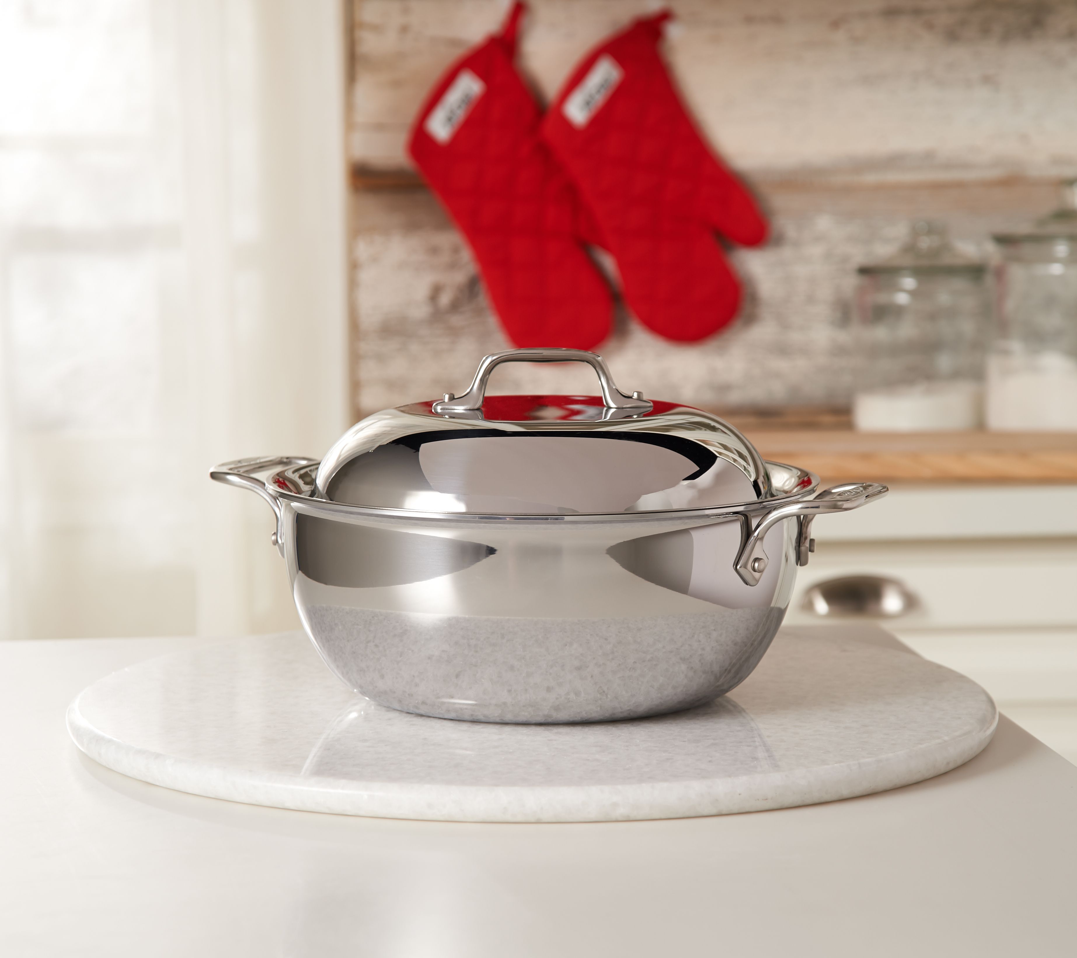 Cooking convenience is all yours when you prep meals in this All-Clad Dutch oven. Its Tri-Ply stainless steel construction ensures optimal cooking results. And the convenience doesn't stop once you're done cooking. Put it in the dishwasher for effortless cleanup! There are even two oven mitts included with the Dutch oven. From All-Clad.