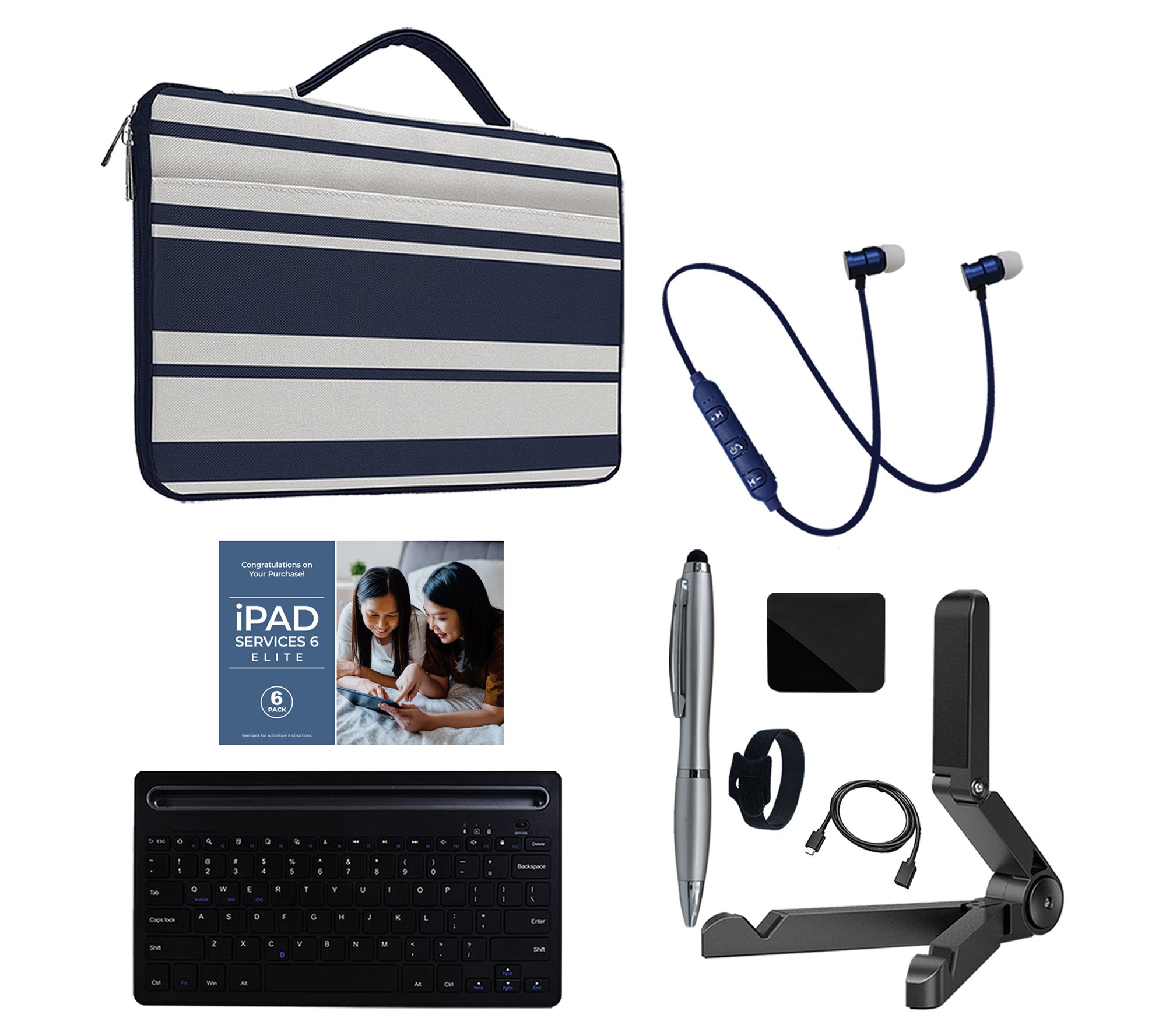 Includes 10th-generation Apple iPad with USB-C charging cable and power adapter; Bluetooth keyboard, carry case, Bluetooth earbuds, tablet stand, cleaning cloth, stylus, cable organizer, extension cable, and voucher