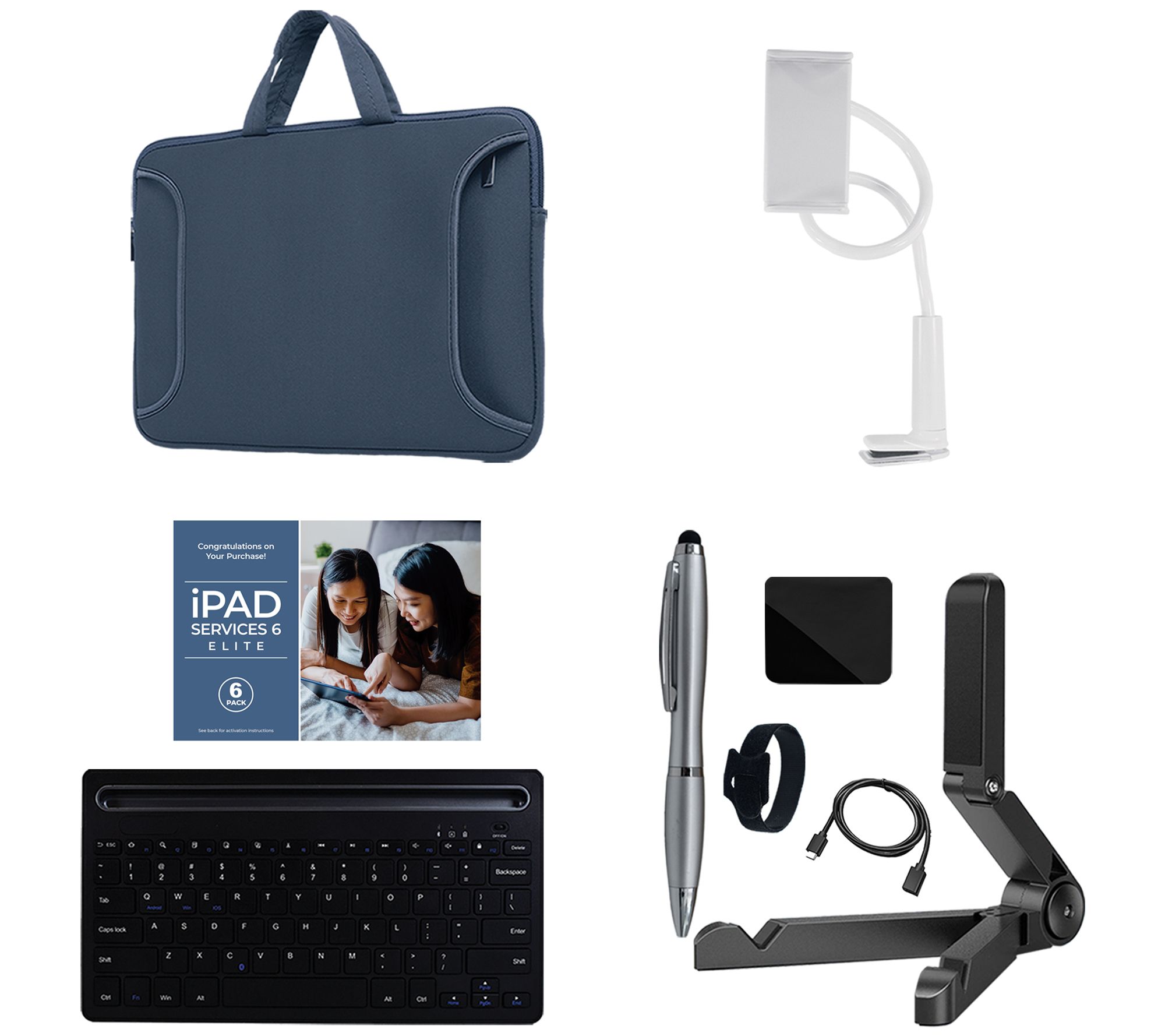 Includes 10th-generation Apple iPad with USB-C charging cable and power adapter; Bluetooth keyboard, carry case, gooseneck holder, tablet stand, cleaning cloth, stylus, cable organizer, extension cable, and voucher