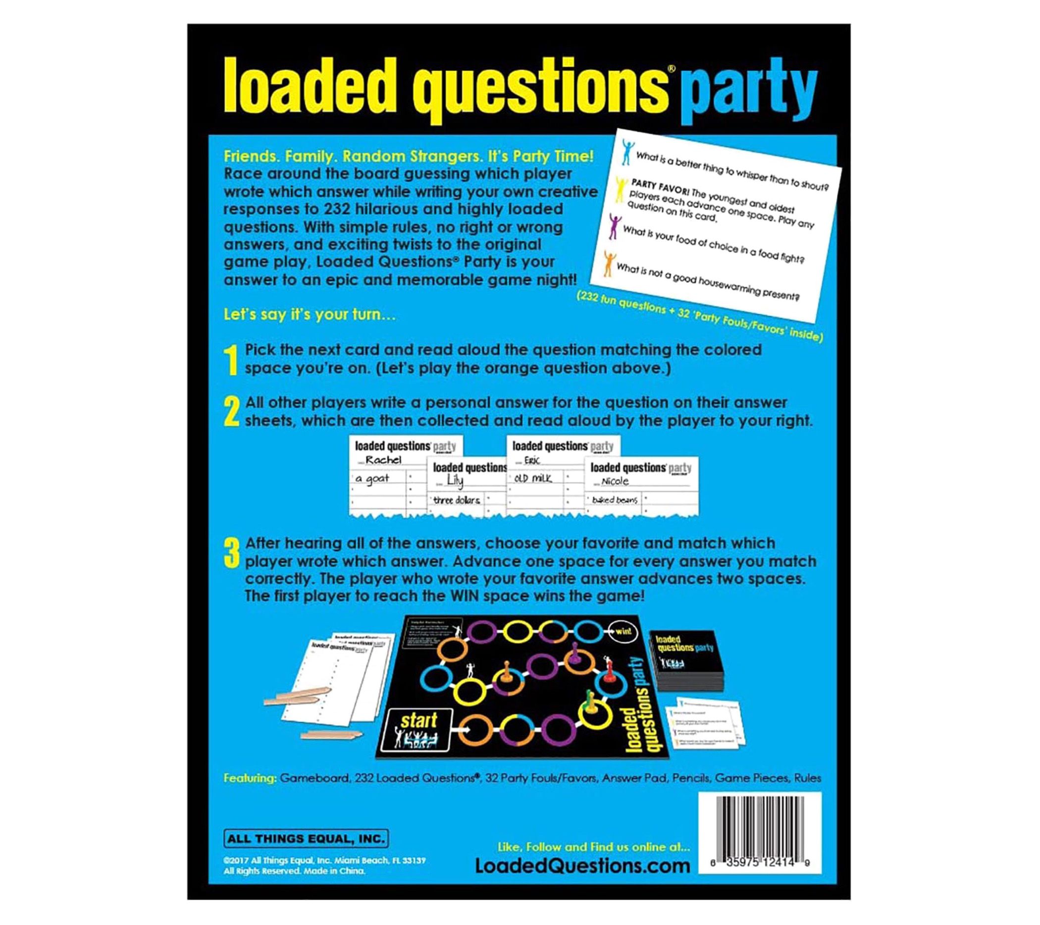 Get ready for an epic game night as you race around the board guessing who wrote which answer while writing your own creative responses to one of the over 225 hilarious and highly loaded questions. From All Things Equal.
