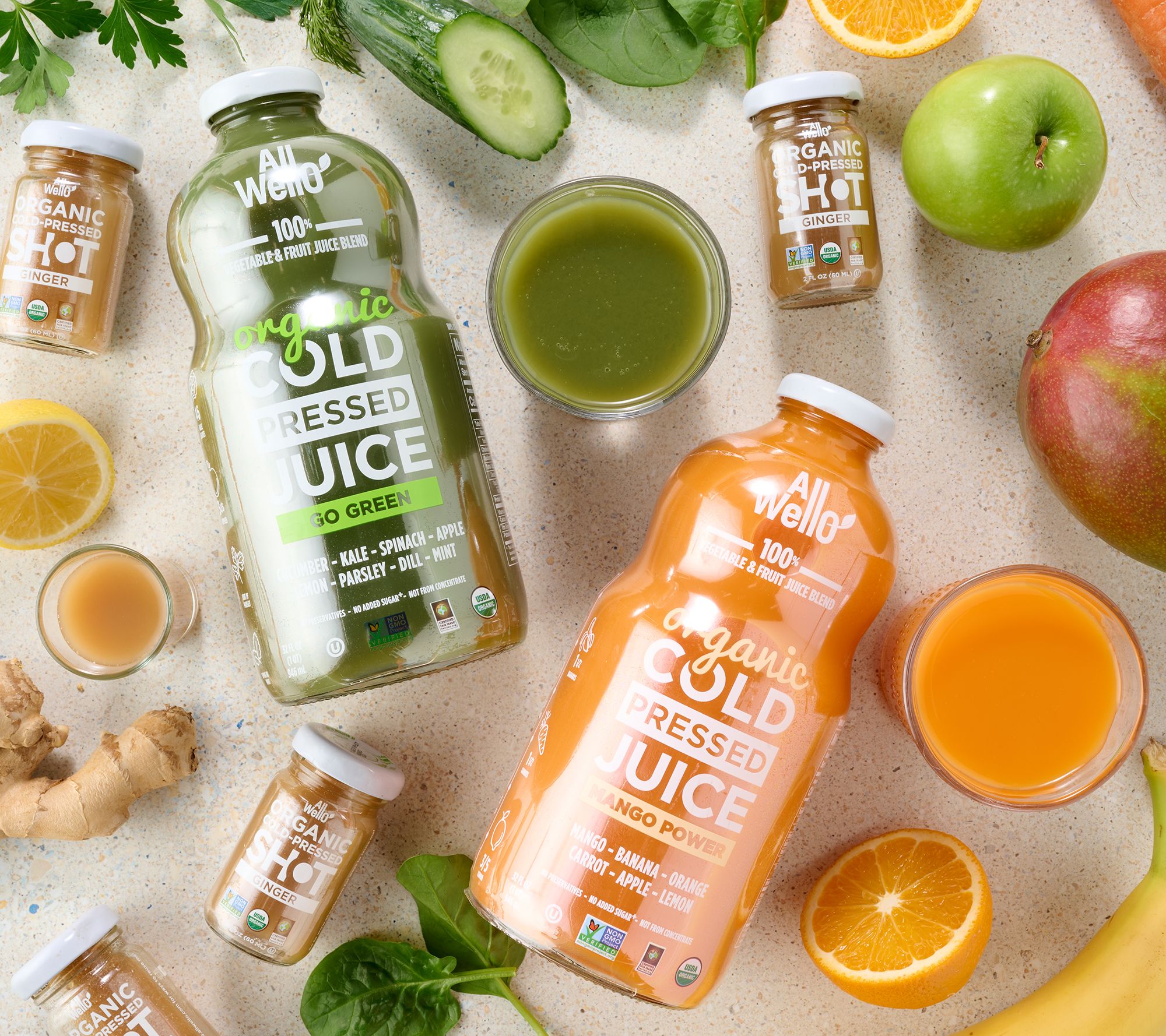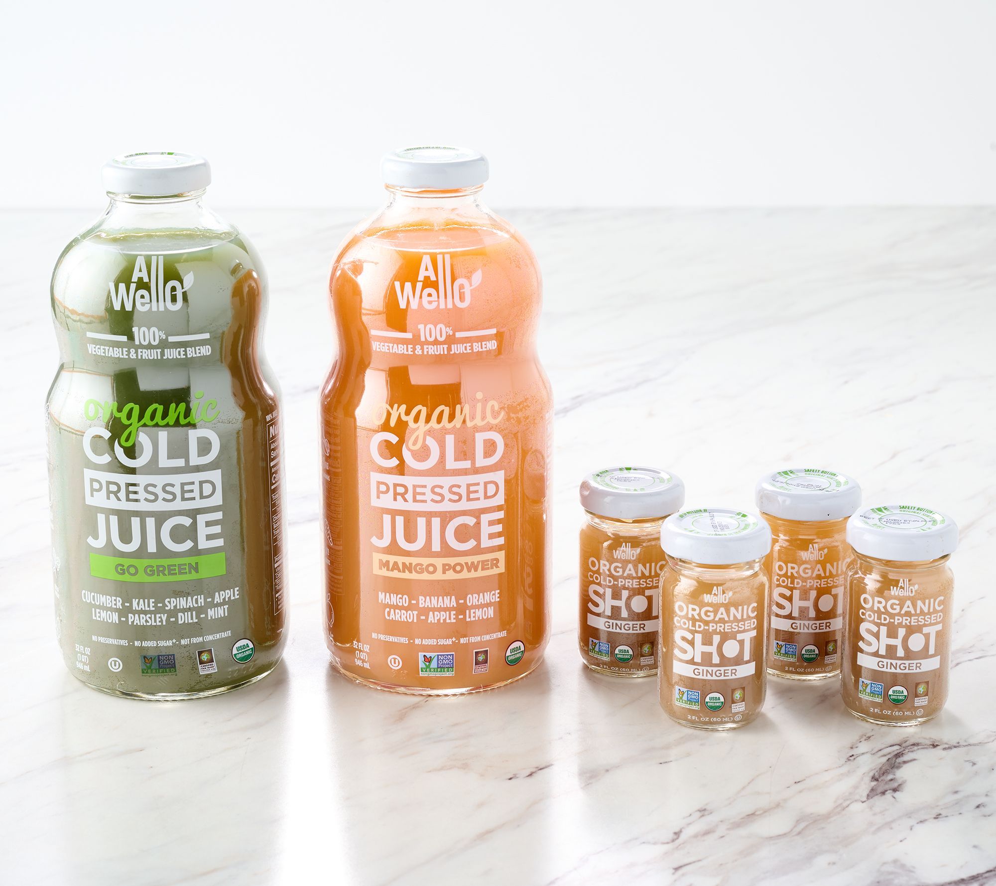 Kickstart your morning or power through the day with Allwello's cold-pressed juice set, offering refreshing options and a flavorful boost. Go Green and Mango Power juices blend fruits and vegetables for a vibrant taste. Need an energizing pick-me-up? There's also Ginger Shots -- packed with a spicy punch -- whenever you need one. From Allwello.