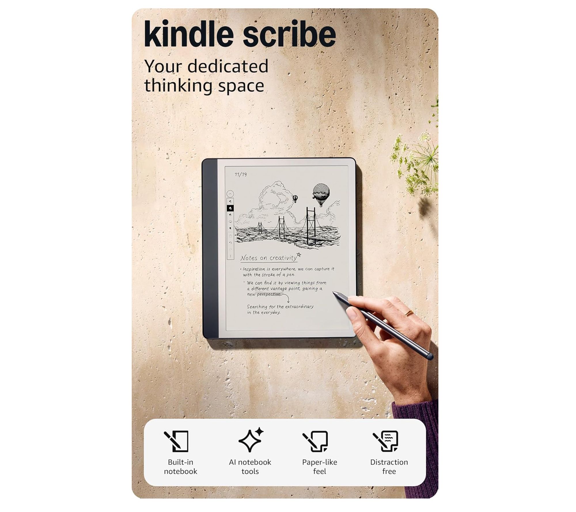With the Amazon Kindle Scribe tablet, you can stay engaged while reading, jotting down thoughts, or editing documents right on the page. The vivid 300 ppi front-lit display complements every word, while the premium pen and case with built-in stand make it simple to switch from reading to writing, whether you're at your desk, in a cafe, or relaxing at home. From Amazon.