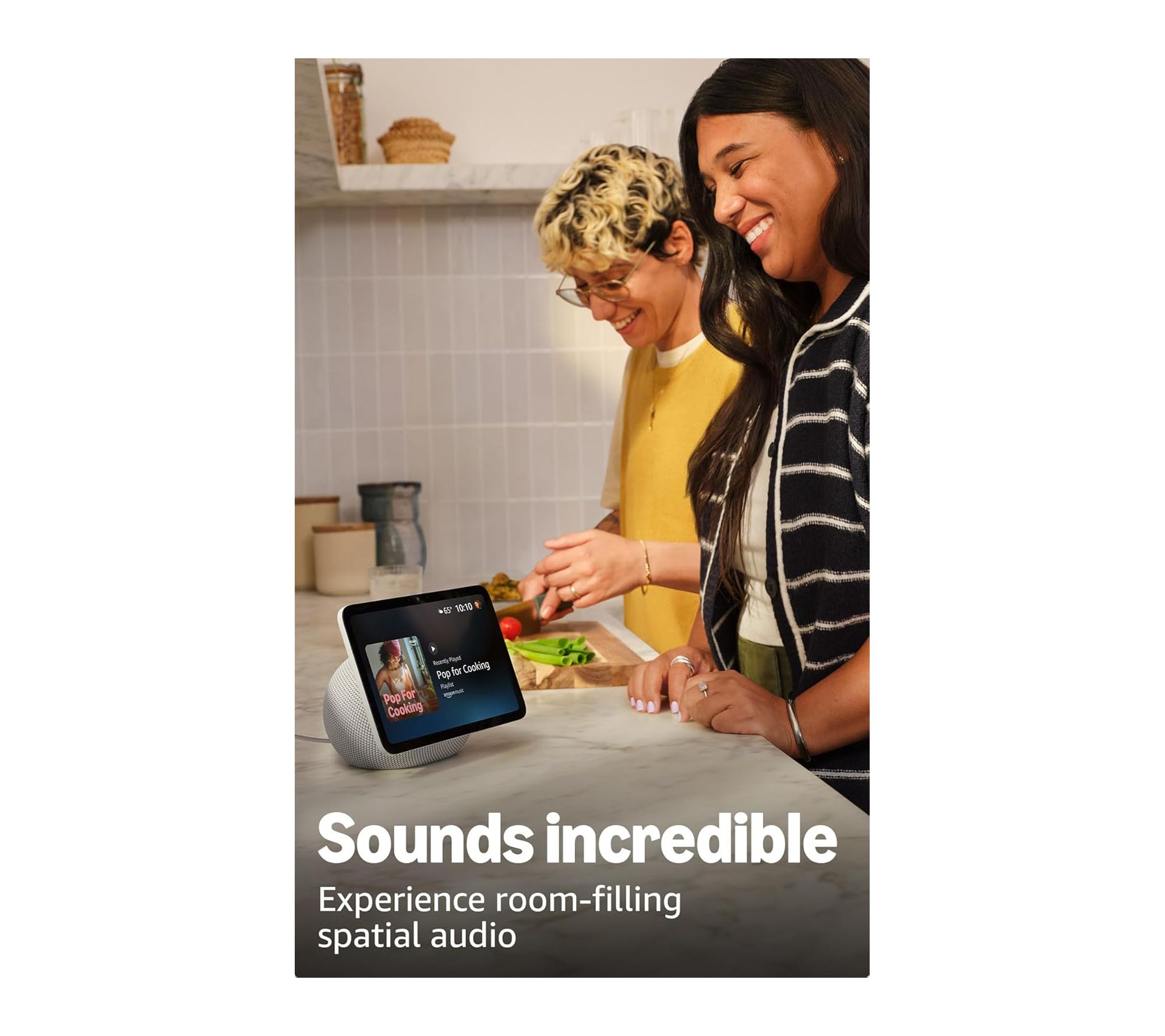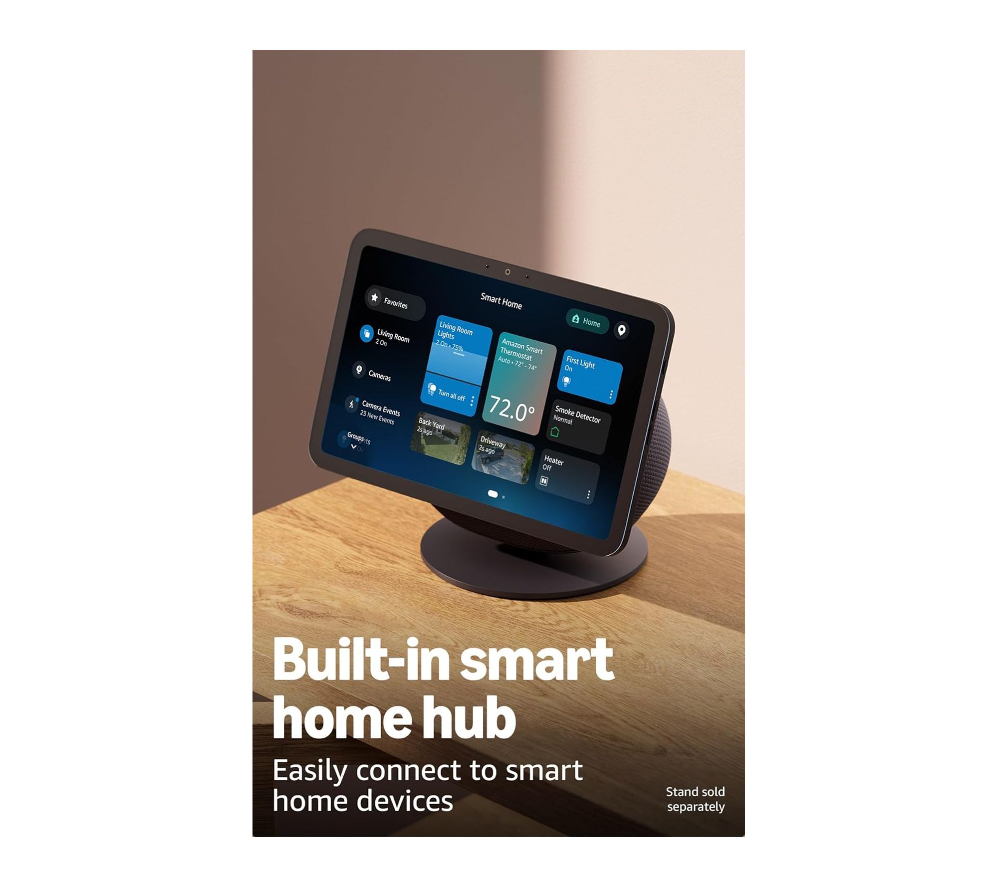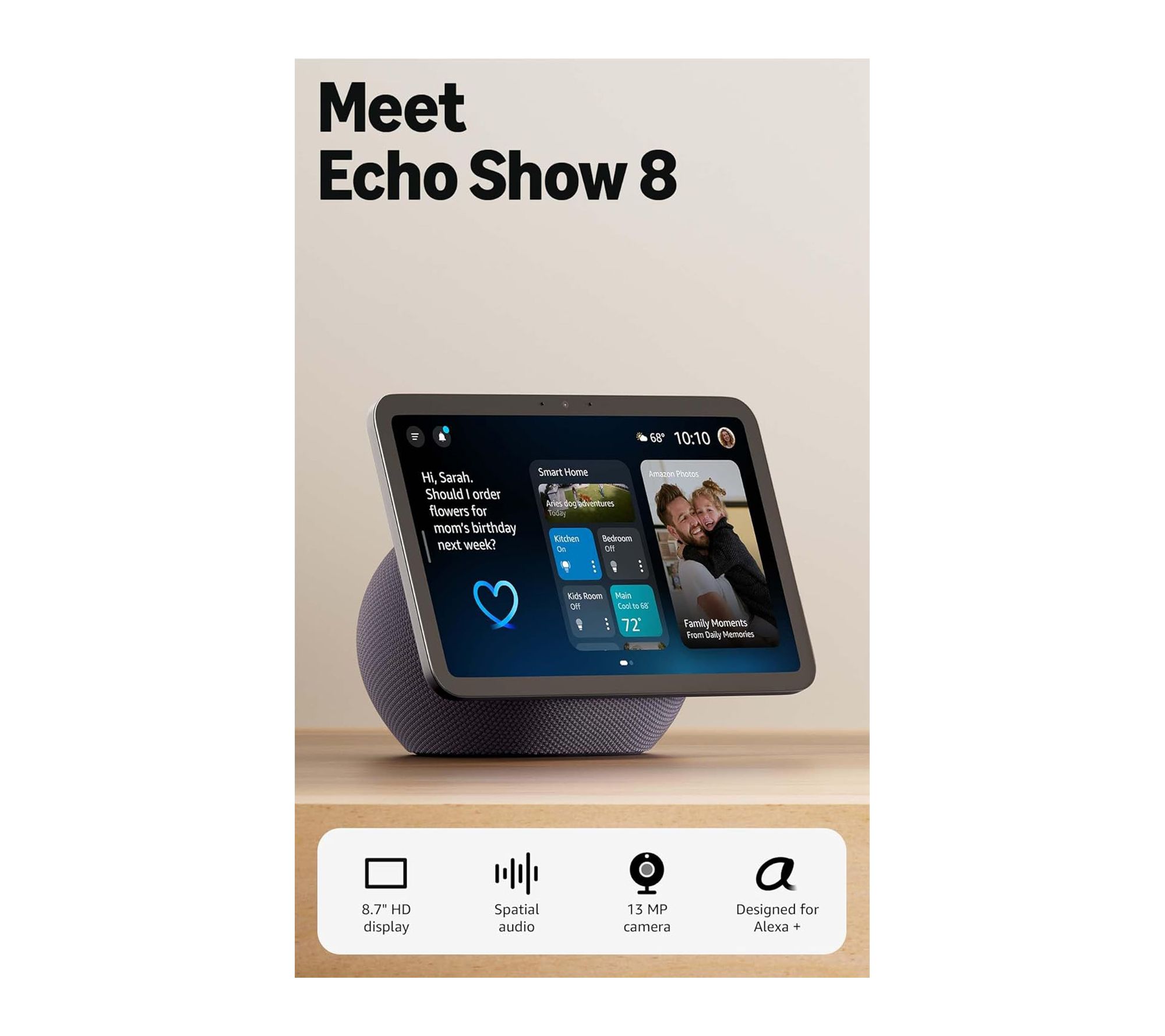 Powerfully smart, beautifully built. With the Amazon Echo Show 8, Alexa+ can help manage your day, keeping you in touch and highly entertained -- all with room-filling spatial audio from a vibrant HD display. Check weather and traffic, stream music and movies, video chat with family and friends, and power up all of your smart devices with voice controls. From Amazon.