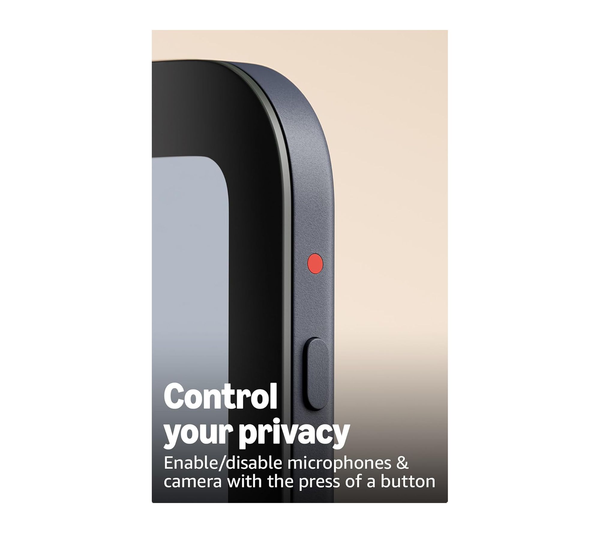 Multi-layered privacy controls: mic and camera enable/disable button, dedicated camera controls on device and in-app