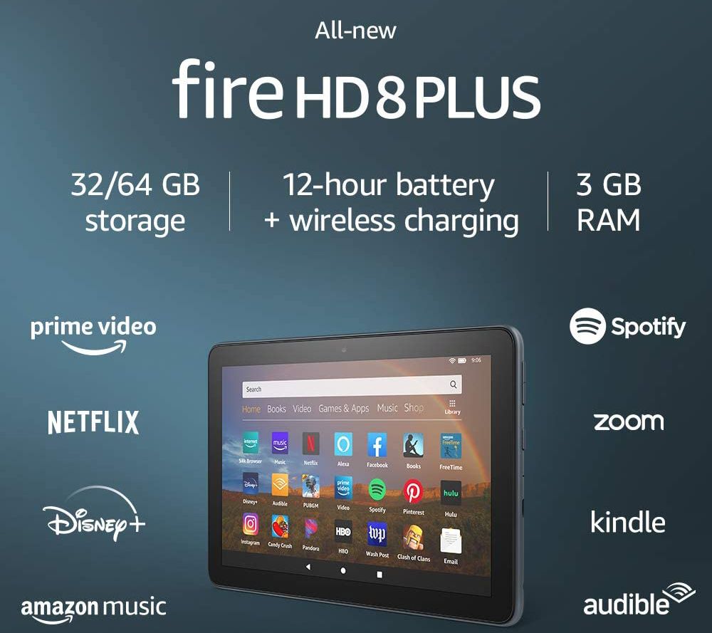 Includes tenth-generation Fire HD 8 Plus tablet with USB-C 2.0 cable, 9W power adapter, and quick-start guide