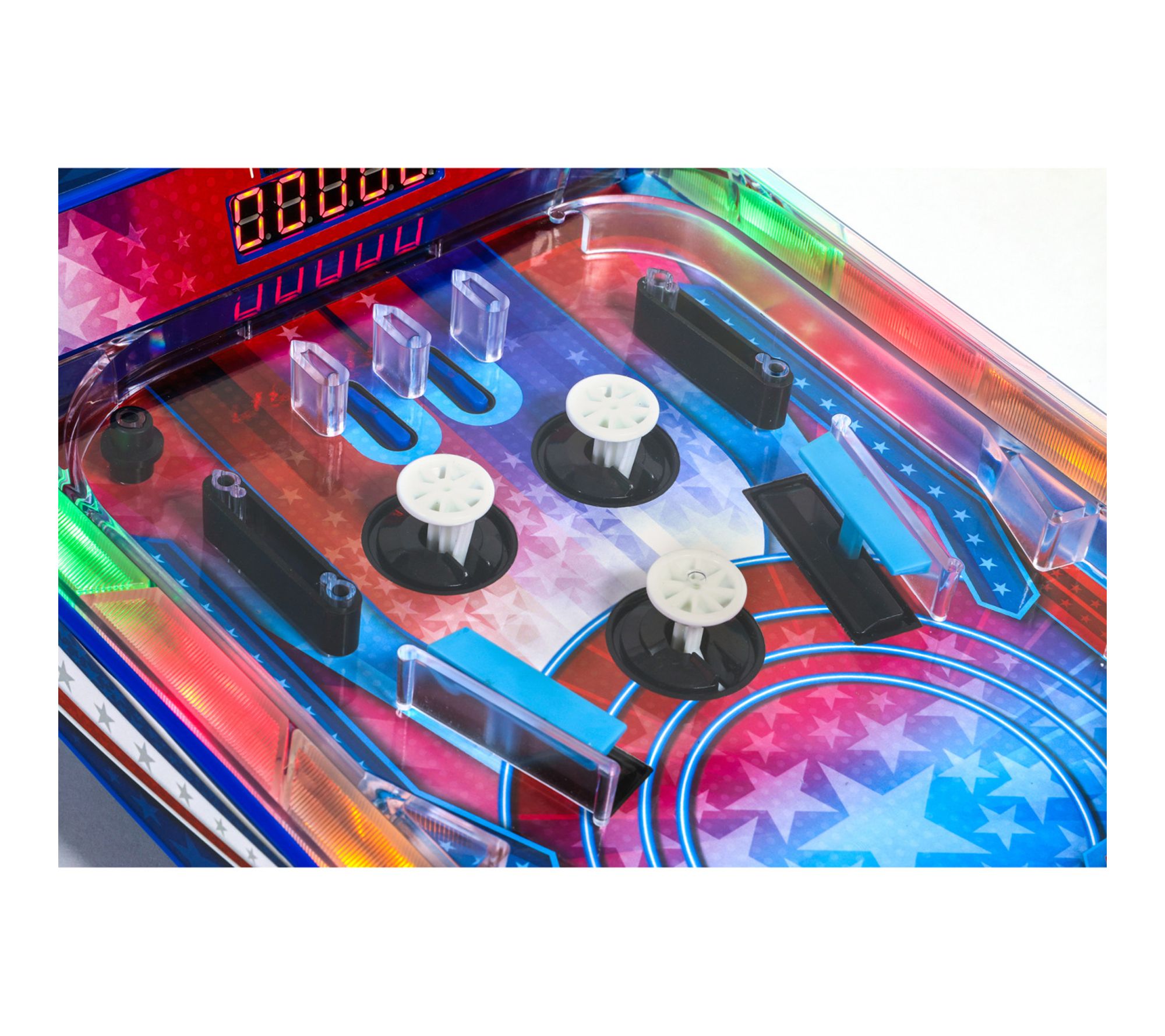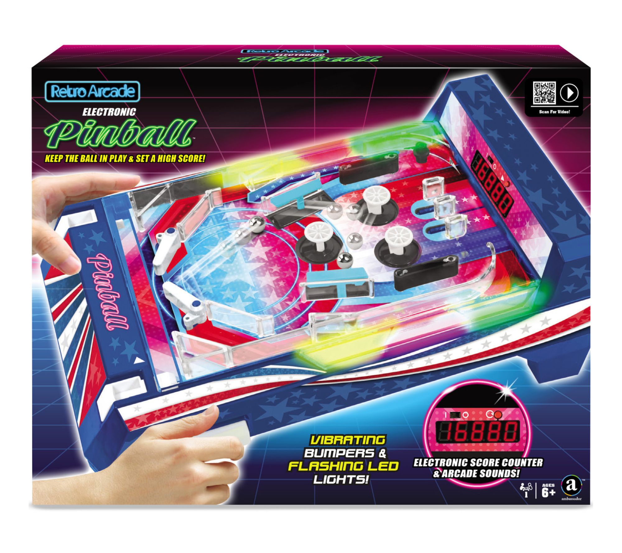 Relive the classic excitement of arcades with this Retro Arcade Electronic Pinball tabletop game. Gather friends or family and compete for the highest score as flashing LED lights, realistic bumpers, and lively sound effects turn any play session into an electrifying battle. The electronic scoreboard makes every round feel like a step back into arcade history. From Ambassador Games.