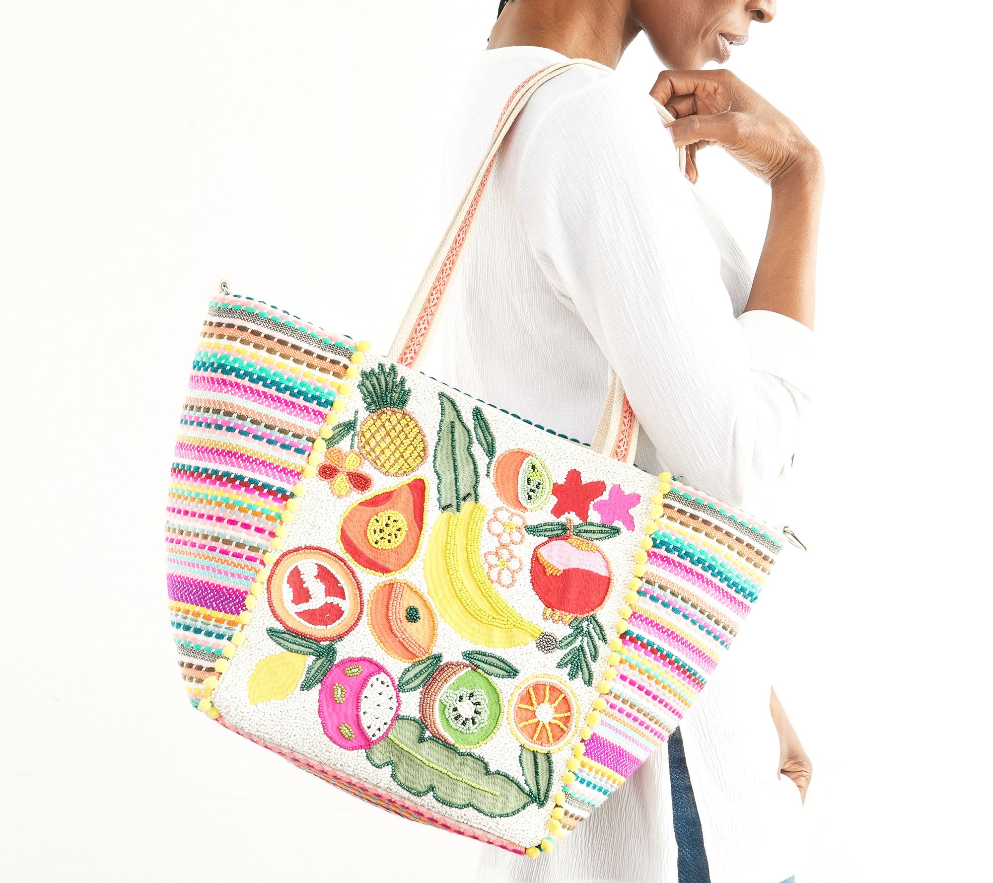 Covered in a colorful embroidered design, this embellished tote bag is a wearable work of art. From America & Beyond.