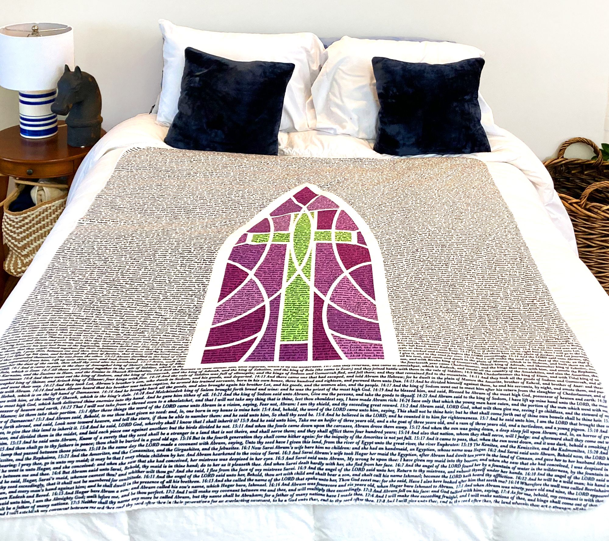 Cover yourself in comfort and inspiration with this sherpa blanket, featuring meaningful quotes and scripture. Want to just snuggle up without reading? Flip it over to admire the colorful artwork on the other side. From the American Blanket Company.