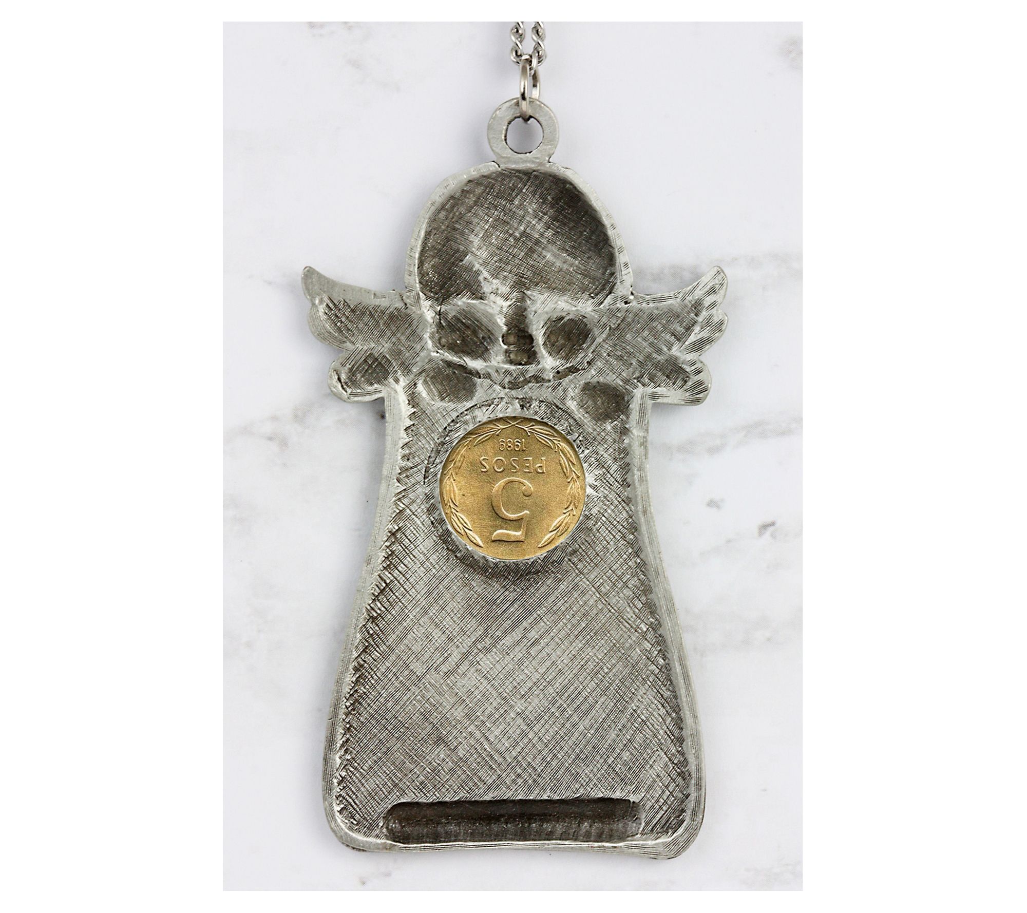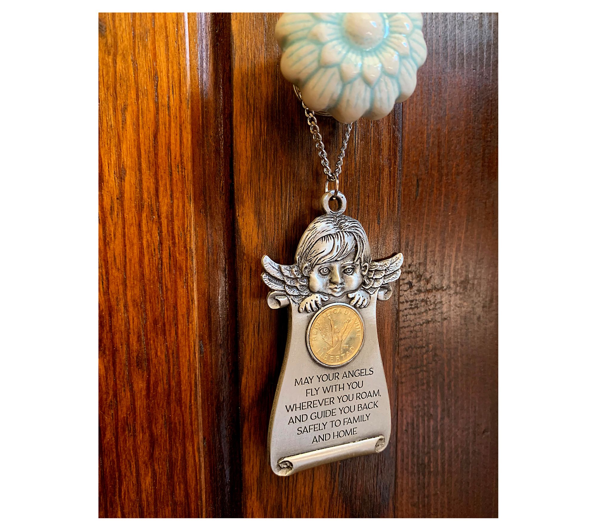 A beautiful symbol of protection, this guardian angel door blessing is topped with a Chile Libertad angel coin and is suspended from a chain for easy hanging. From American Coin Treasures.
