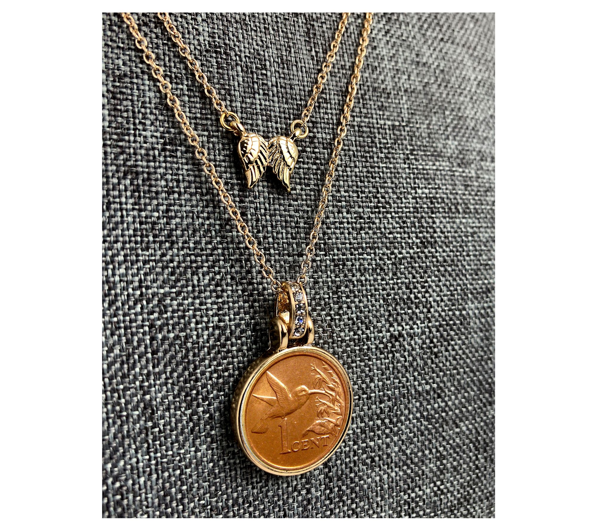 • Hummingbird one cent coin in round bezel; double strand set includes outer chain and inner chain with angel wings