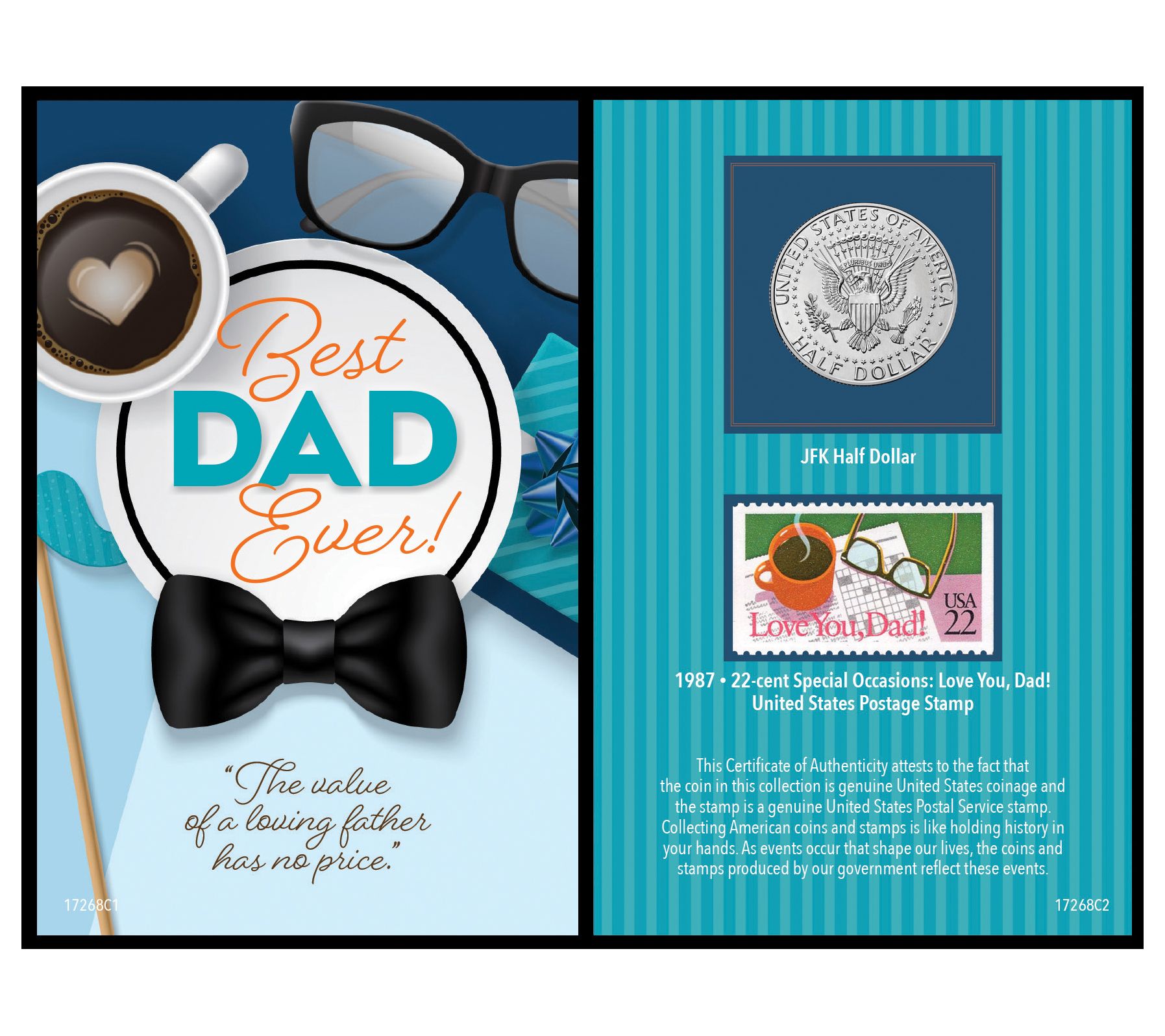 Brighten your dad's day with this oh-so-special greeting card. In addition to a sweet sentiment, it comes complete with a collectible JFK Half Dollar and 1987 "Love You Dad" Stamp. From American Coin Treasures.