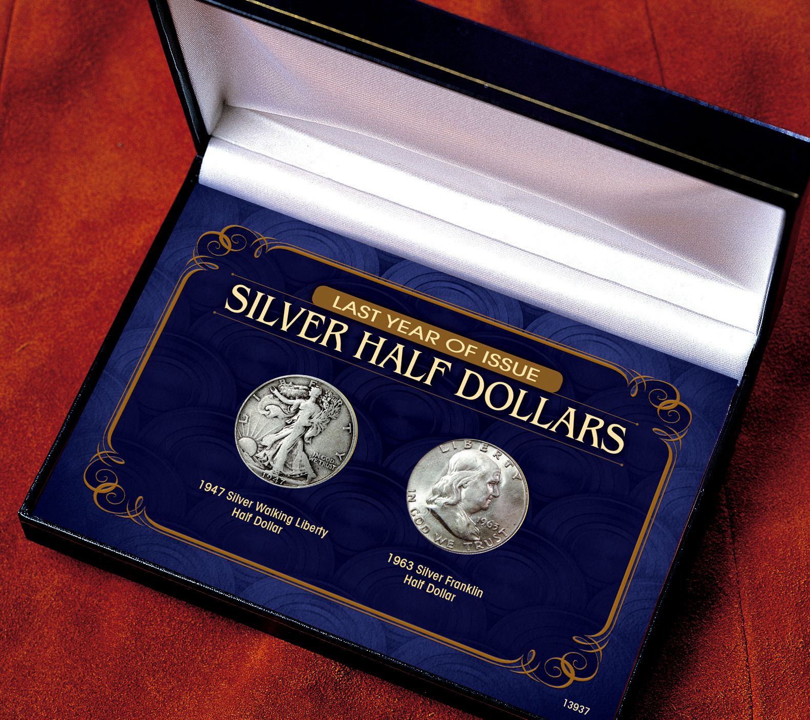 • Includes Silver Walking Liberty Half Dollar last minted in 1947; Silver Franklin Half Dollar last minted in 1963; museum-style display box