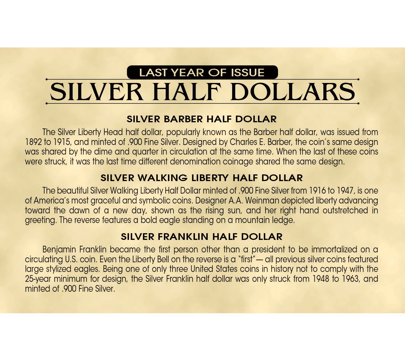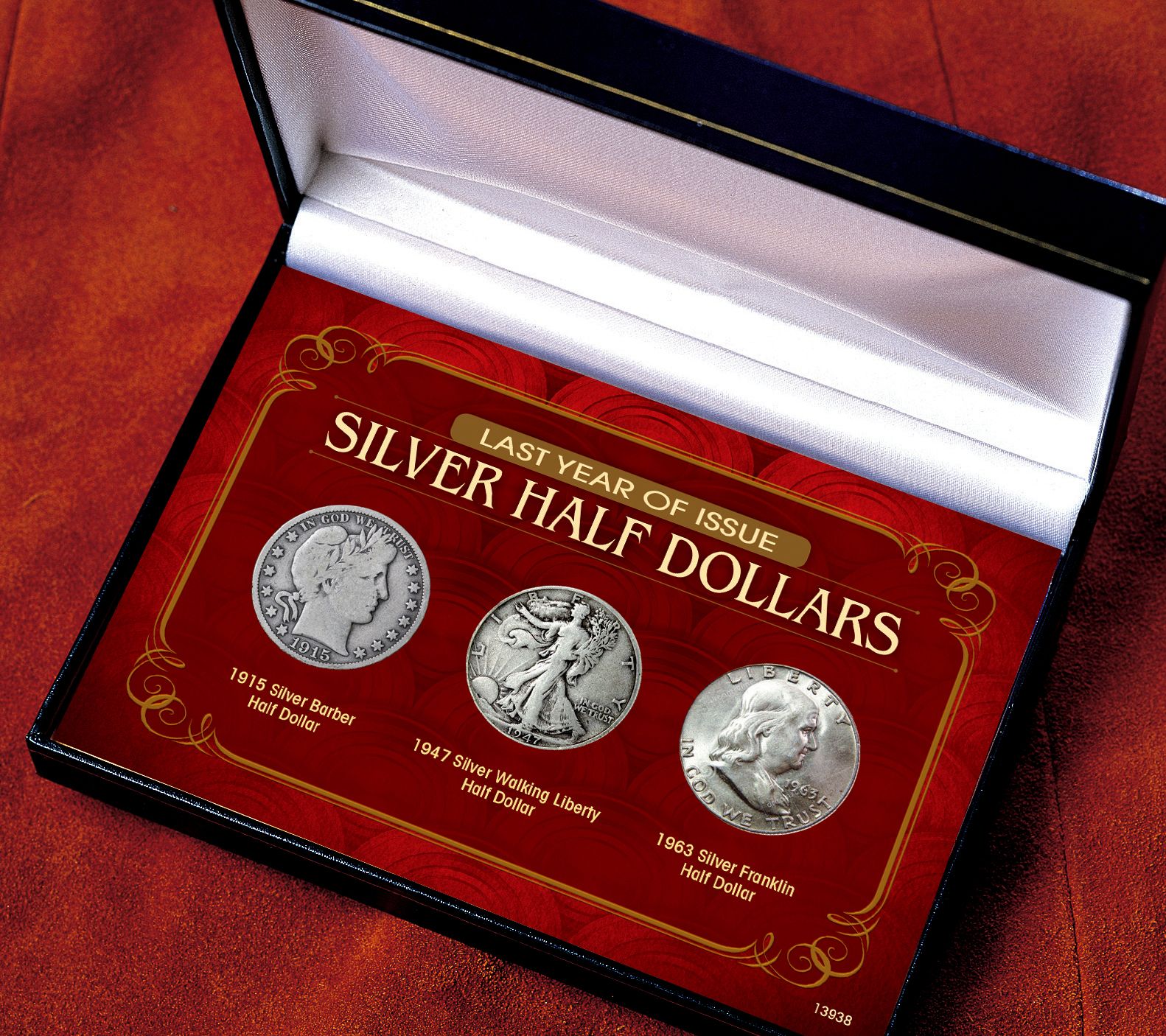 • Includes Silver Barber Half Dollar last minted in 1915; Silver Walking Liberty Half Dollar last minted in 1947; Silver Franklin Half Dollar last minted in 1963; museum-style display box