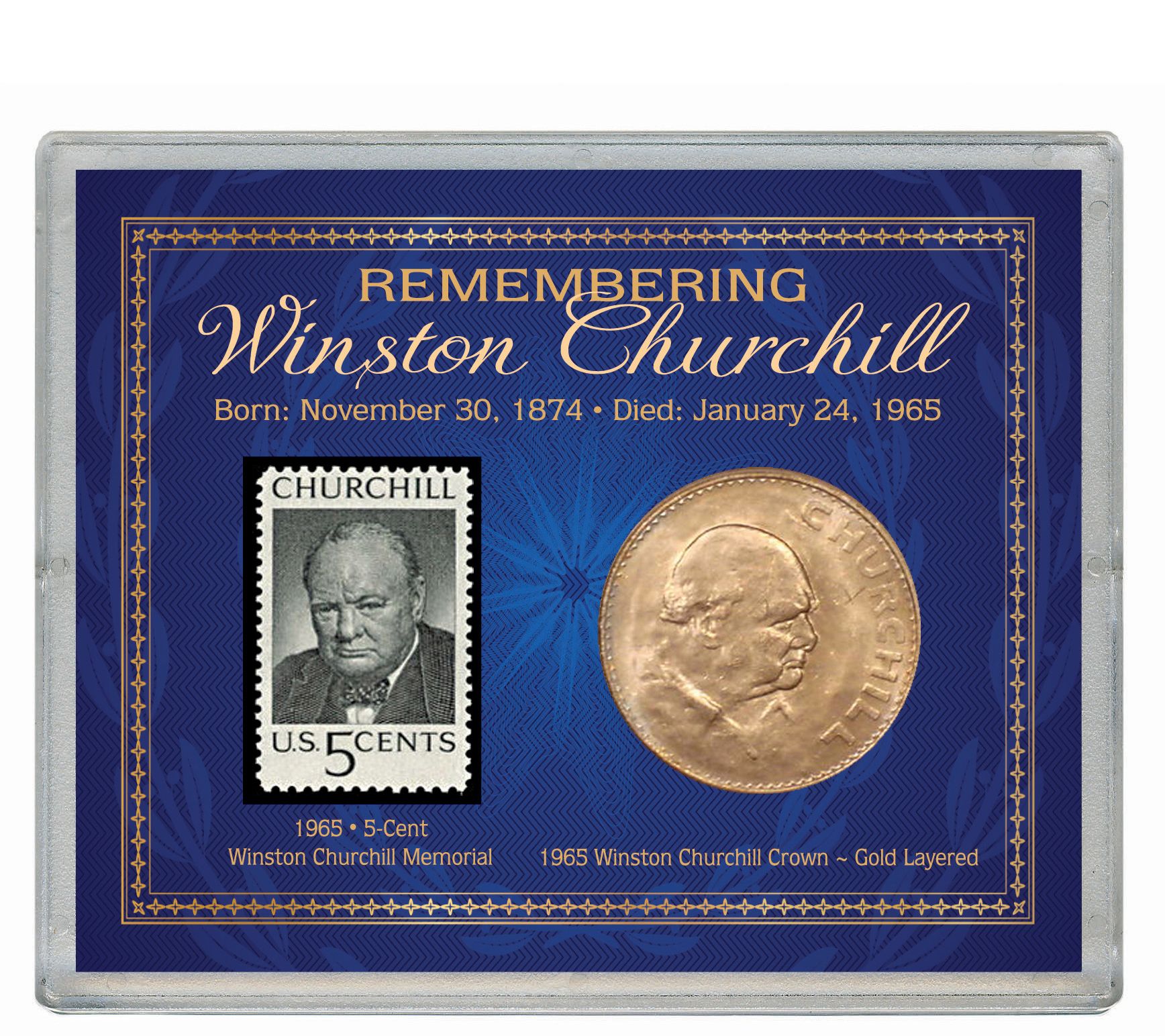 • Includes protective acrylic case with 1965 five-cent Winston Churchill memorial US stamp and a 1965 British crown coin