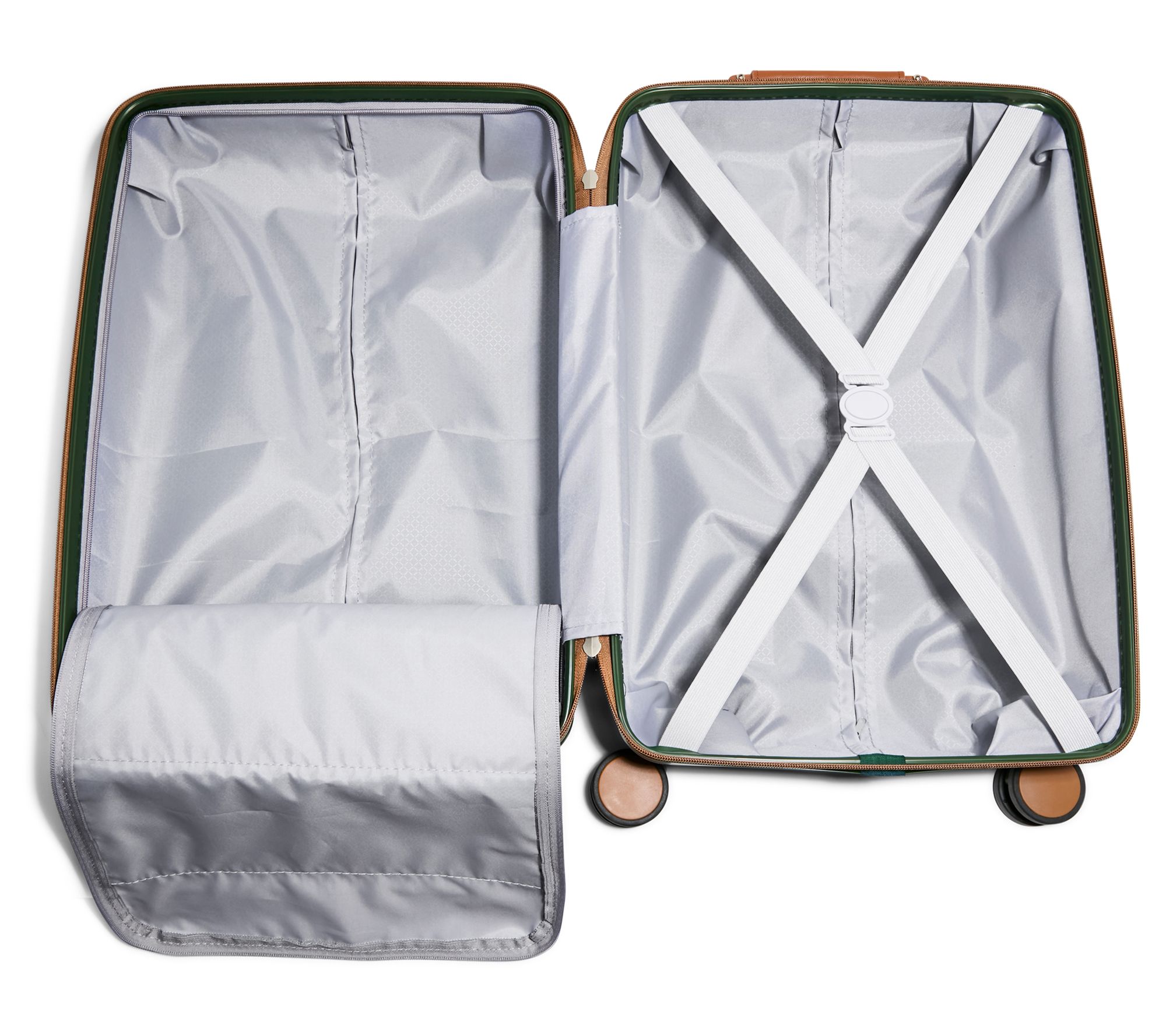 Inside zipper compartment with two additional interior zippers, elastic band, lining unzips to store shoes