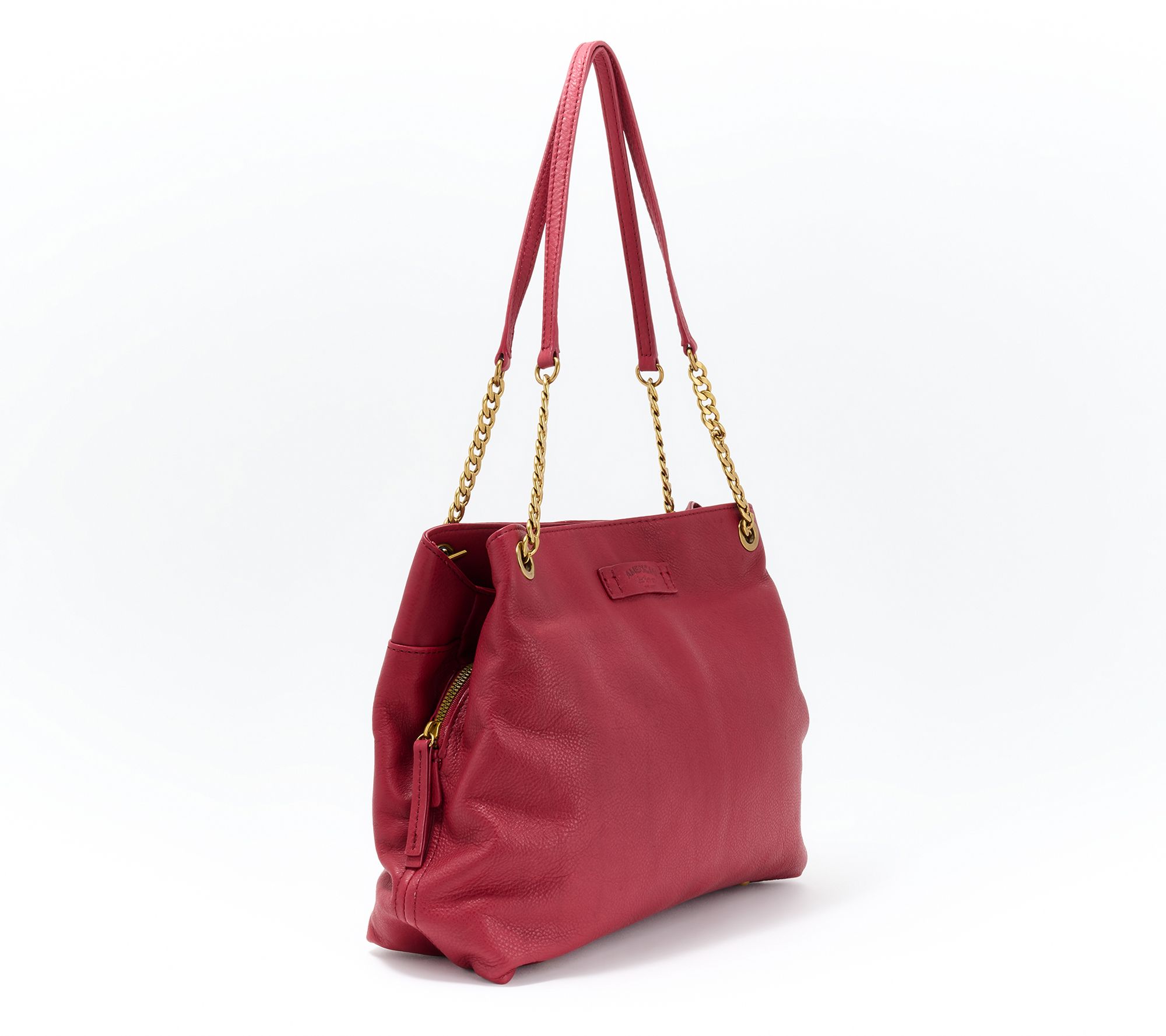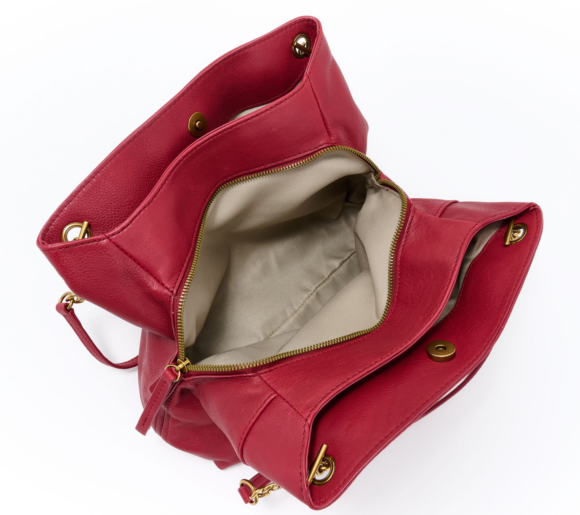 Magnetic snap at main entry, slip pocket with magnetic snap, chain strap, antiqued hardware