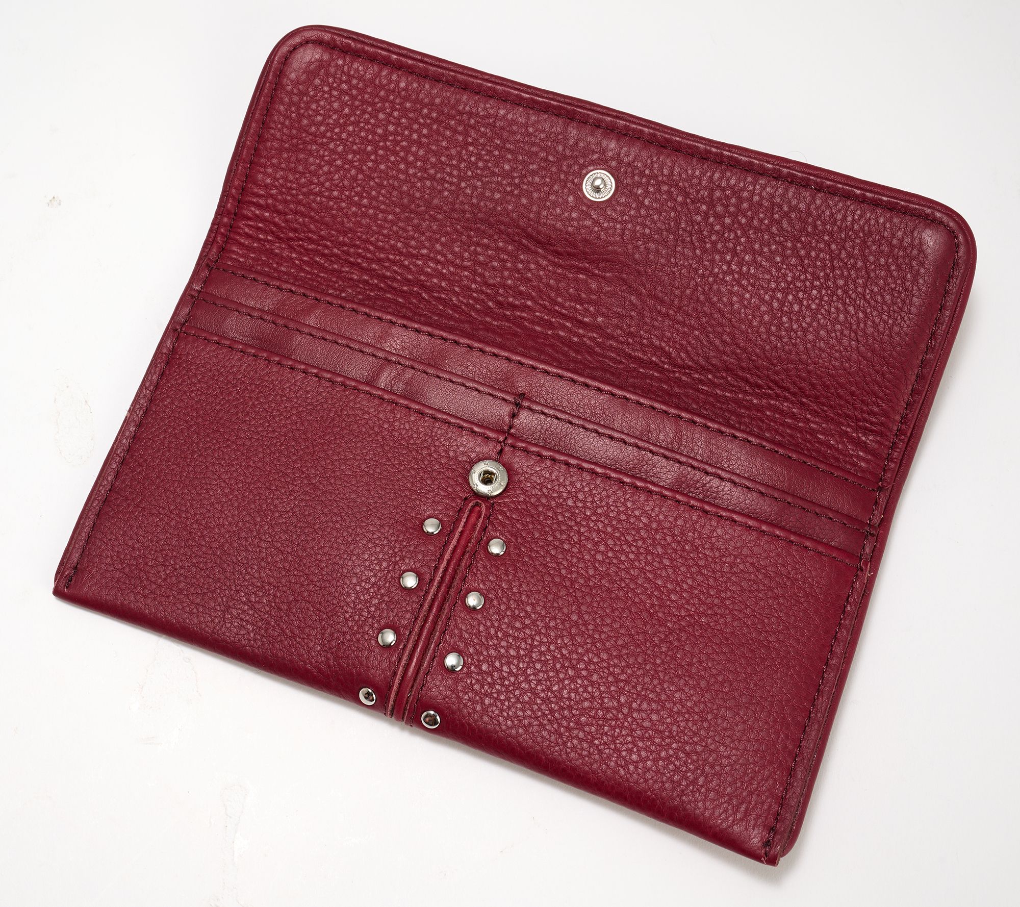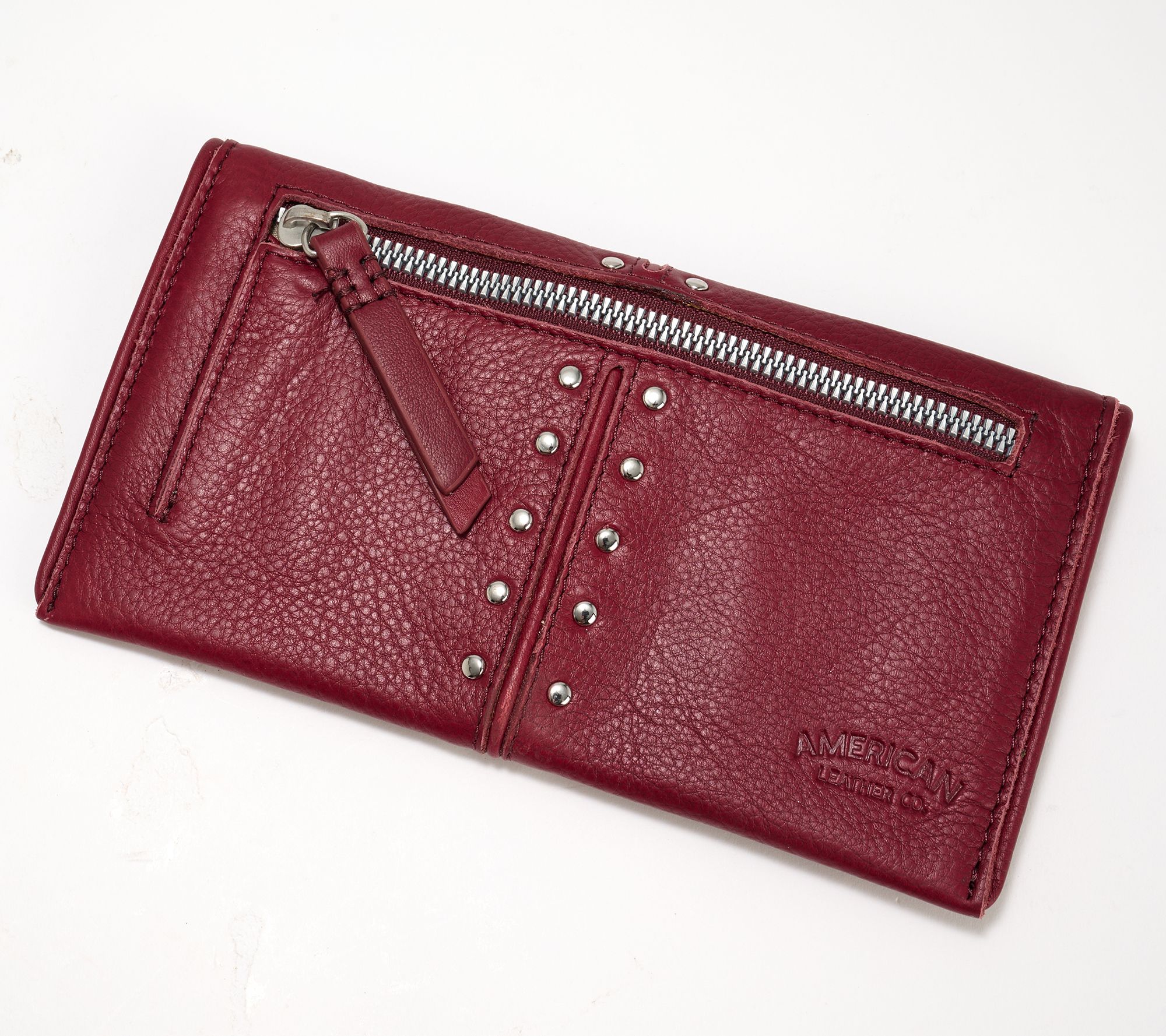 Whether you're grabbing brunch or heading out for an evening stroll, this bifold wallet streamlines your essentials with effortless style. The buttery leather, snap-front detail, and decorative studs give a modern attitude, while handy card slots and a zip compartment make organization simple. Slip it in your favorite bag, and all your must-haves are always close at hand. From American Leather Co.