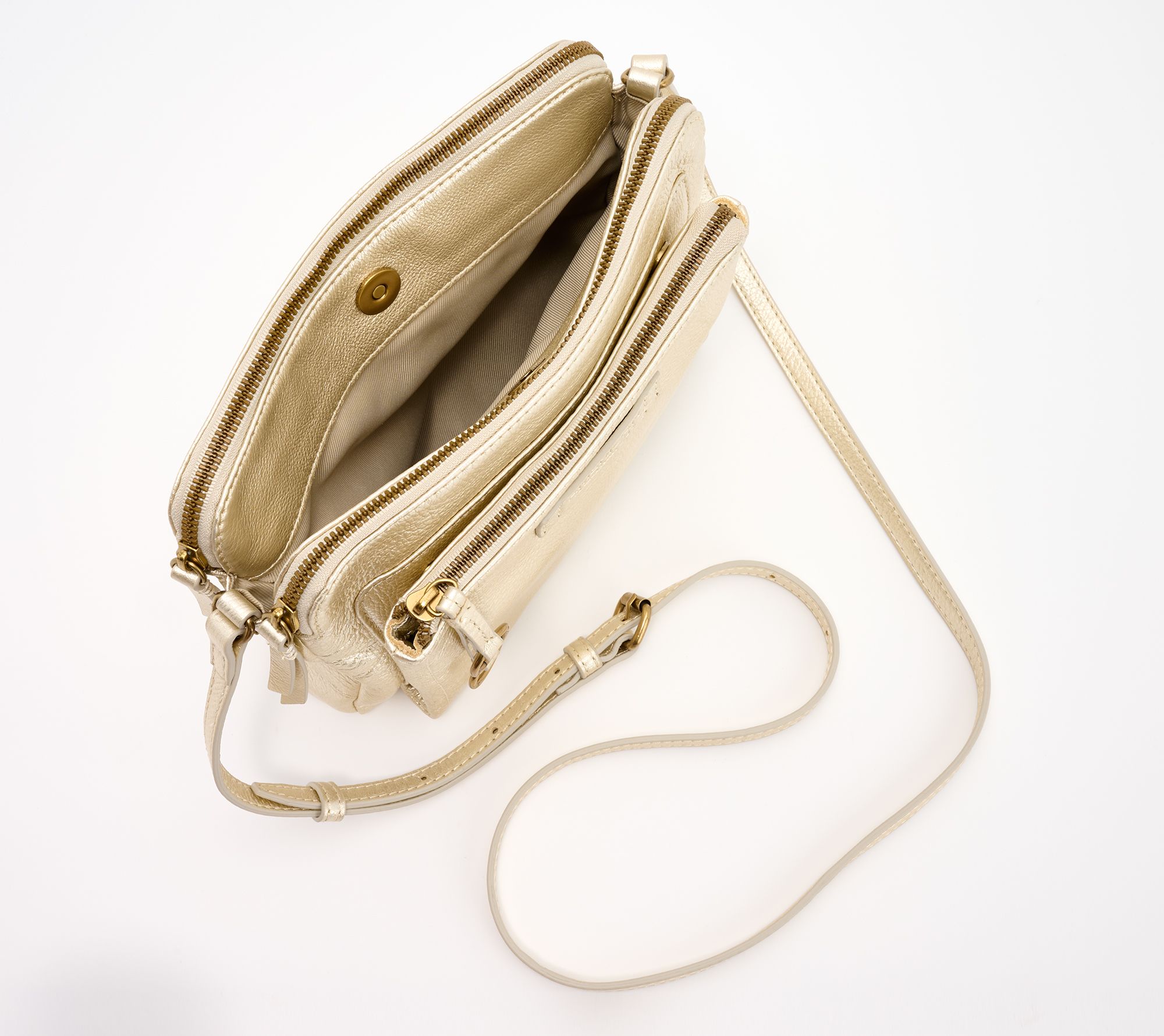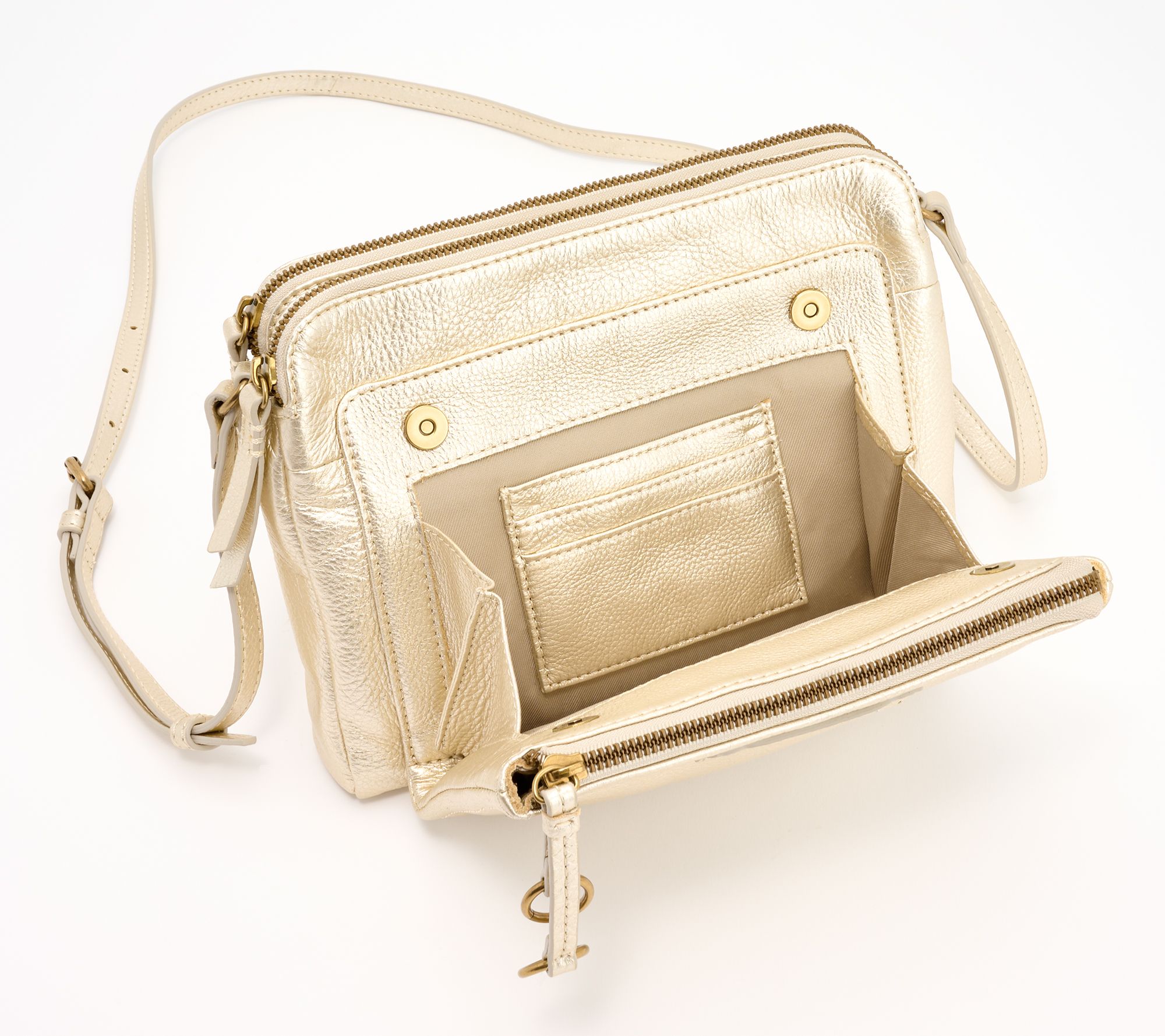 Main zipper entry, front zip pocket, front compartment with magnetic snap, three credit card slots, adjustable crossbody strap