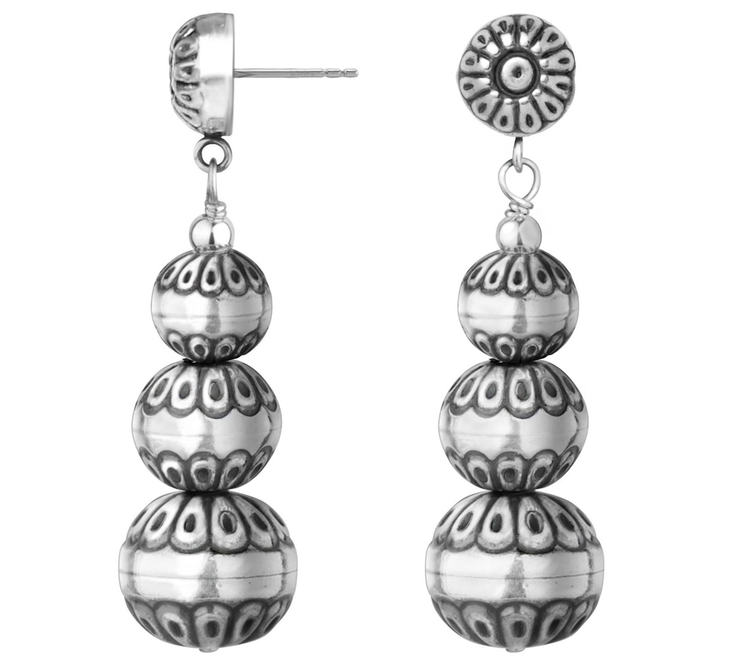 Add a touch of bohemian charm to any outfit by donning these stunning dangle earrings outfitted with sterling silver beads that showcase traditional patterns. From American West.