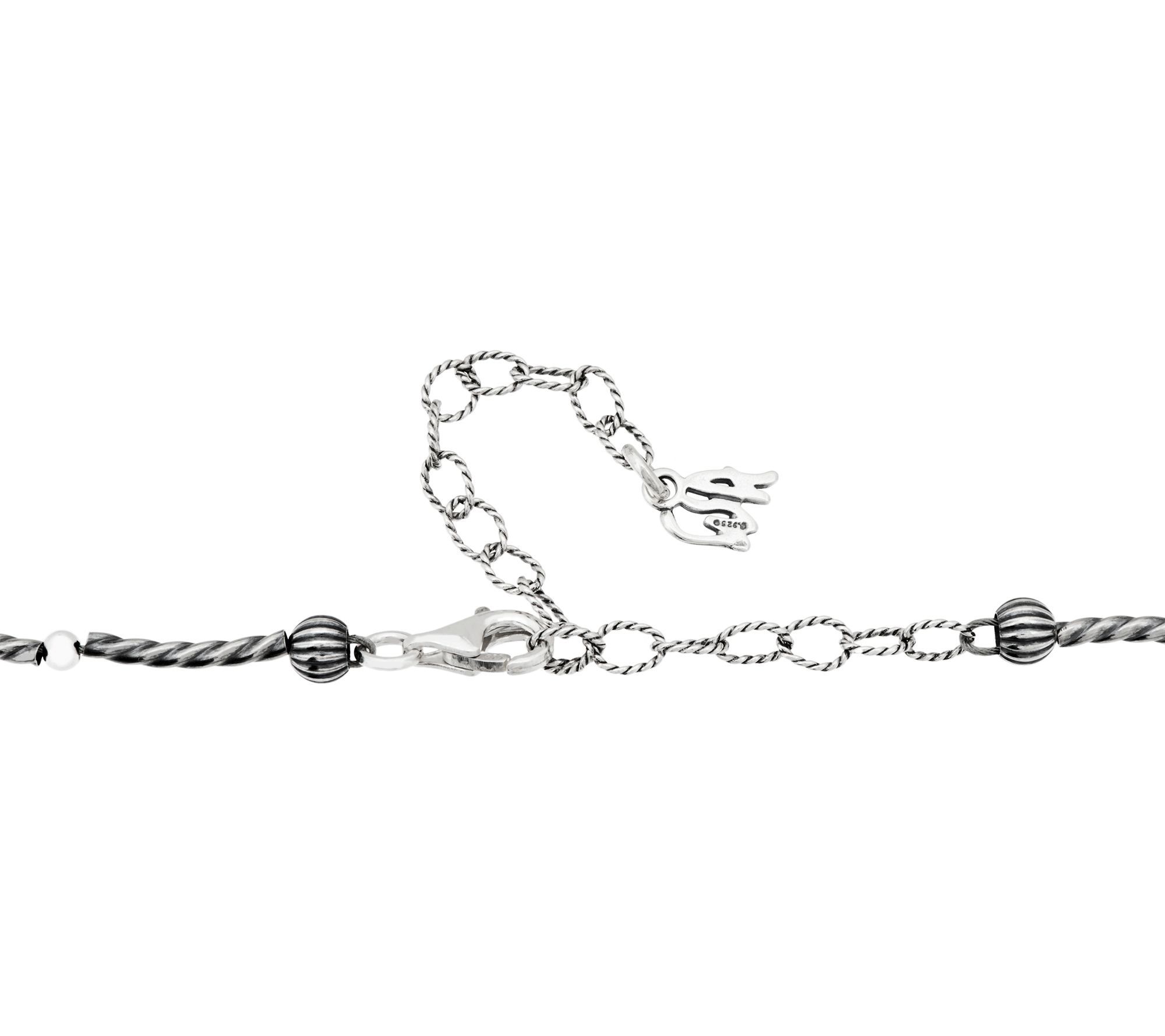 • Round gemstone beads alternate with sterling silver twist bars and beads; oxidized