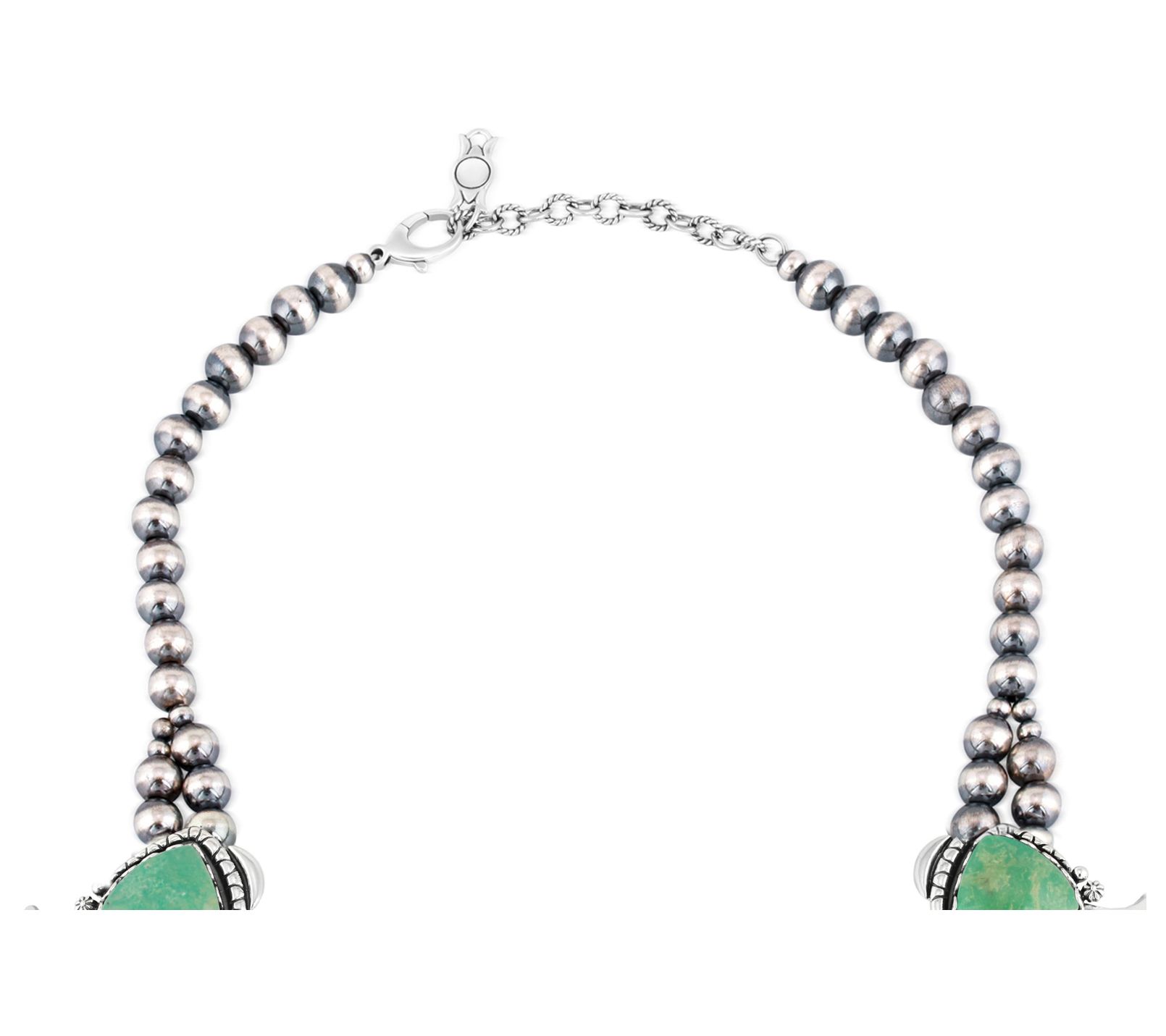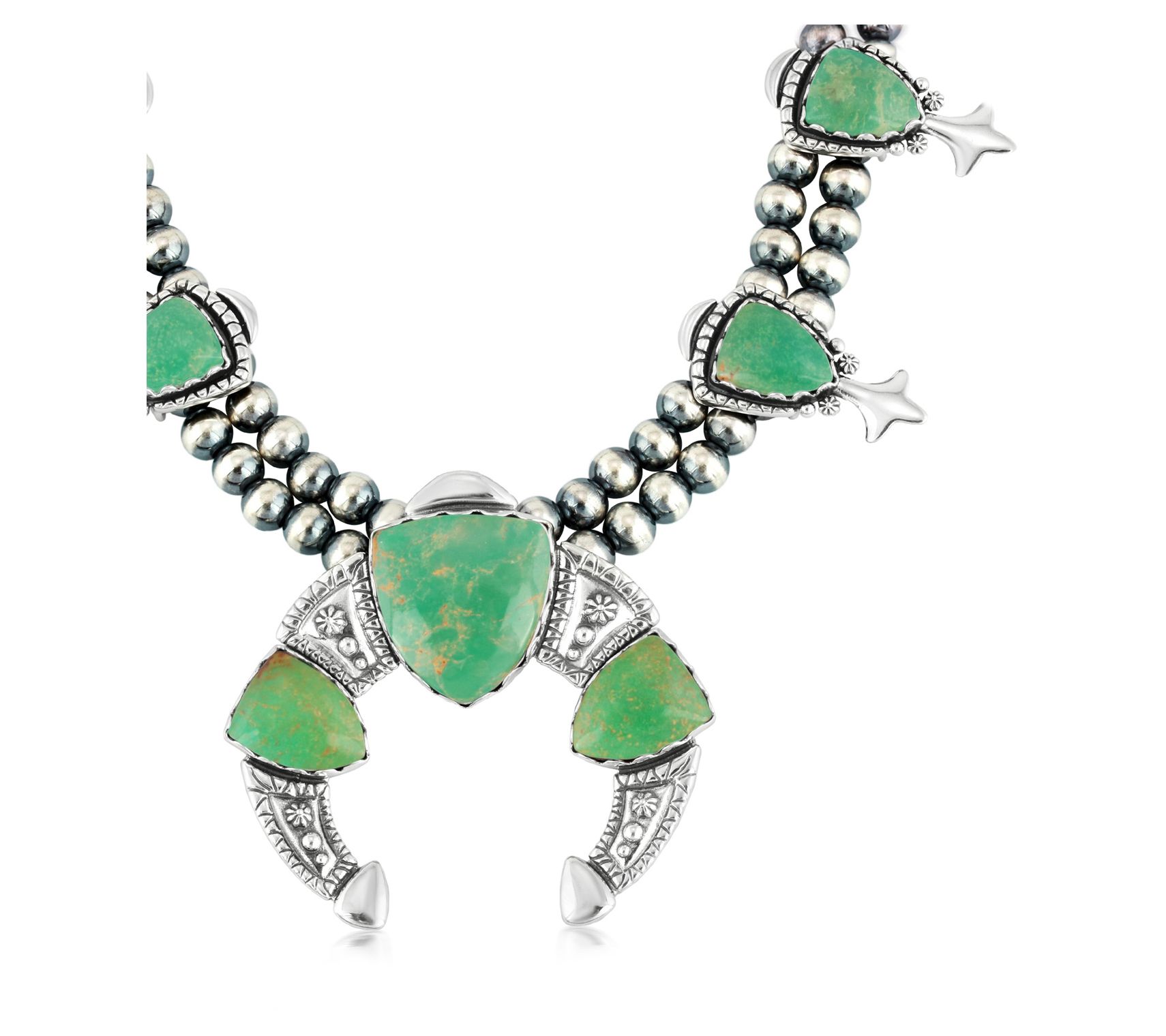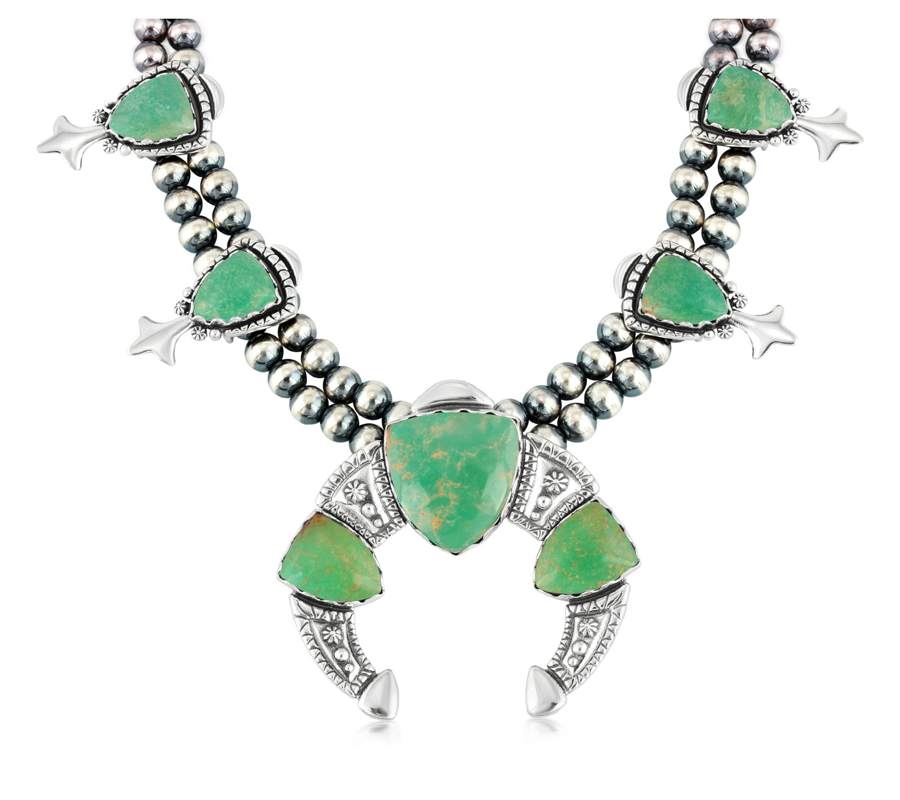 • Squash blossom design with seven shield-shaped green turquoise cabochons and center naja-design gemstone; front double row of striped beads graduates to a single row; oxidized finish