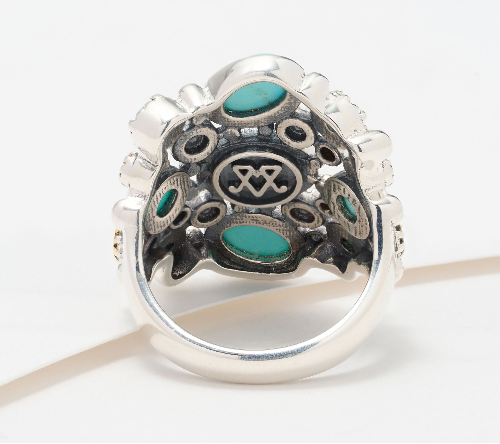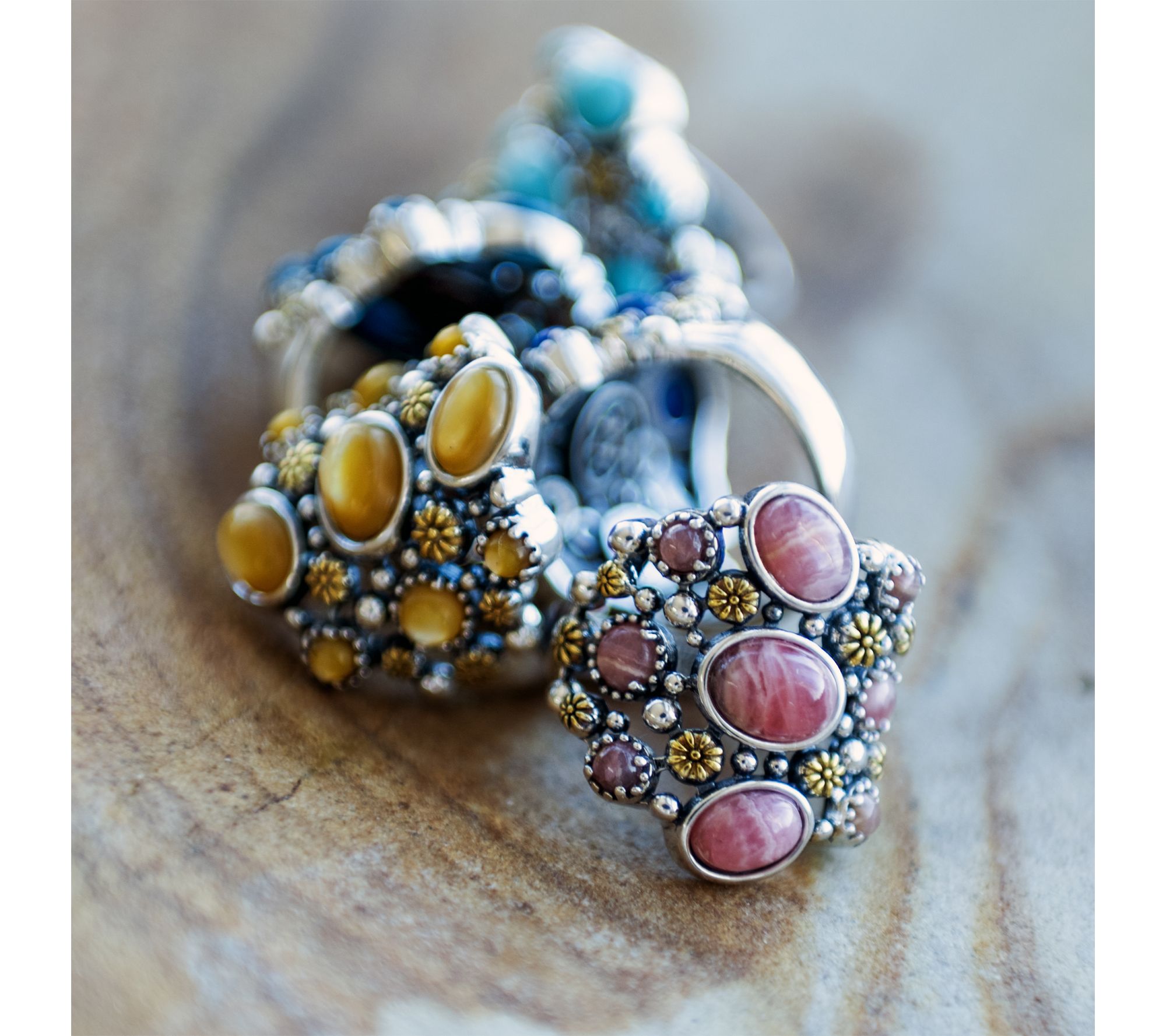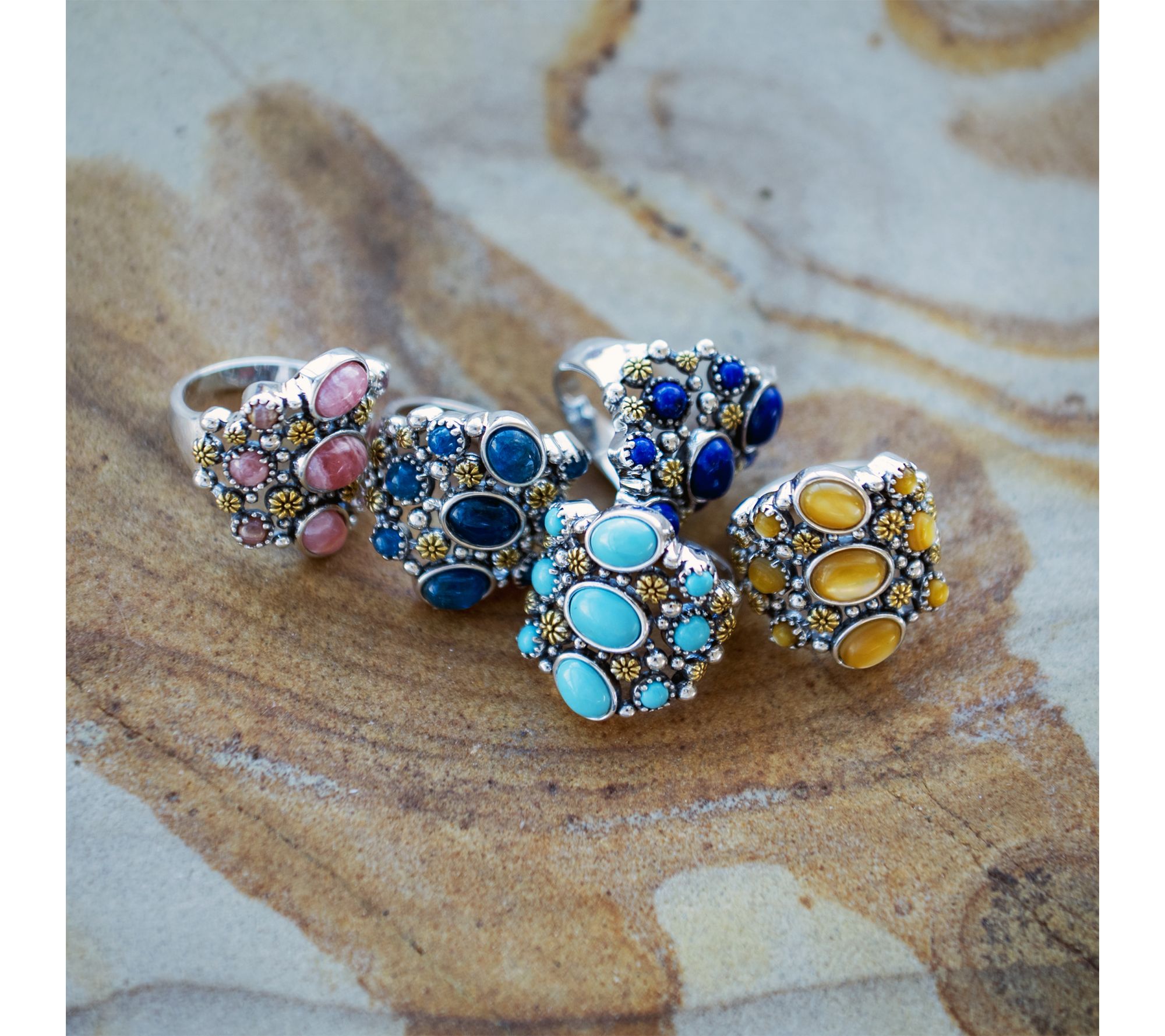 Bring a burst of color to any look with this sterling silver and 14K gold-plated ring, featuring nine gemstone cabochons artfully arranged in a freeform design. Accented with gleaming concha flowers, it's a cheerful accessory that brightens casual outfits and adds a lively note to dressier occasions. From American West Jewelry.