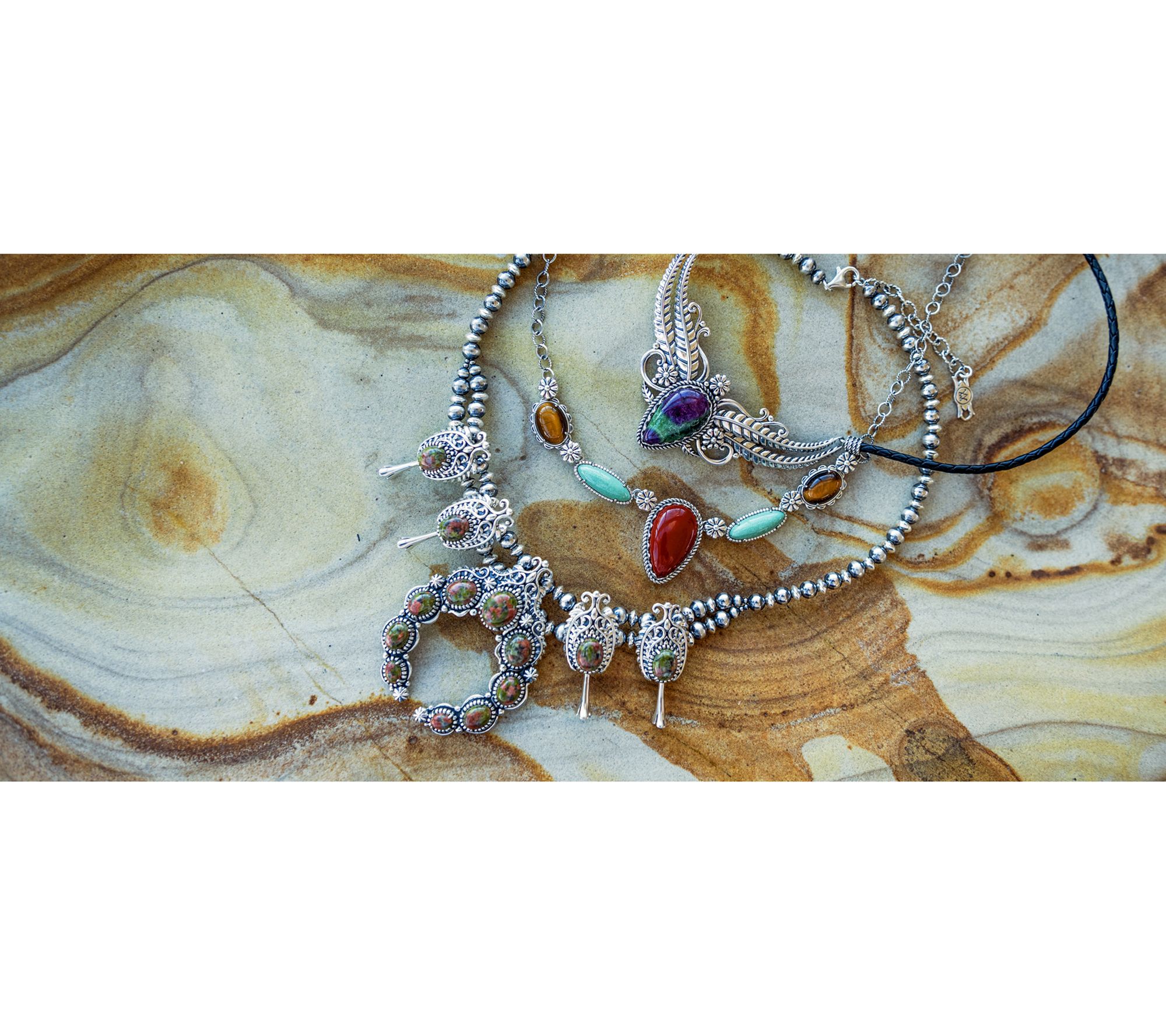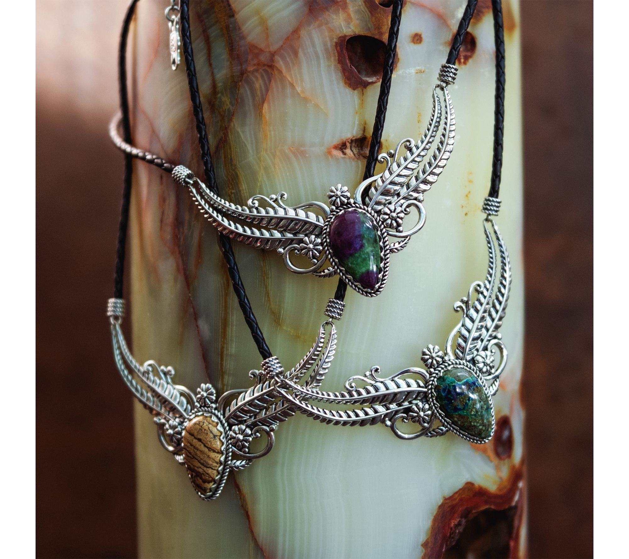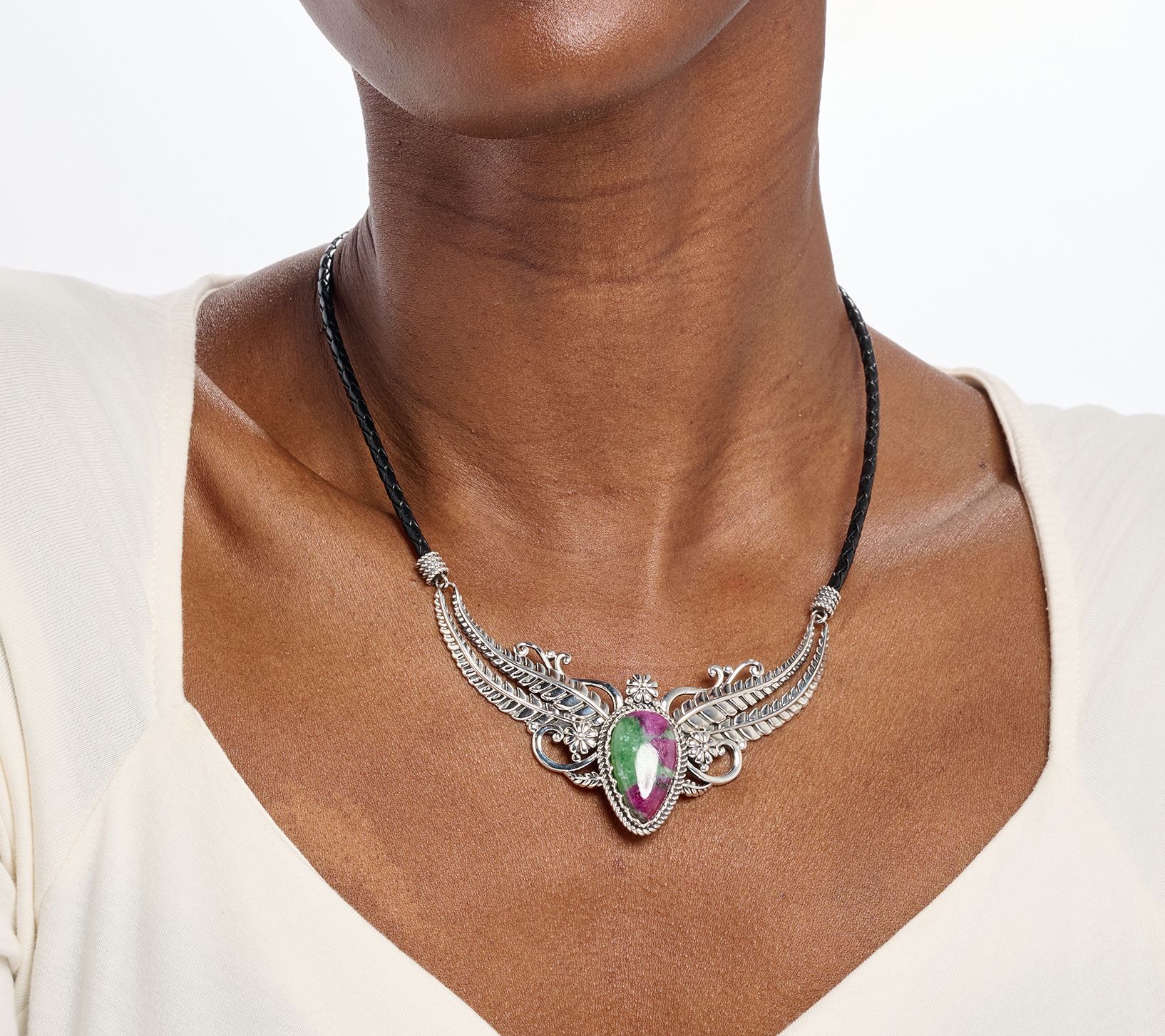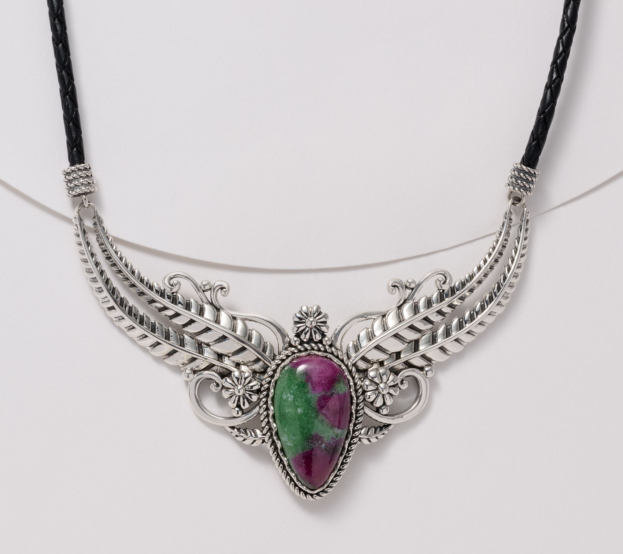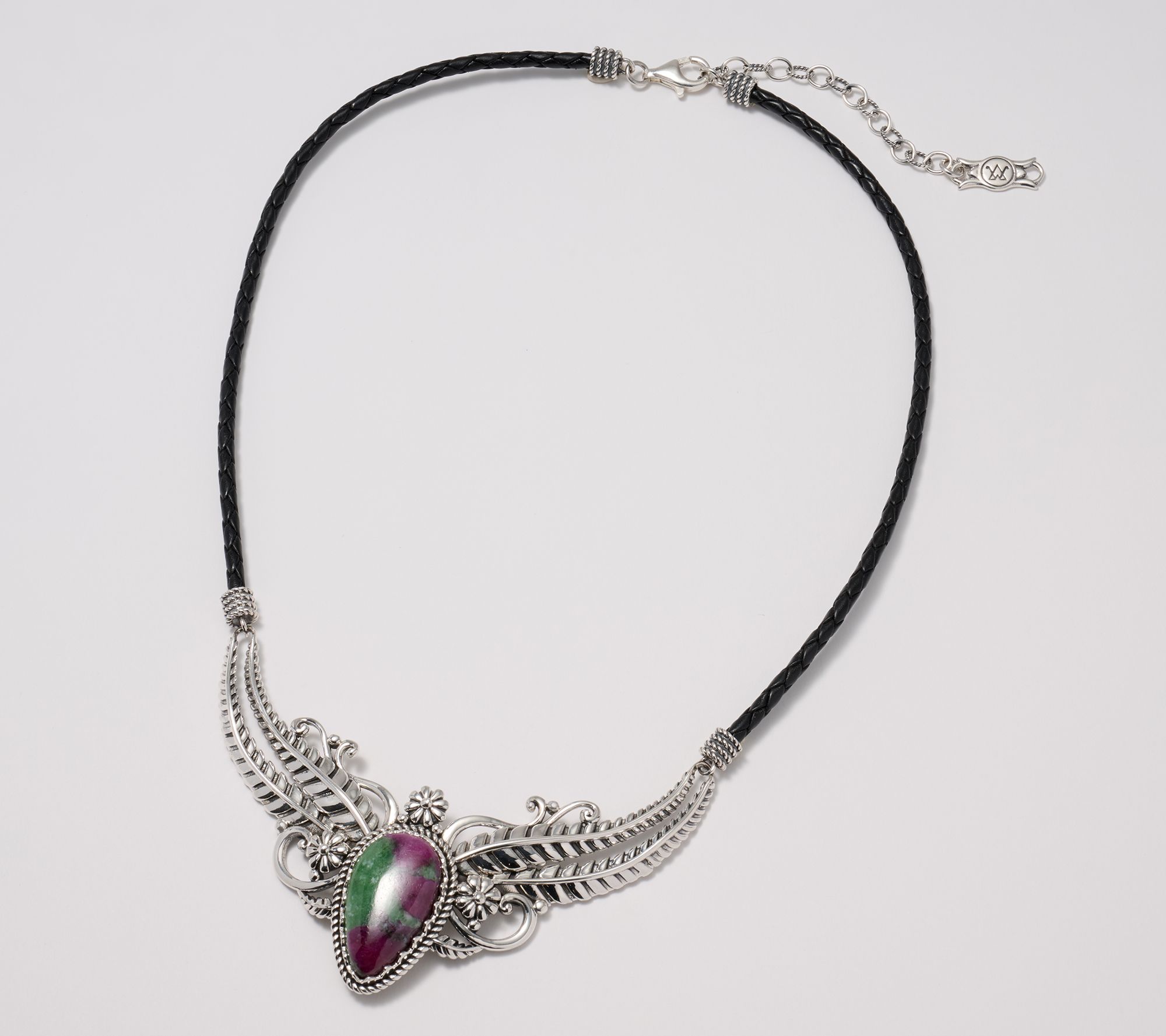Wow moment. A statement necklace that feels at home for daytime events or nights out, this gemstone necklace features a vibrant pear-shaped cabochon tucked into a center plaque with sculpted leaves, vines, and concha flower accents. The glossy gemstone and oxidized sterling silver pair beautifully with both casual tops and dressier outfits, all strung on a sleek braided leather cord. From American West Jewelry.