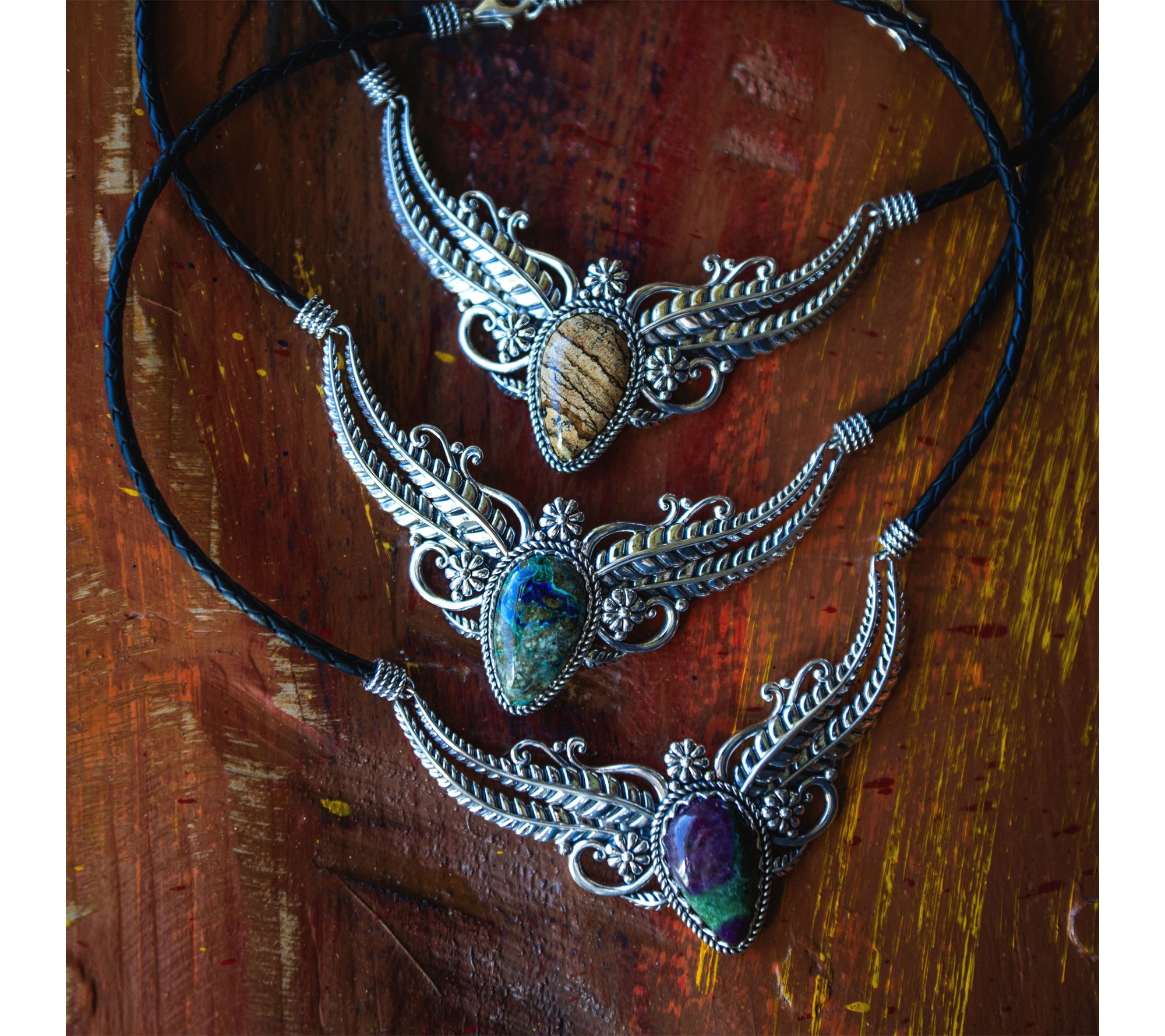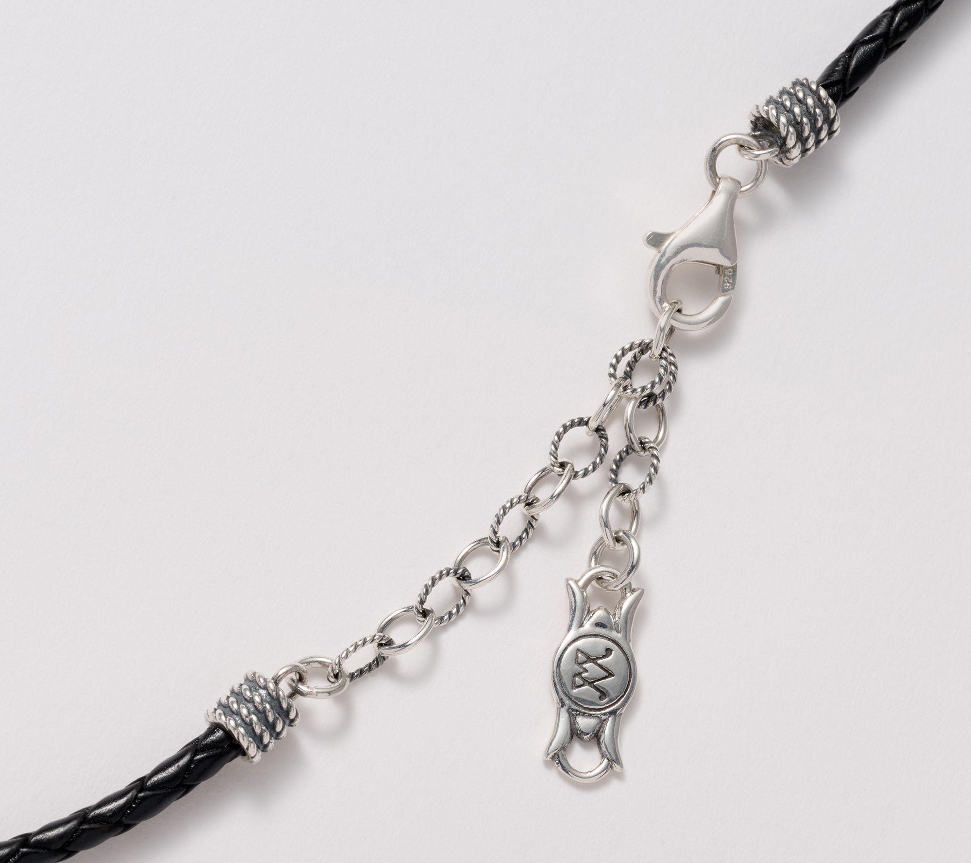Plaque design with pear-shaped gemstone cabochon in a serrated bezel; leaf, vine, and concha flower accents; oxidized finish; black braided leather cord; logo tag