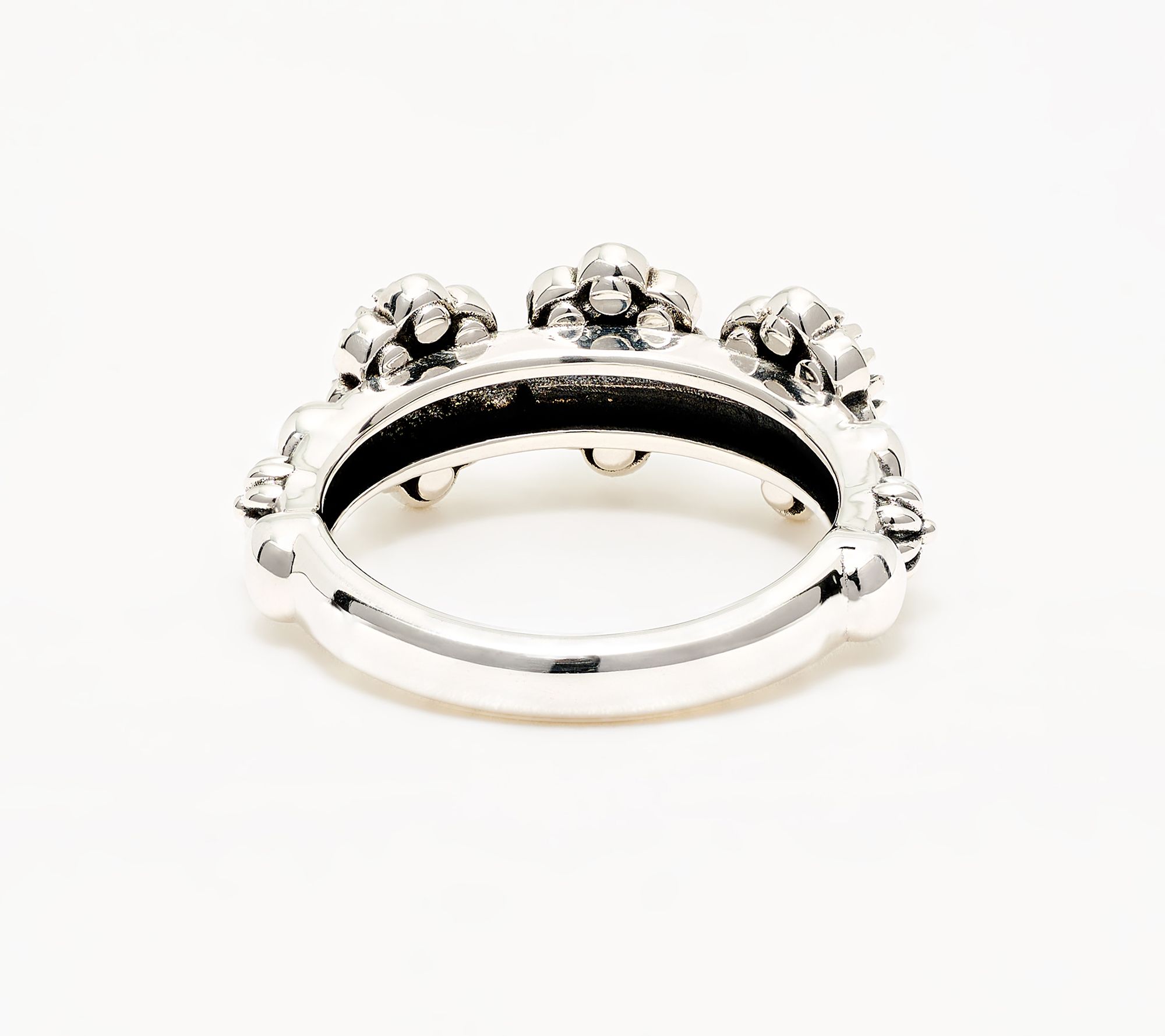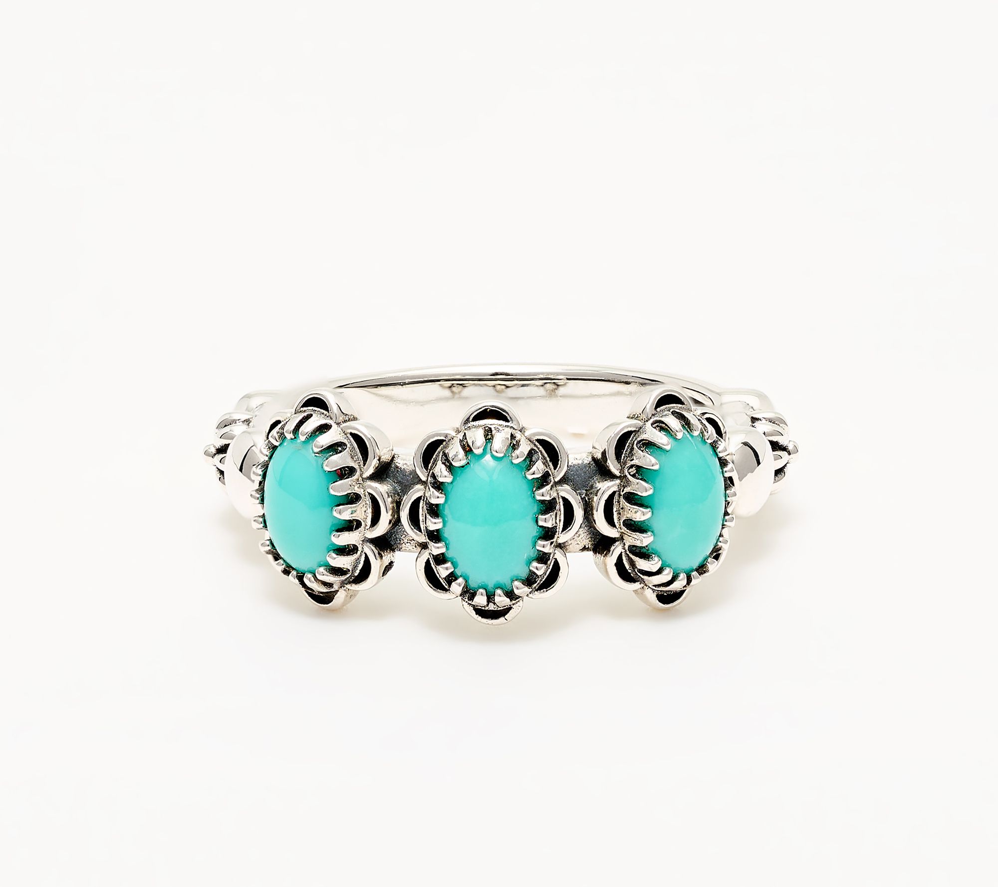 Count on this three-gemstone ring to reflect your passion for Southwestern design and attention to detail. From the intricately scalloped bezel borders to the beautiful blend of concha and bead accents on a smooth band, it's a piece that sparks conversation yet is so comfortable to wear. From American West Jewelry.