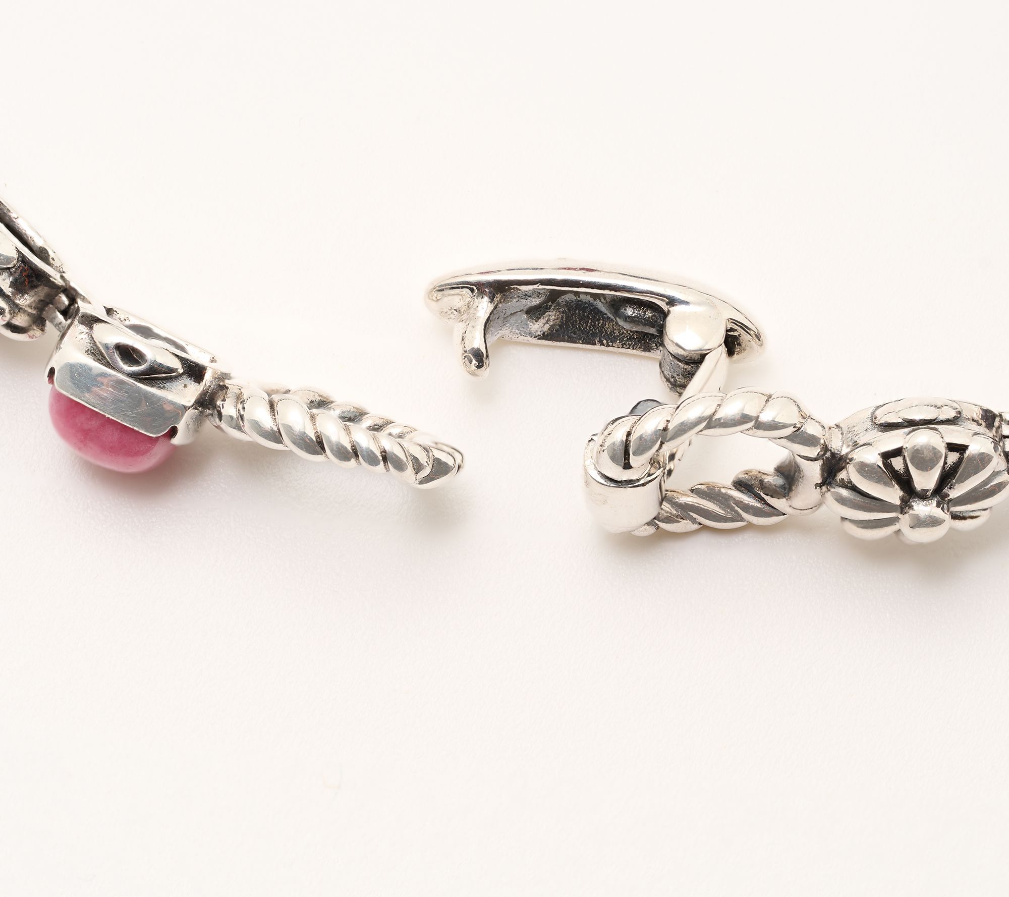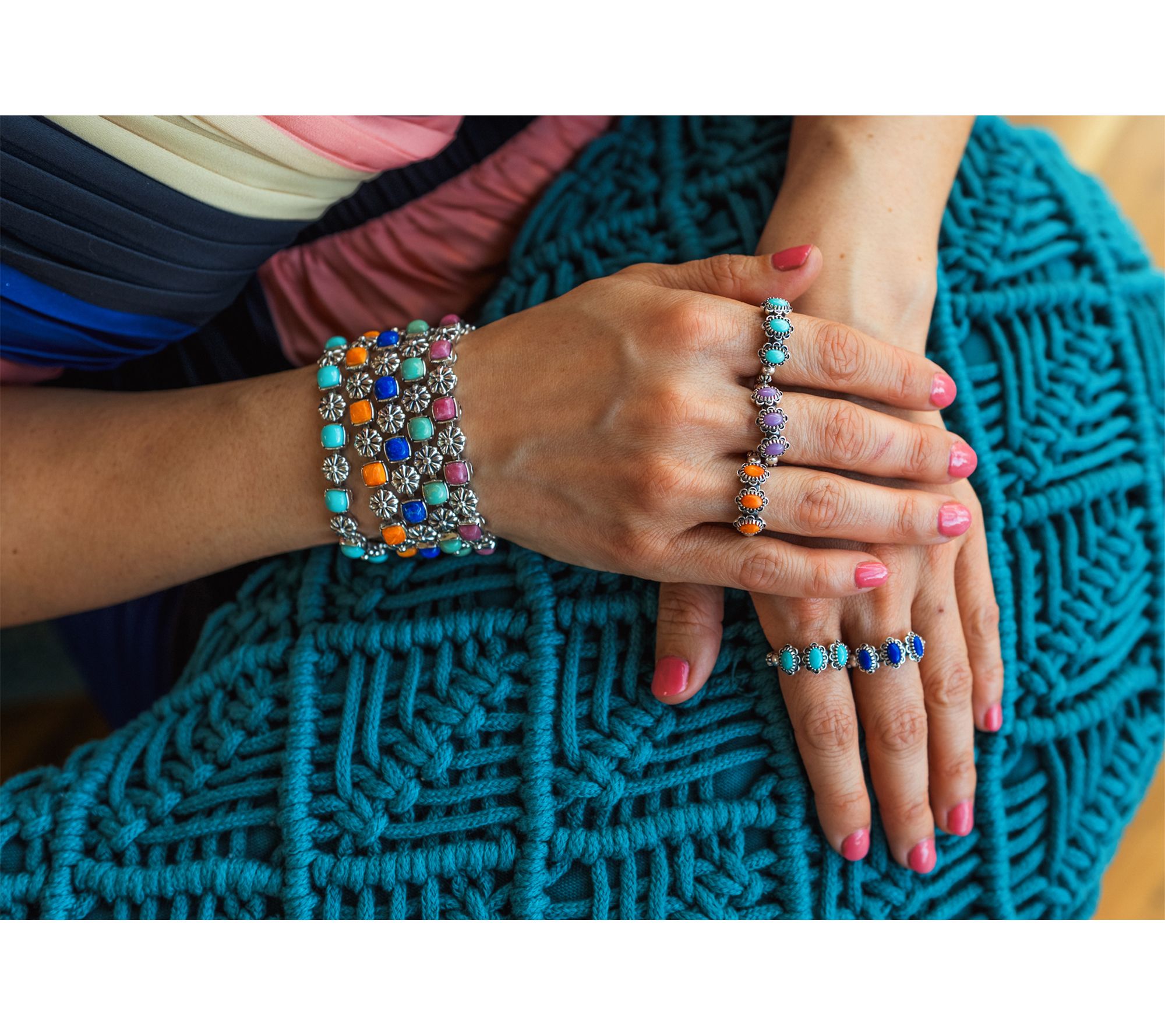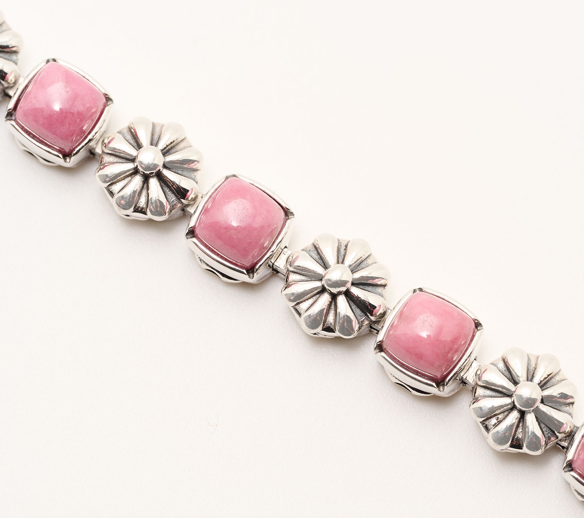 Pair your favorite outfits with this sterling silver tennis bracelet featuring a lineup of vibrant cushion-cut gemstone cabochons framed by exquisitely detailed concha flowers. The oxidized finish and secure fold-over clasp add both style and confidence, making it a versatile accent from casual days to festive evenings. From American West Jewelry.