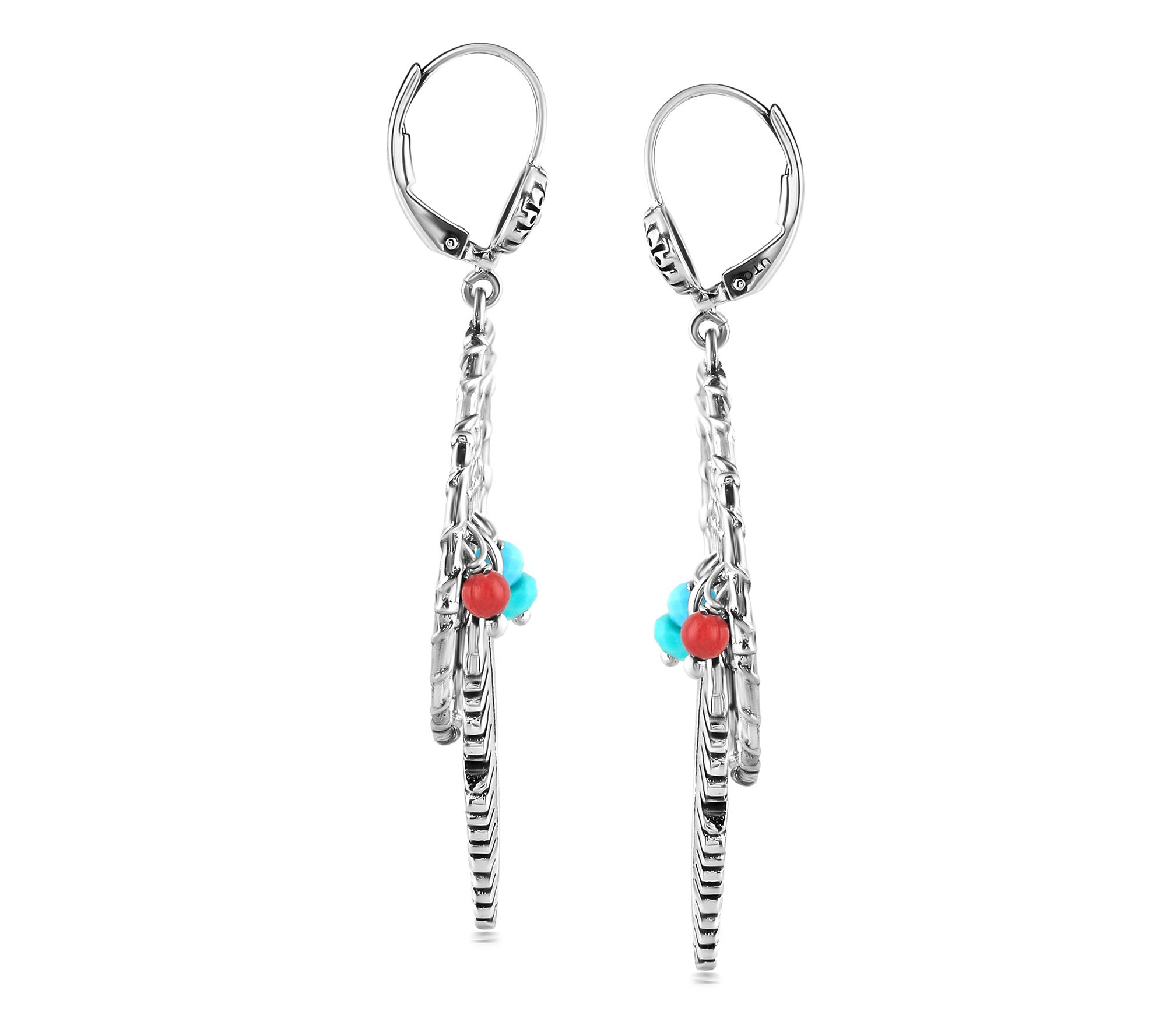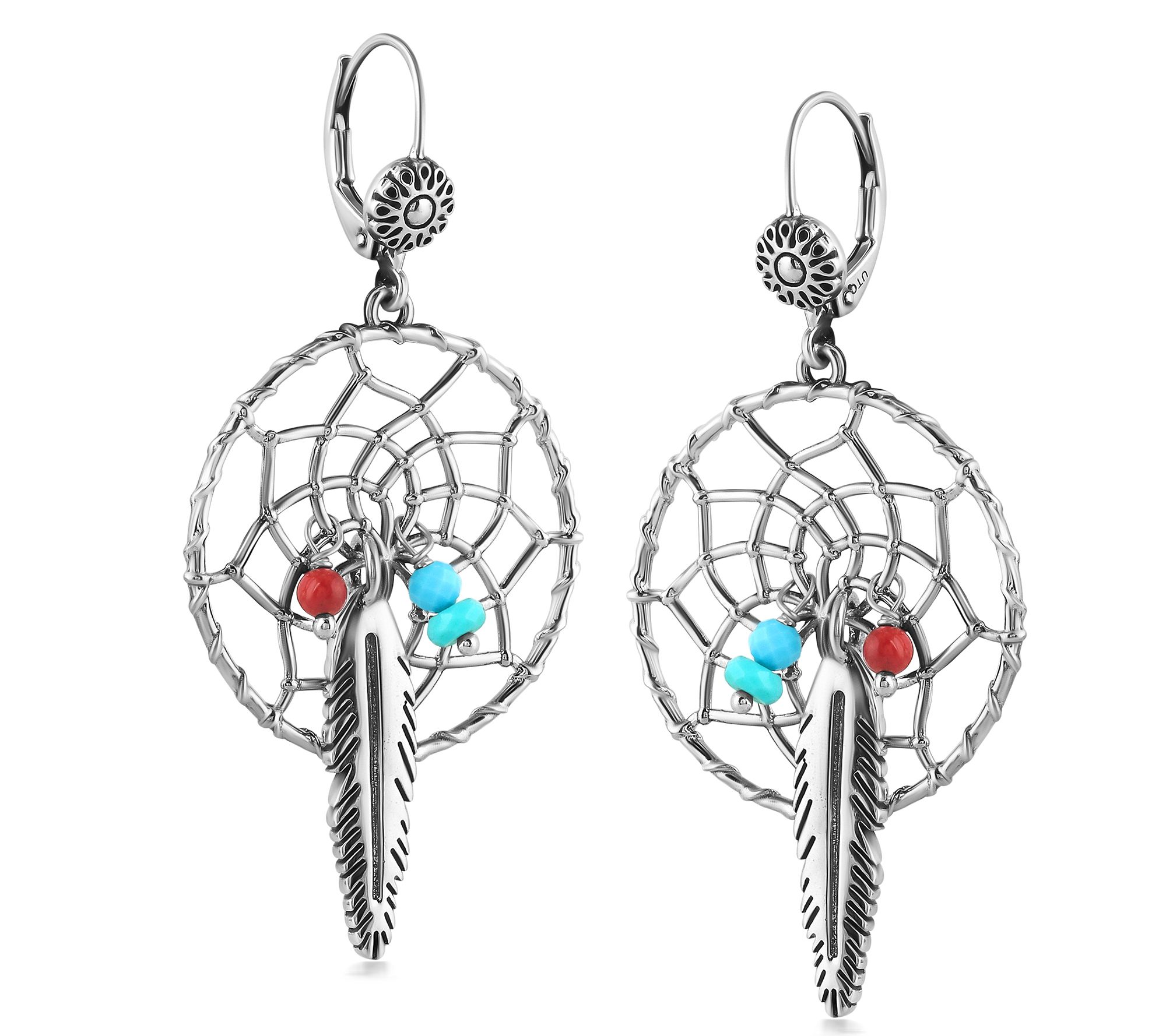 Dream catcher design with feather detail; turquoise and red coral beads; oxidized finish