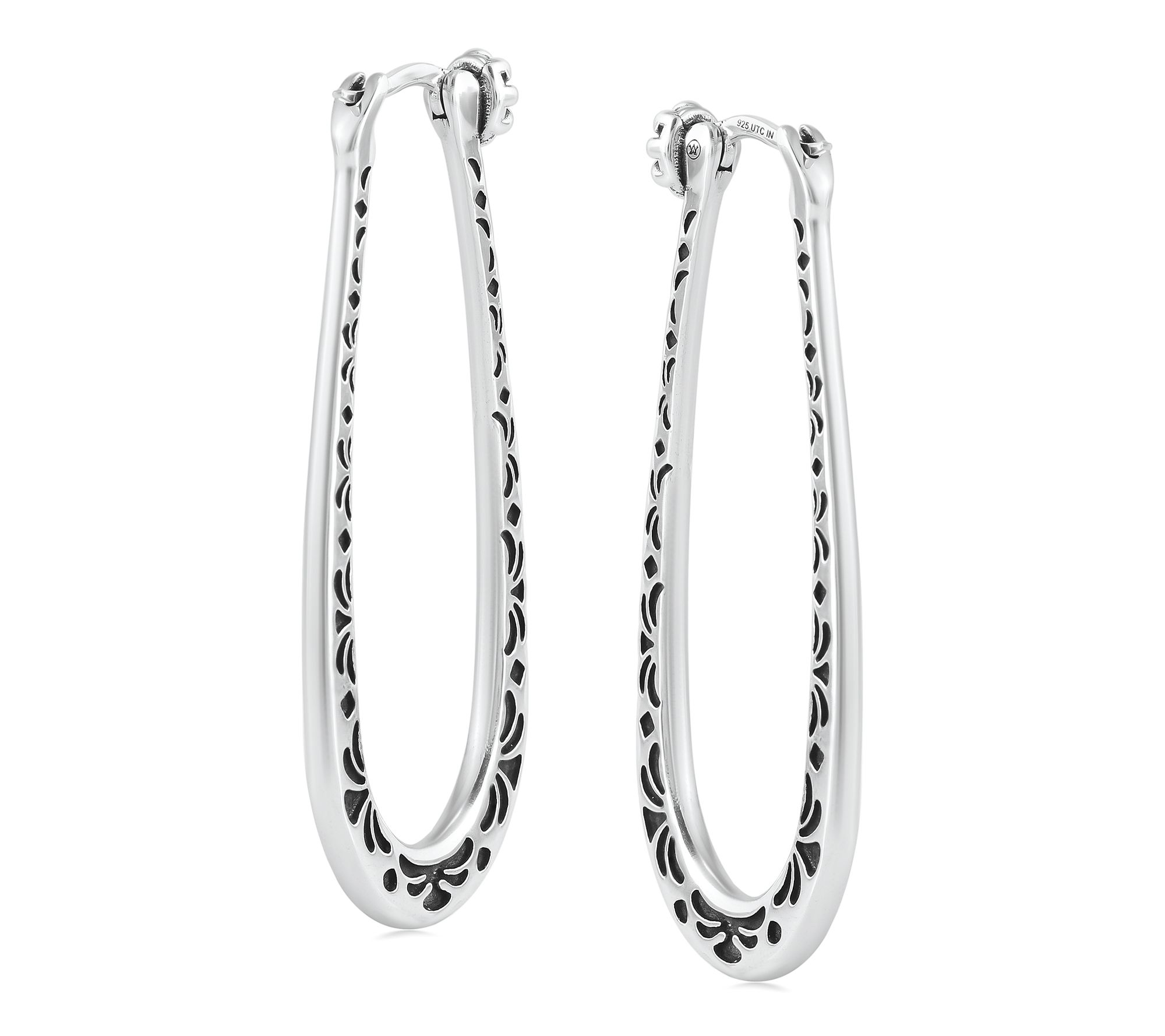 American West Sterling Elongated Oval Etched Hoop Earrings