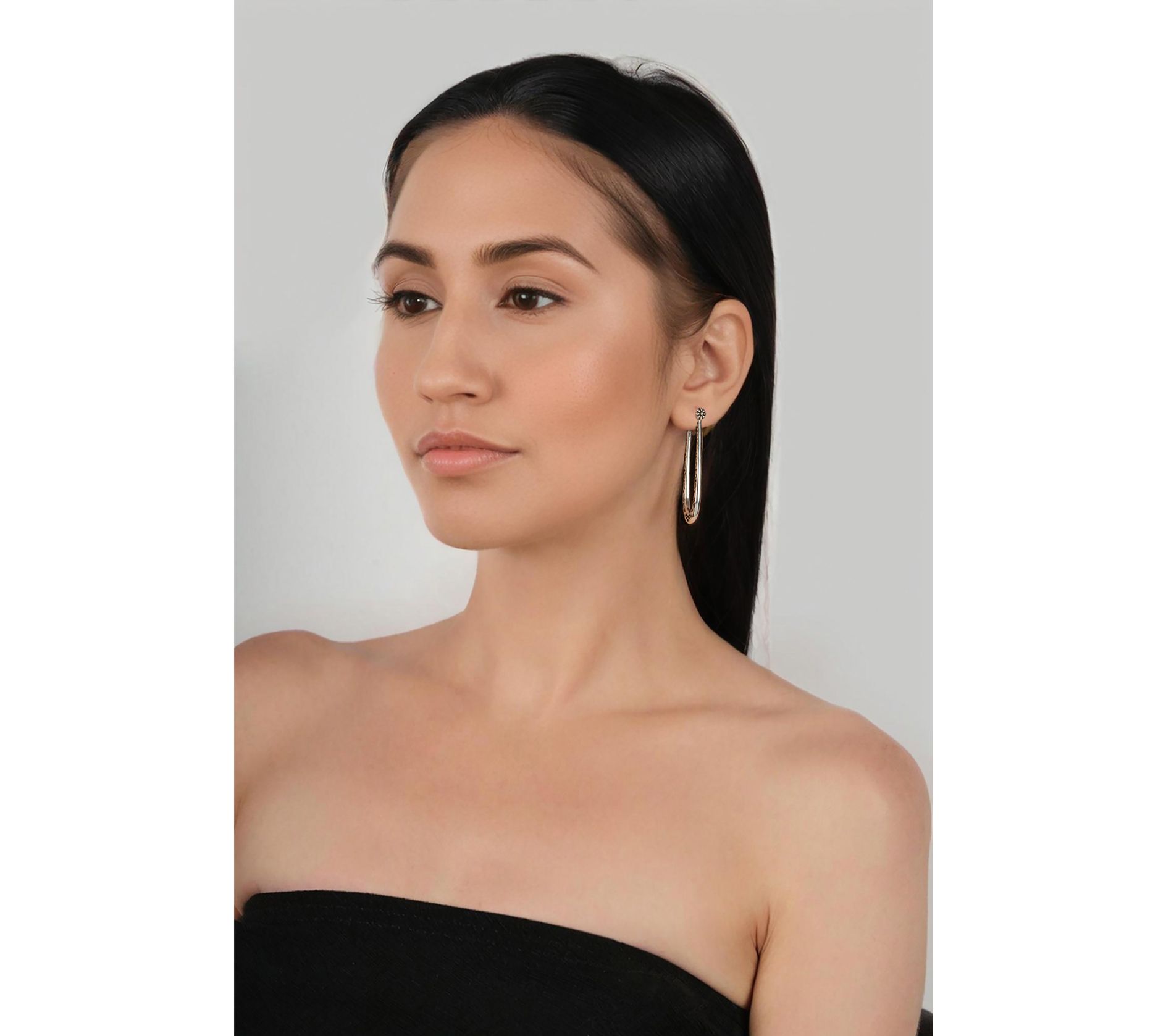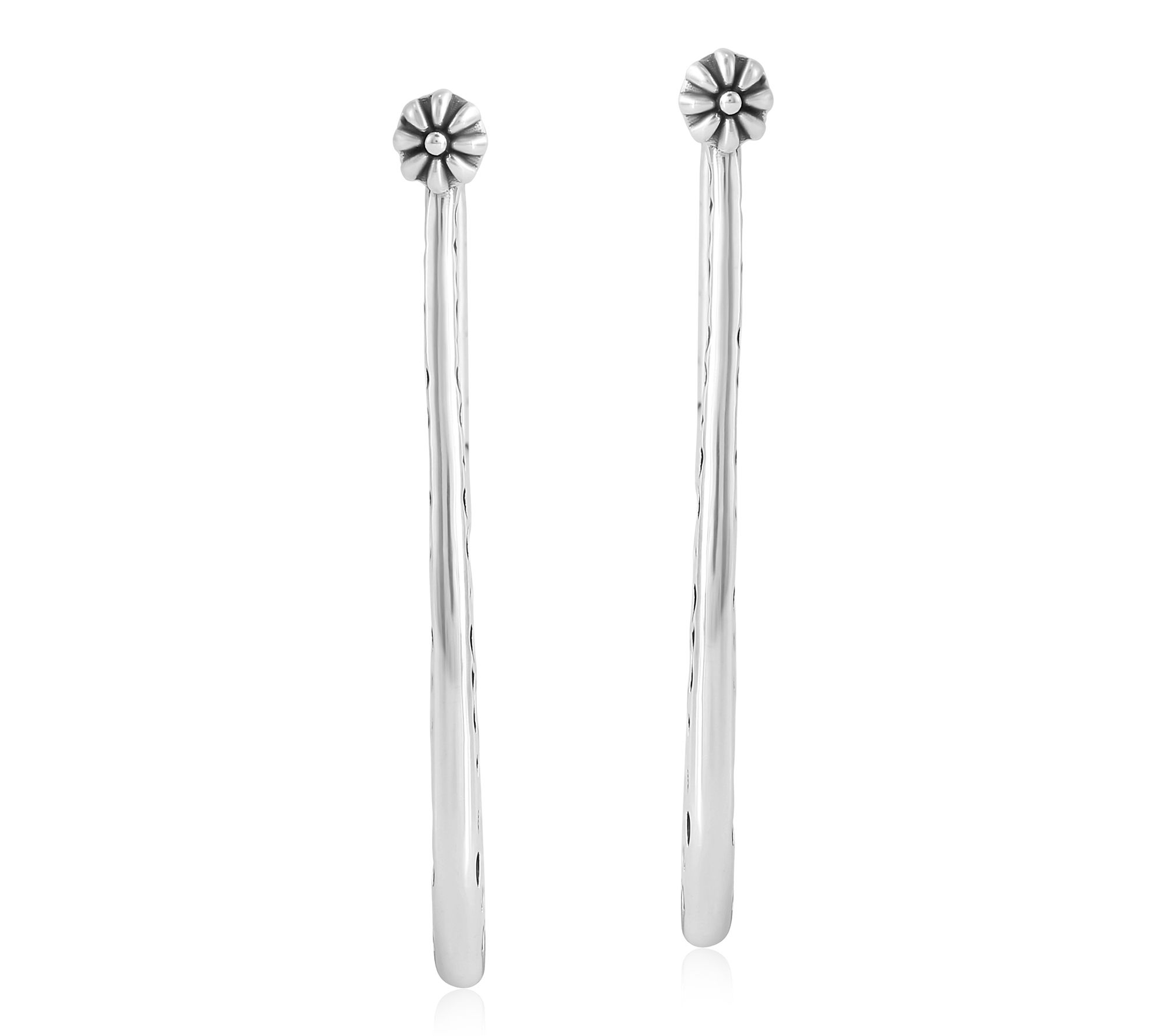 • Elongated oval hoop design; etched and oxidized finishes; concha flower accents