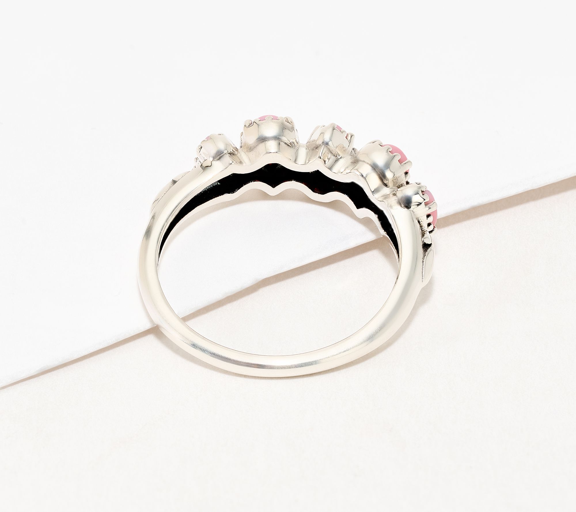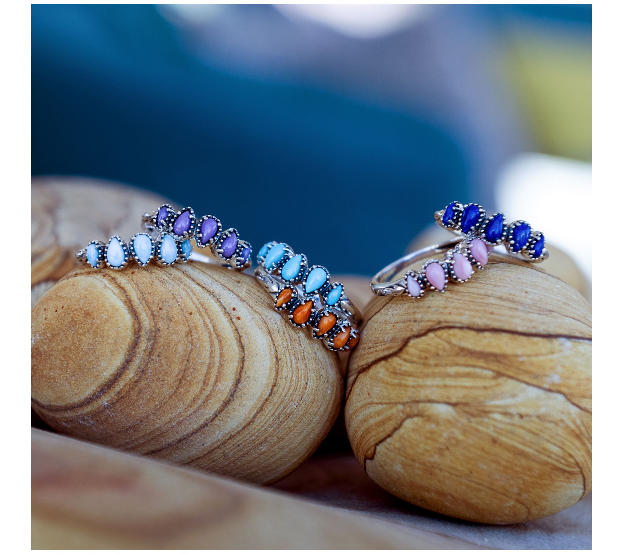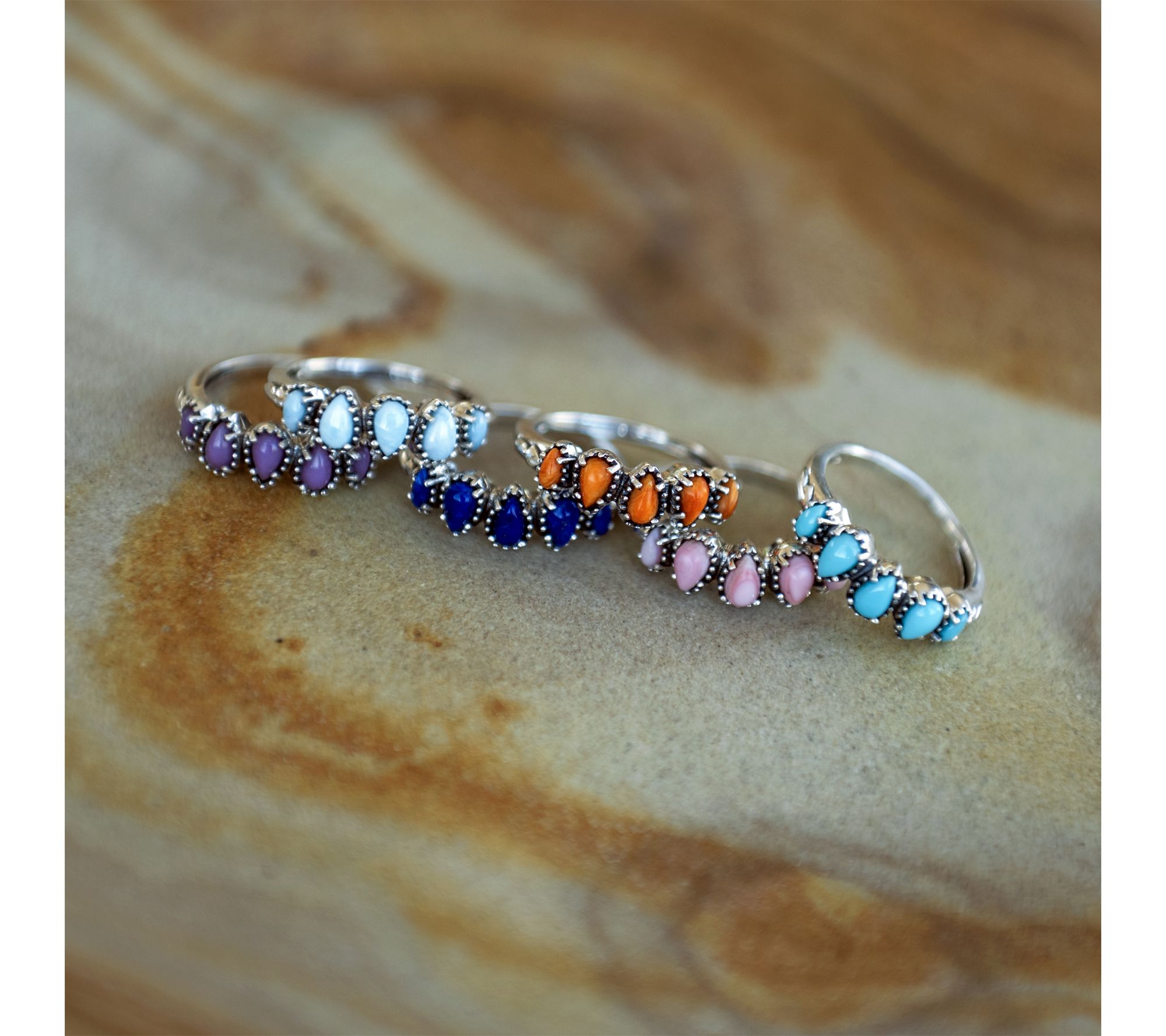 Make every gesture feel memorable with this sterling silver band ring, where five pear-shaped cabochons are arranged in alternating directions to catch the eye. The polished finish and linear setting create a playful, vibrant look ideal for dressing up your day or accenting a special evening. From American West Jewelry.