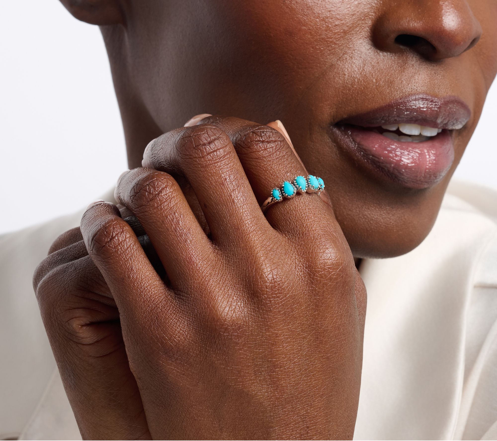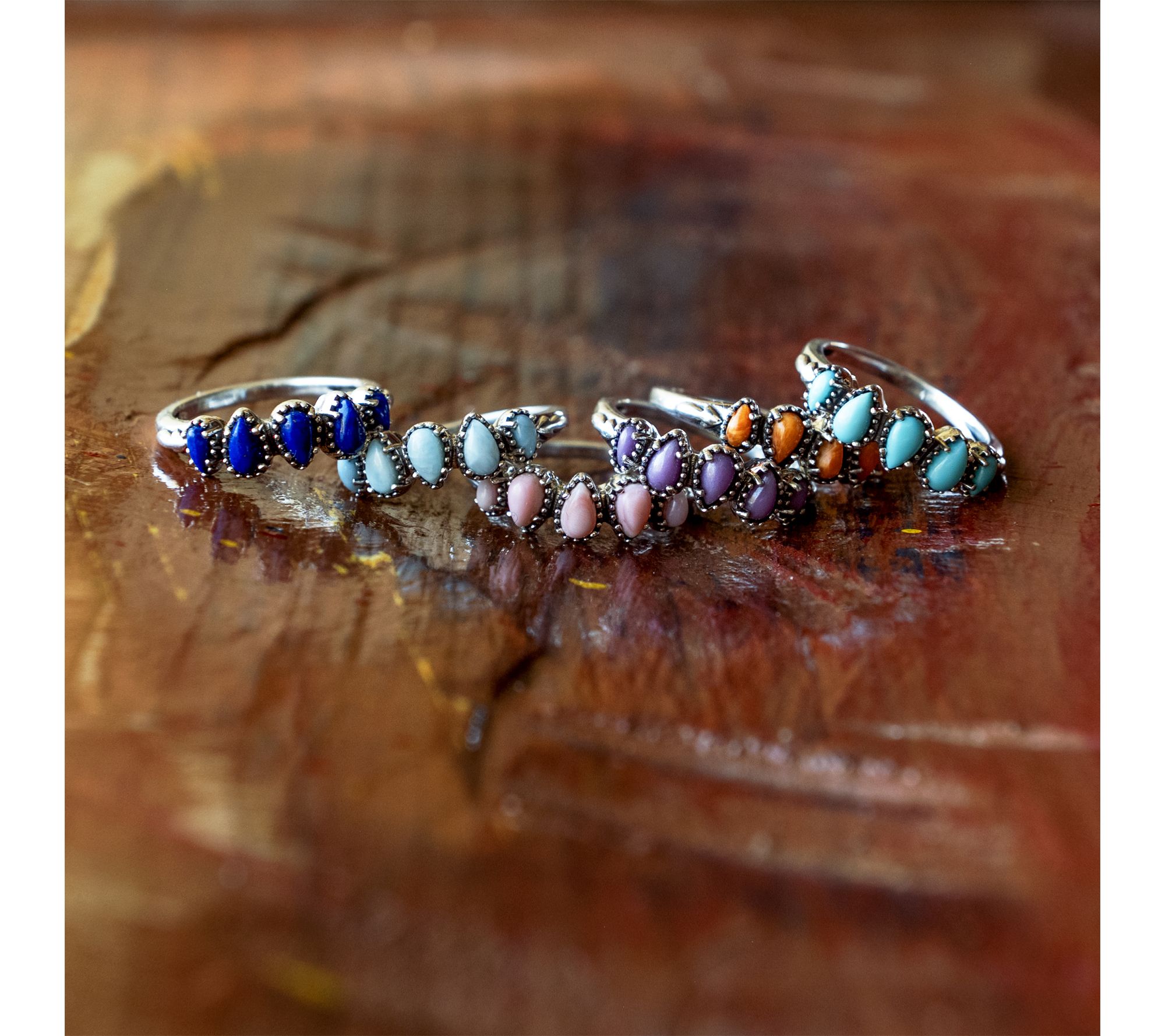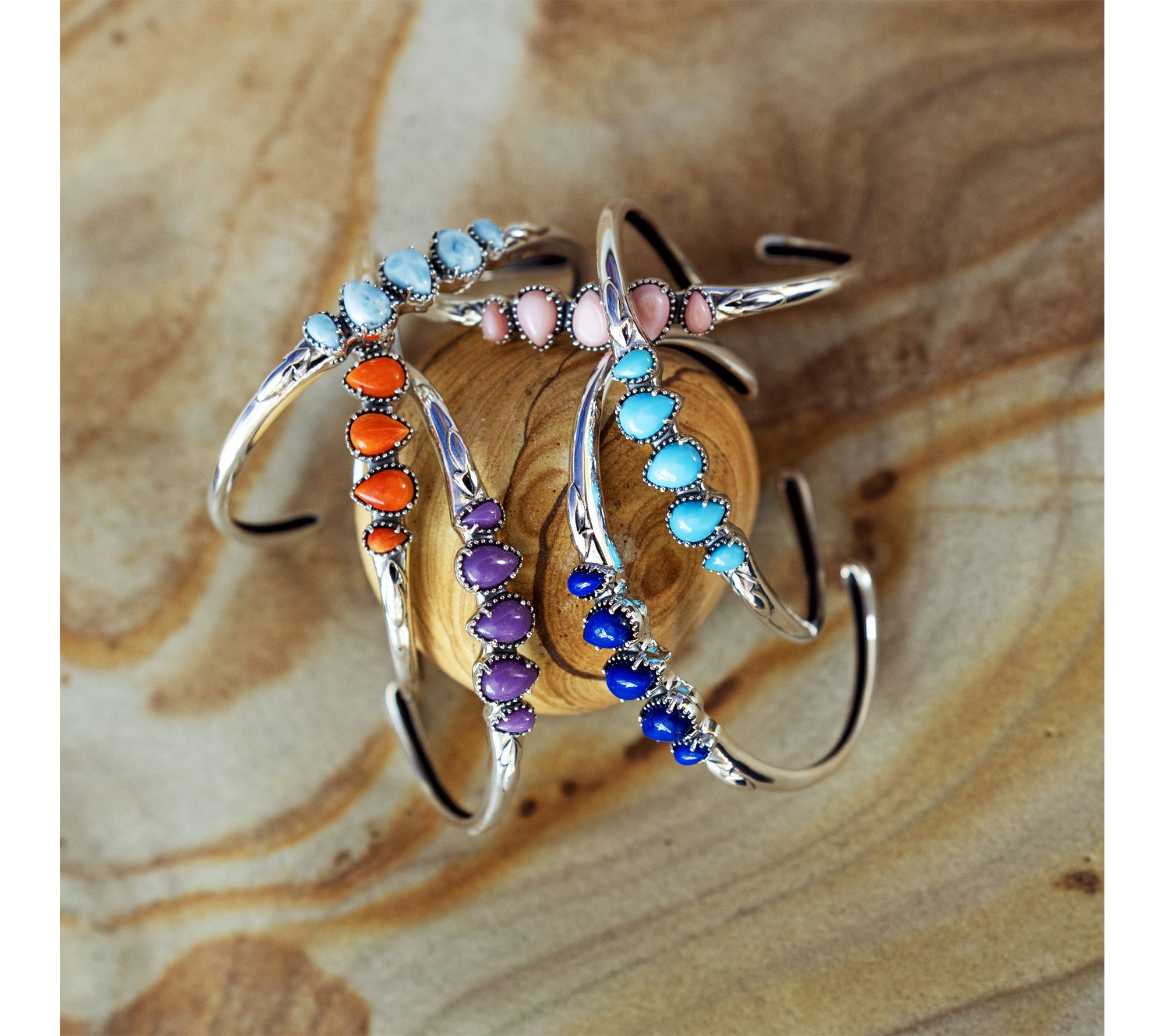 Make every gesture feel memorable with this sterling silver band ring, where five pear-shaped cabochons are arranged in alternating directions to catch the eye. The polished finish and linear setting create a playful, vibrant look ideal for dressing up your day or accenting a special evening. From American West Jewelry.