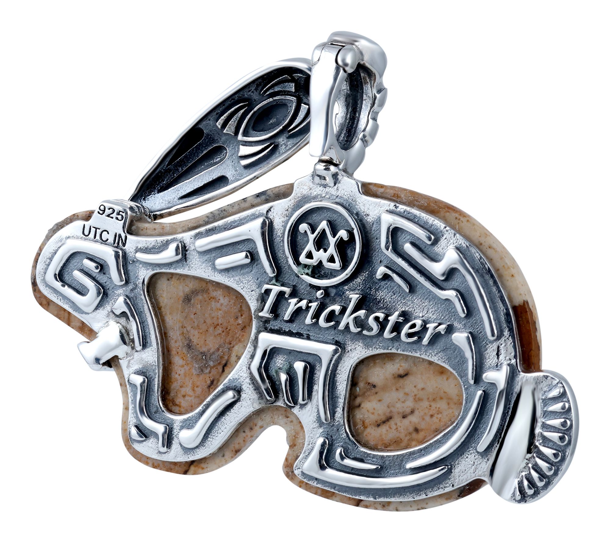 Rabbit-shaped gemstone cabochon with etched details; oxidized finish