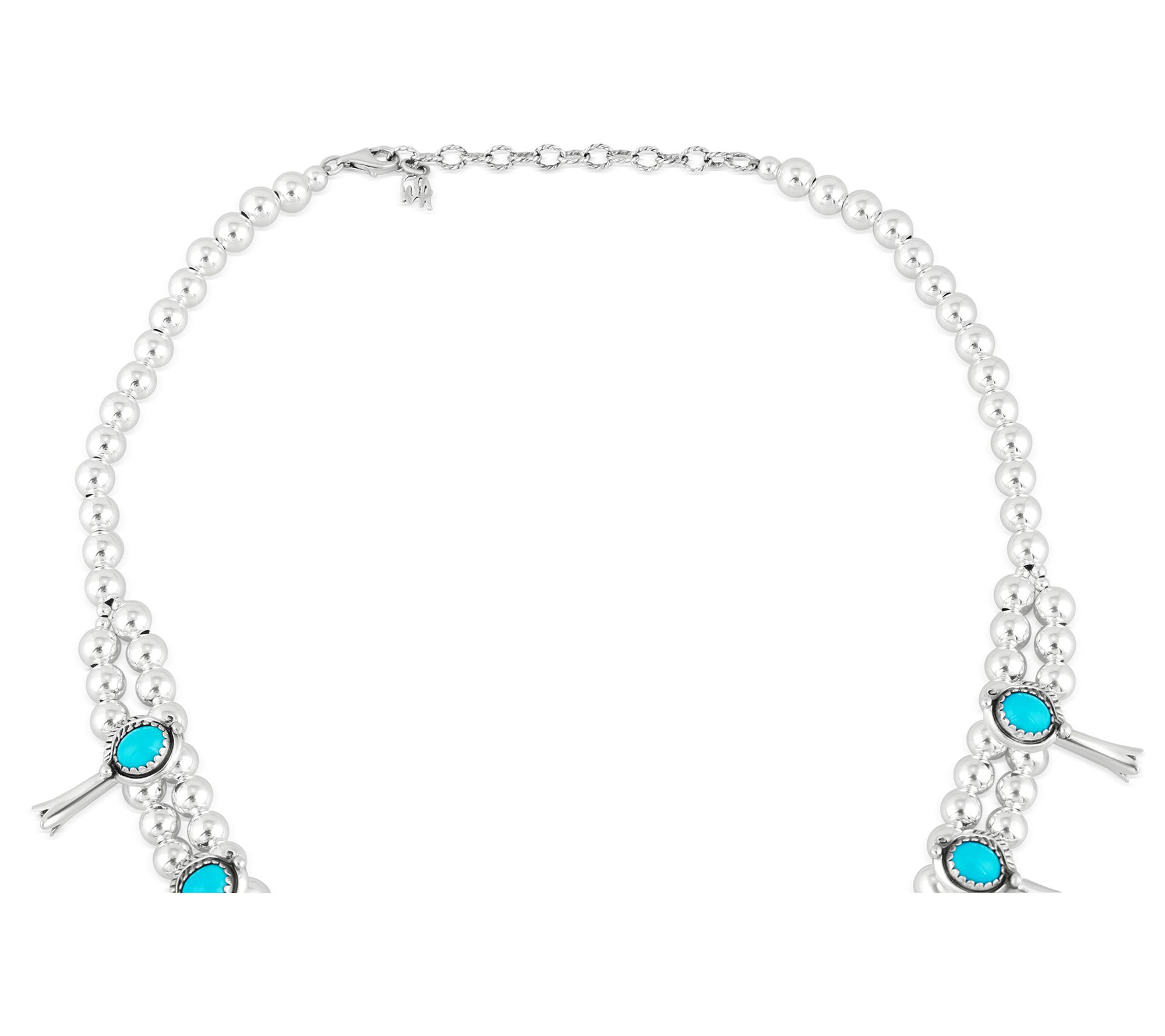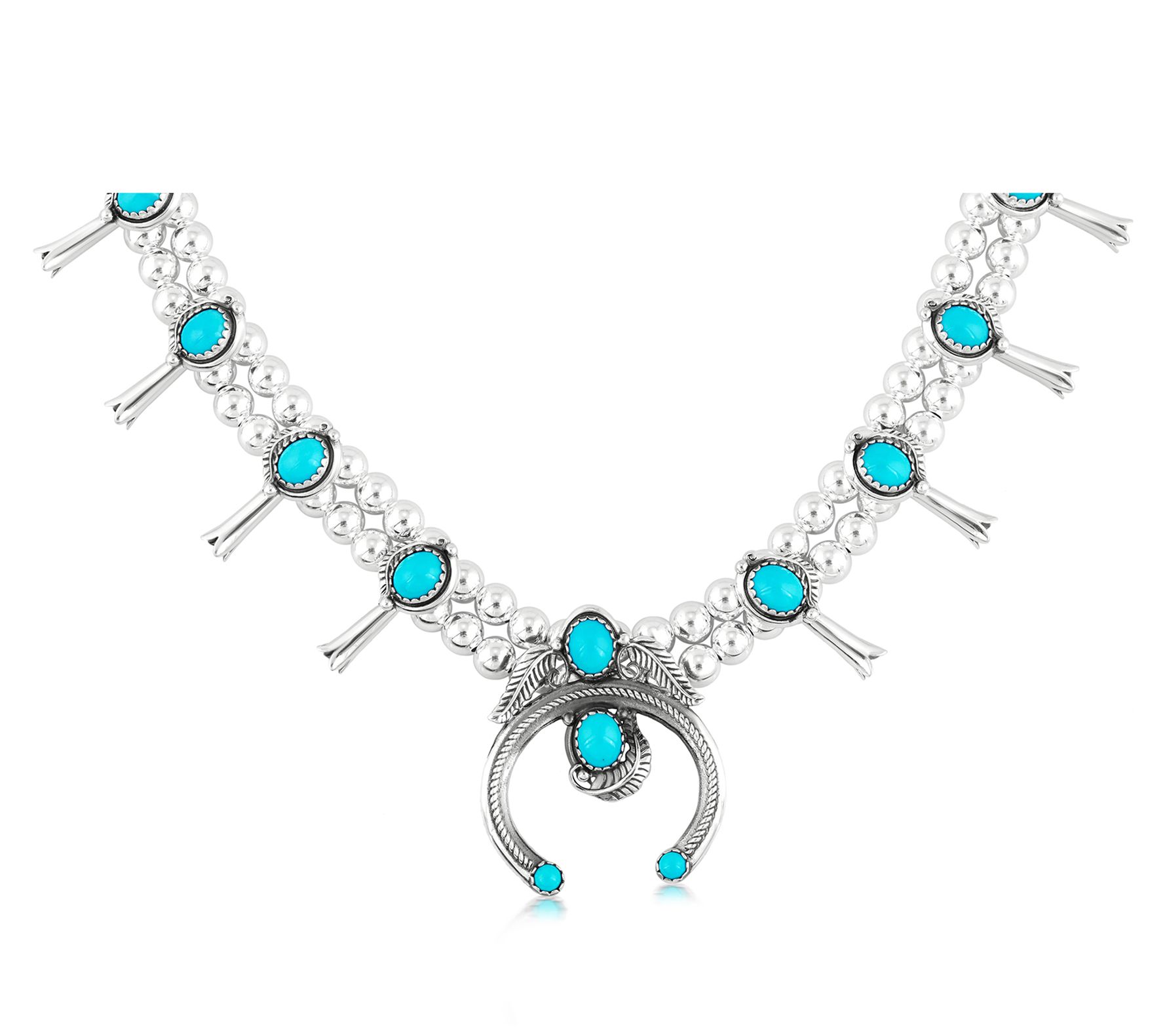 Necklace with a double strand of silver beads and eight oval prong-set turquoise cabochons set in squash blossoms; a center naja accented with feathers, rope texture, and turquoise cabochons; oxidized finish