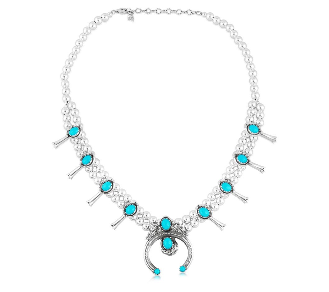 Featuring a bold and unique squash blossom design, this turquoise gemstone necklace adds head-turning beauty to any look. From American West Jewelry.