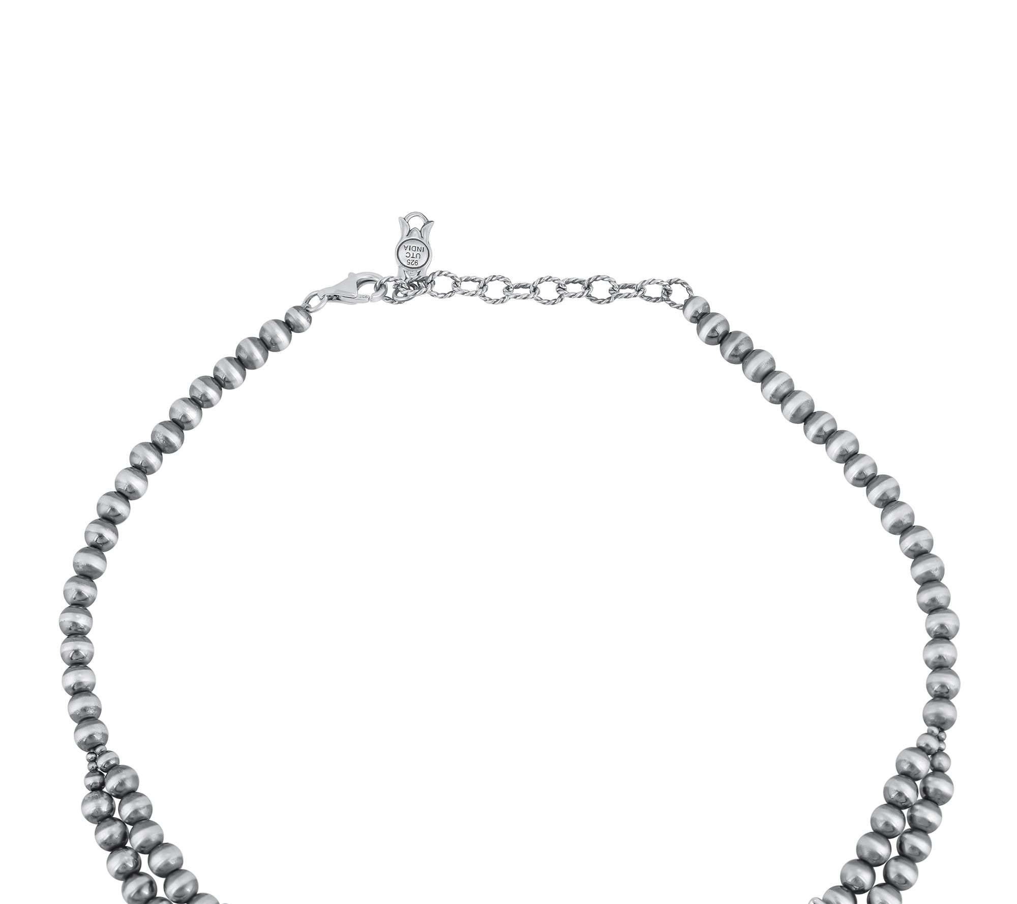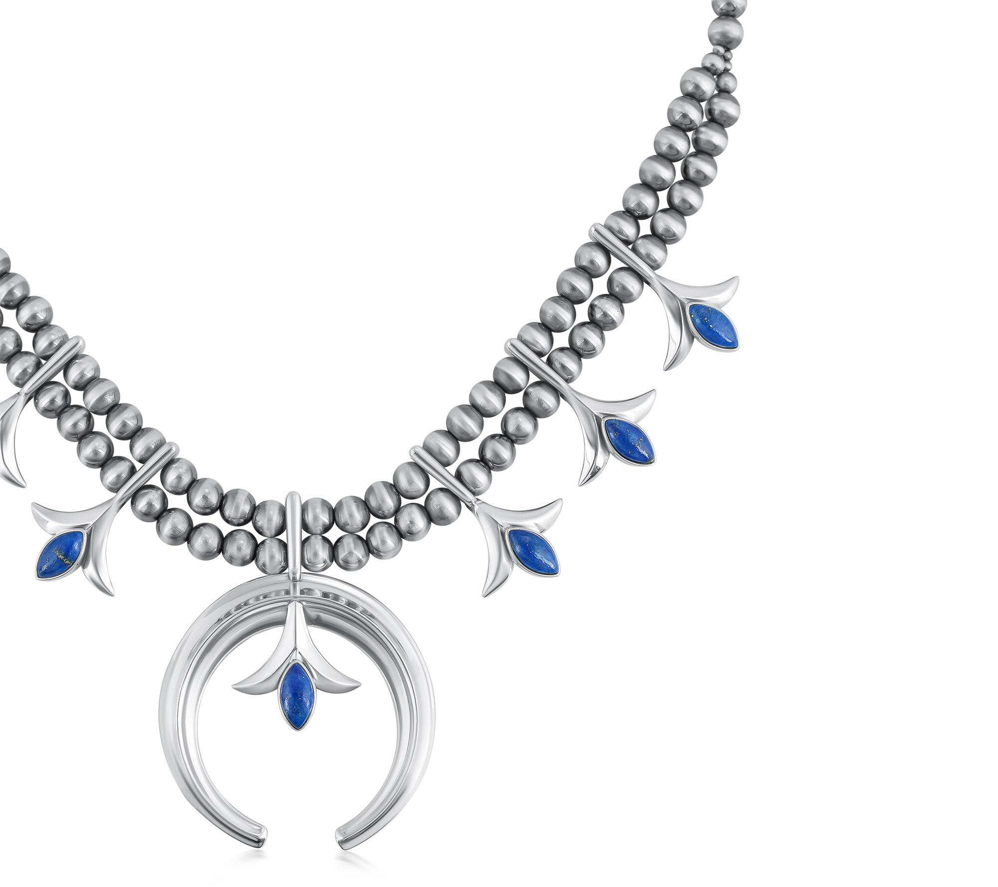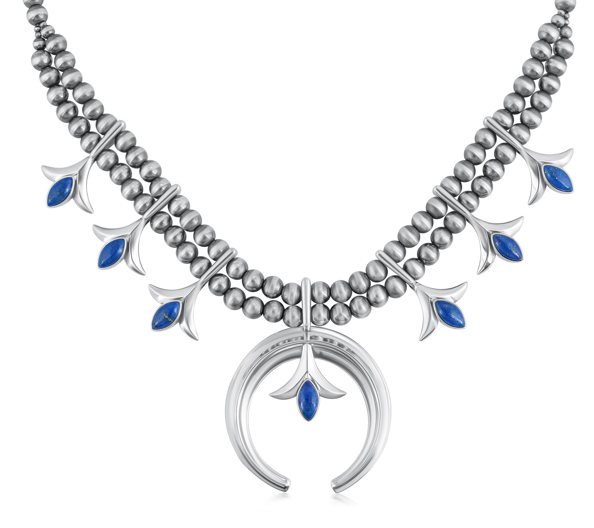Embrace the spirit of the Southwest with this American West Sterling Gemstone Squash Blossom Necklace, a piece that tells a story of heritage and craftsmanship. Featuring six squash blossom stations and a striking Naja centerpiece, this necklace is beautifully adorned with blossom accents and a front double row of striped beads that gracefully transitions to a single row. Choose between denim lapis or rhodonite to match your style, each bezel set to perfection. From American West Jewelry.