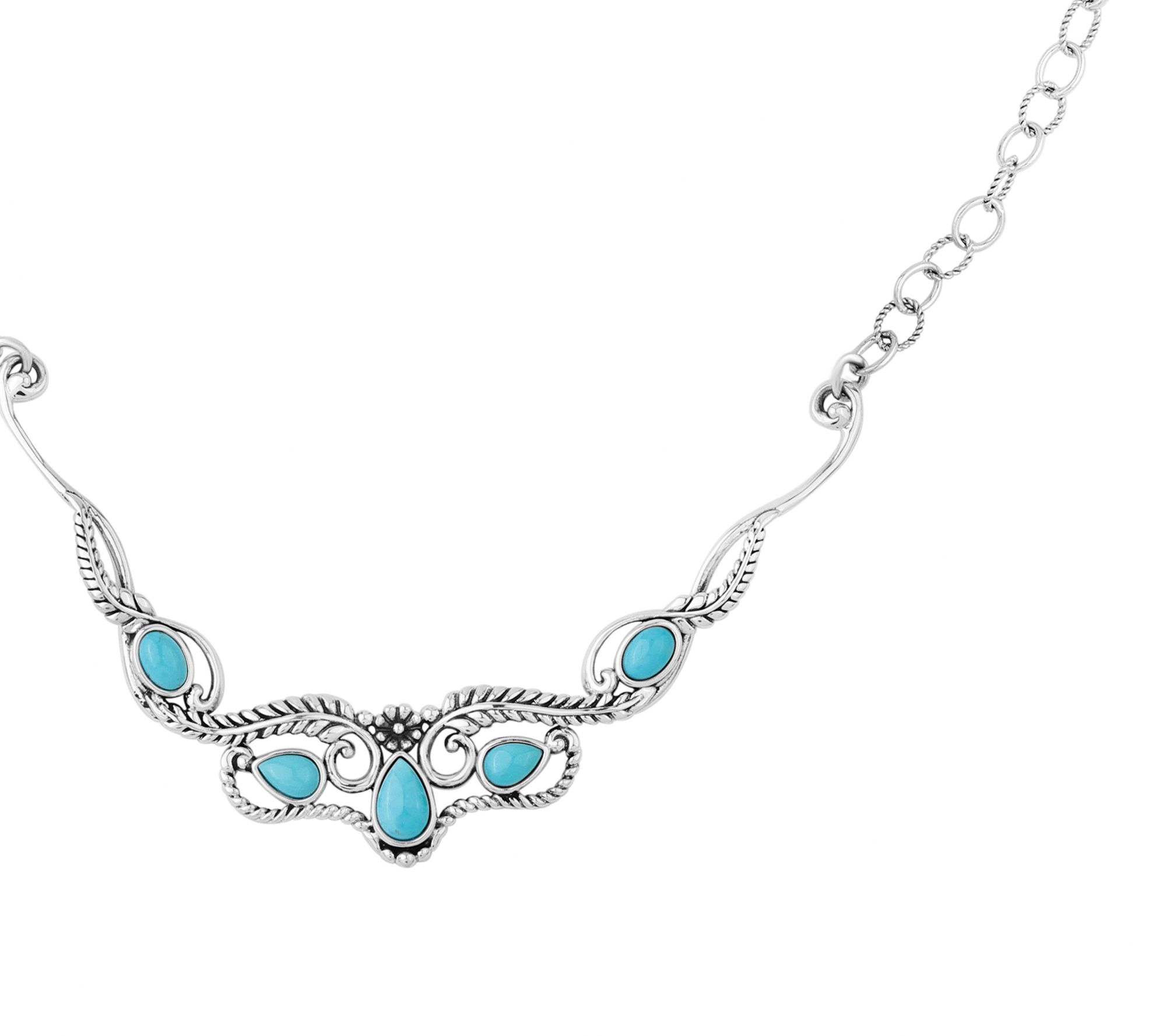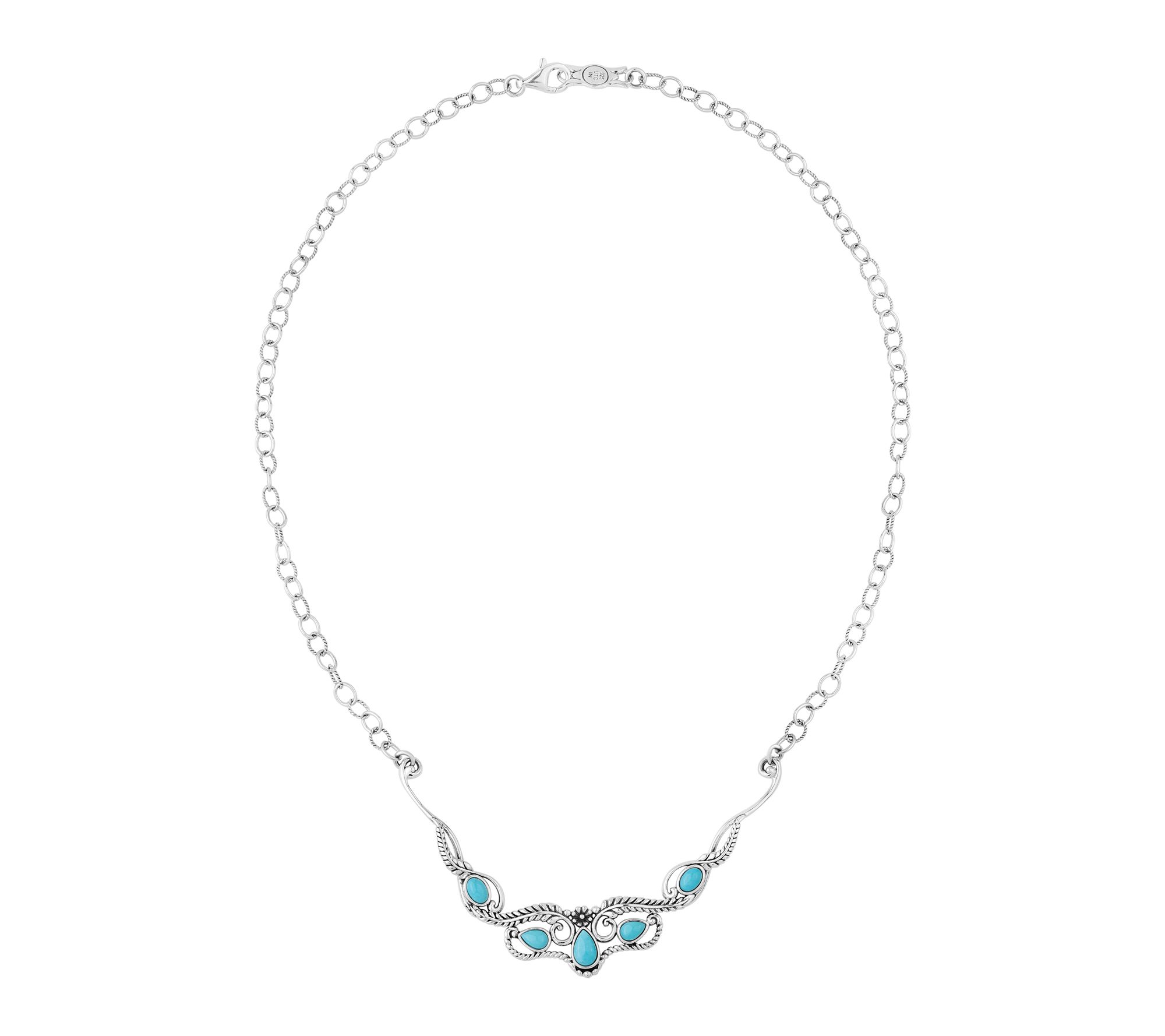 Drape your neckline in Southwest artistry with this sterling silver necklace, featuring glossy Kingman turquoise cabochons and leaf, rope, and swirl accents. Its intricate plaque makes a striking statement for casual days, nights out, or whenever you want a touch of elegance inspired by American West traditions. From American West Jewelry.