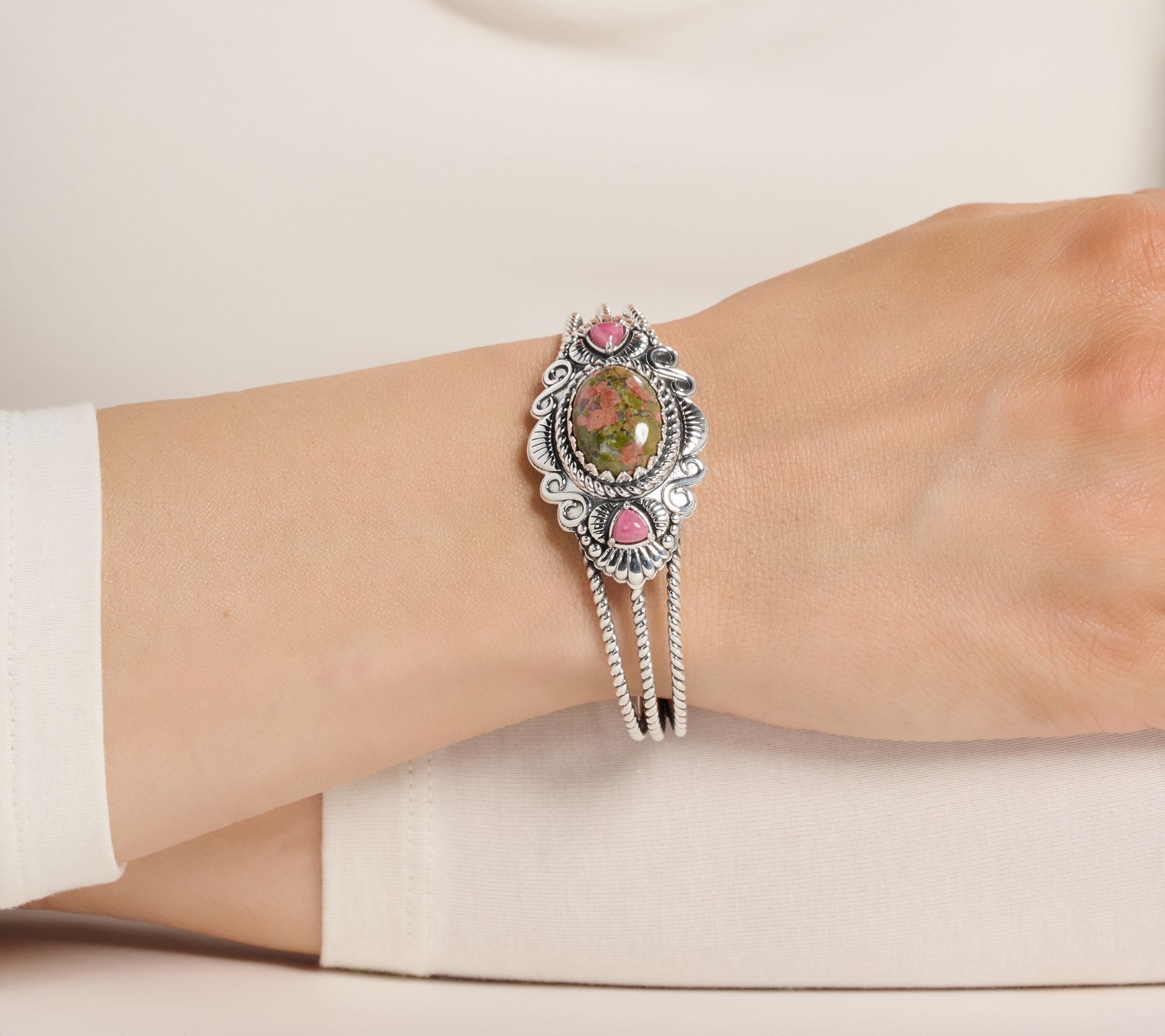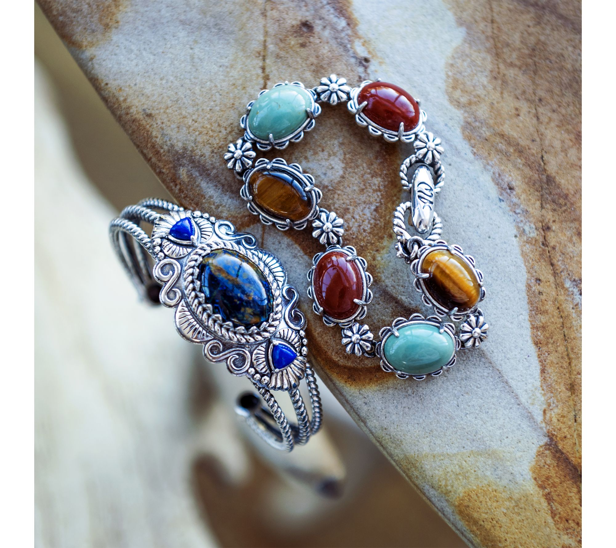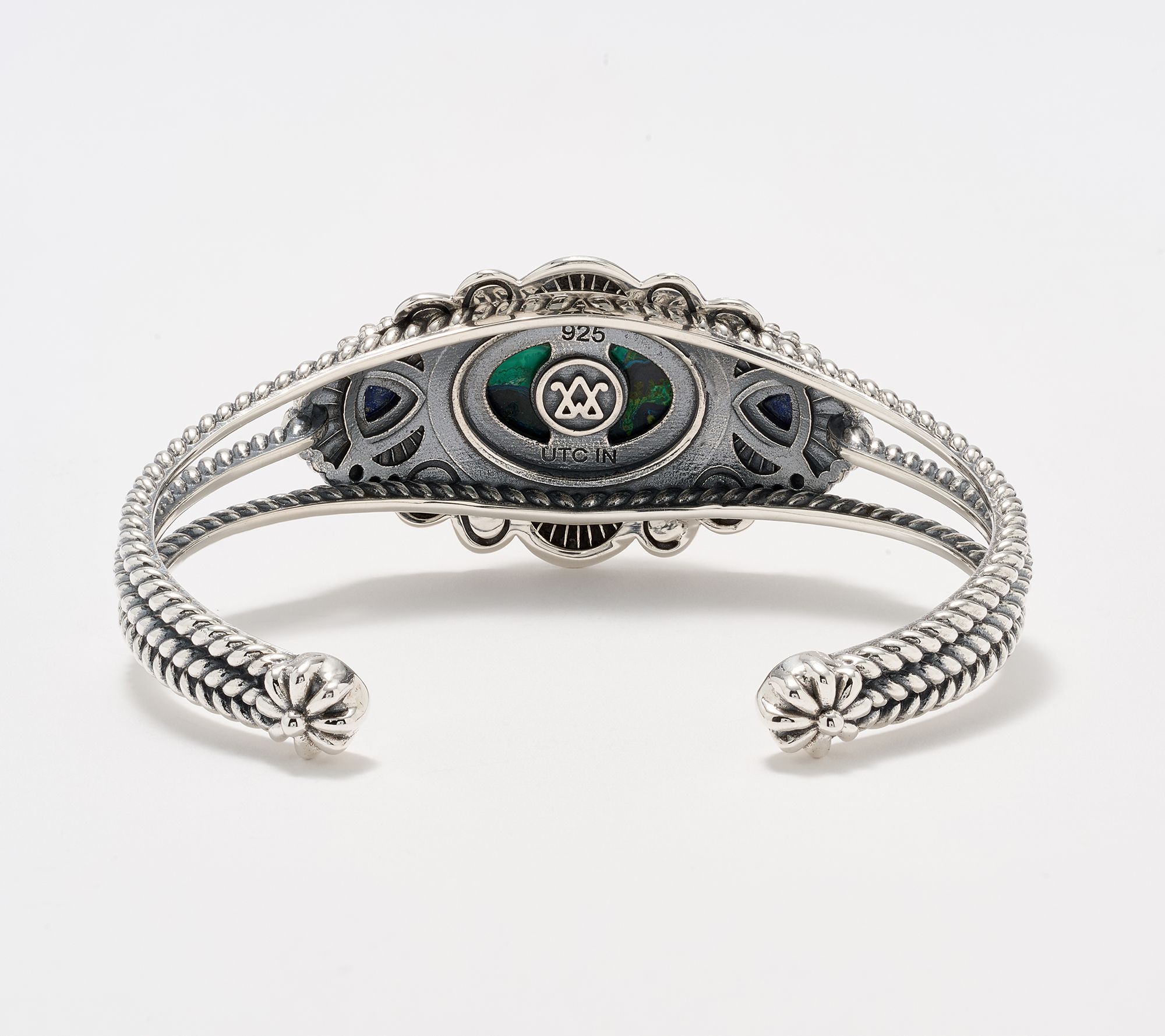 Set your sights on standout color with this sterling silver cuff bracelet, highlighting an oval gemstone cabochon at the center framed by rope detailing and a silver-etched border. Trillion-cut gemstones and a triple-row rope shoulder design offer a modern touch, making this piece a striking addition to both everyday outfits and special moments. From American West Jewelry.