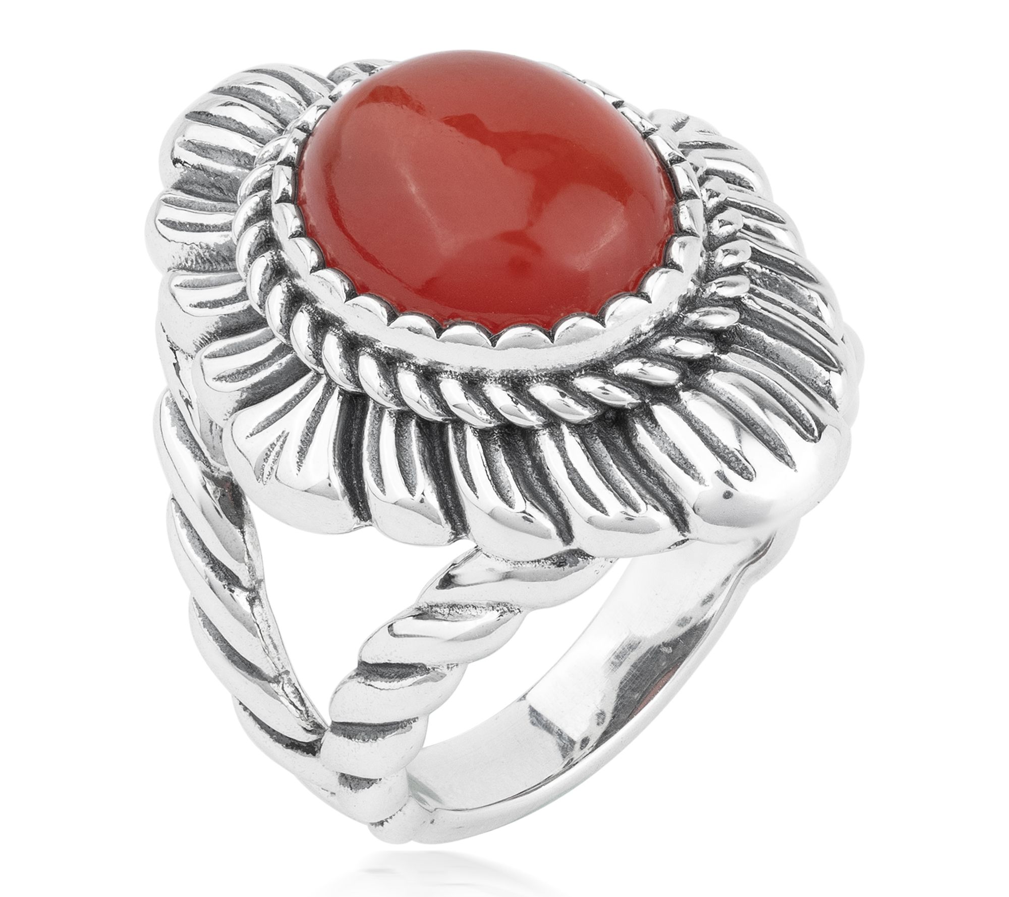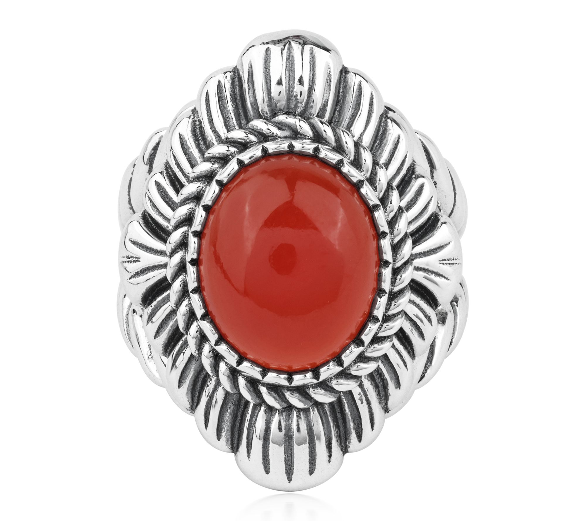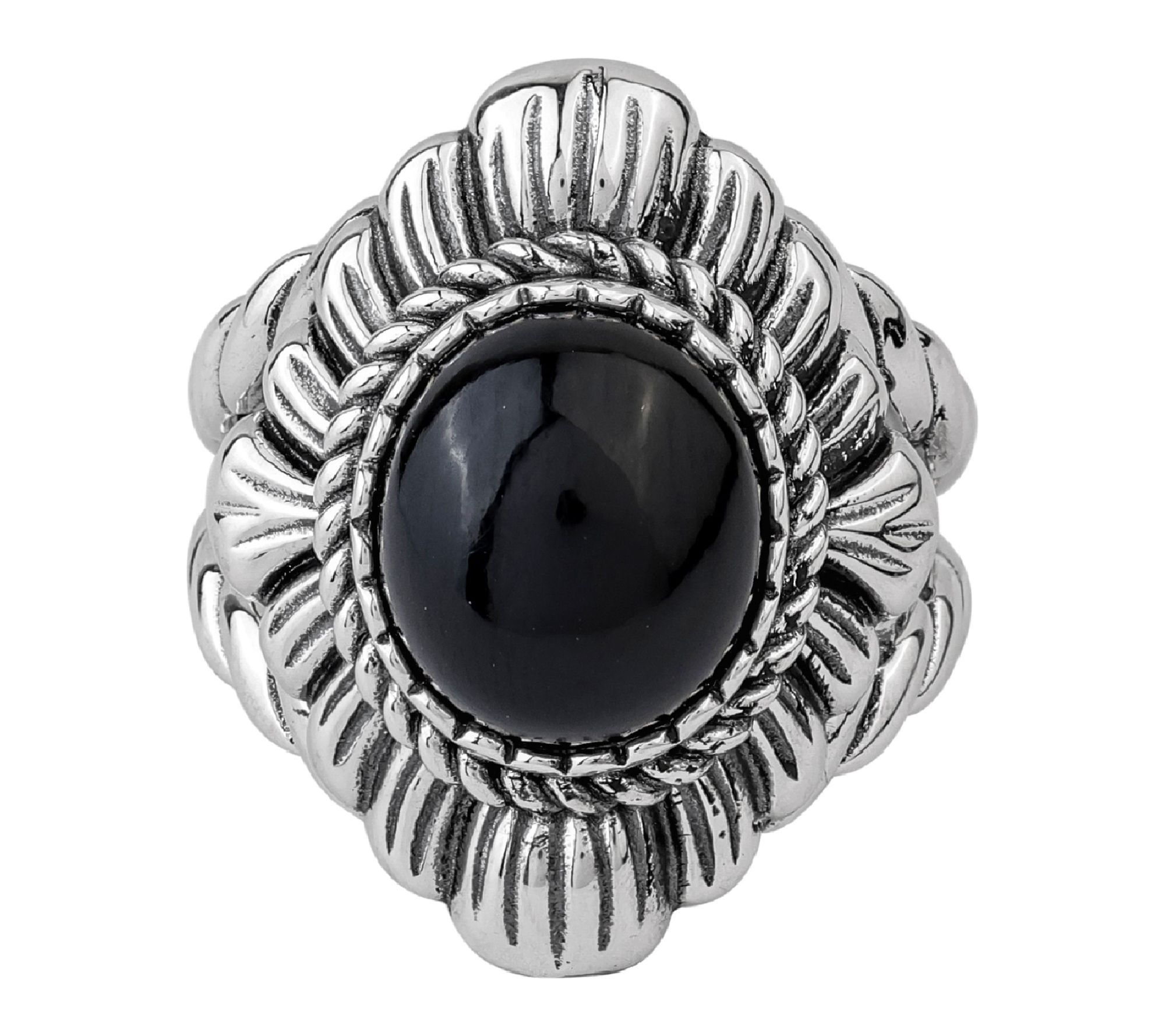 Let your signature style shine with this stunning ring -- an eye-catching oval gemstone sits cradled in an intricately detailed rope and scallop design, creating a look that transitions beautifully from brunch with friends to an elegant evening out. Stack it with your favorite bands or make it the solo centerpiece for an instant touch of southwestern charm. From American West Jewelry.
